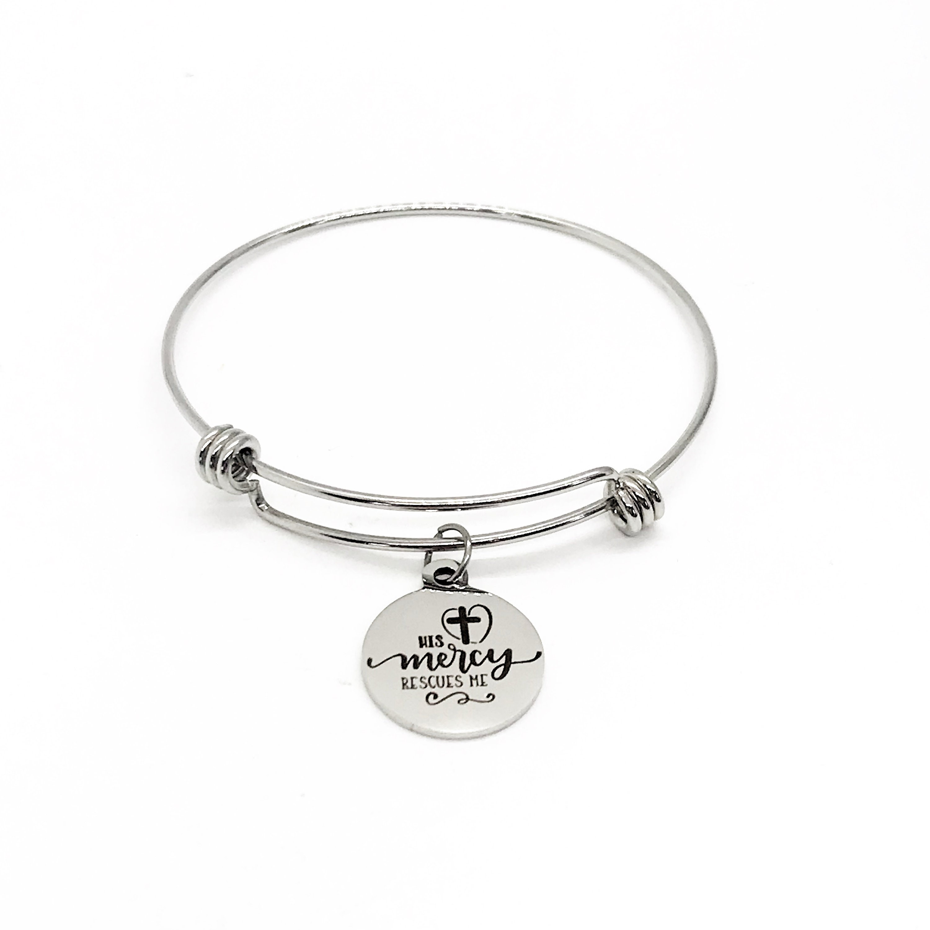 This is a beautiful bangle bracelet with a laser engraved stainless steel charm that has "His mercy rescues me" on it