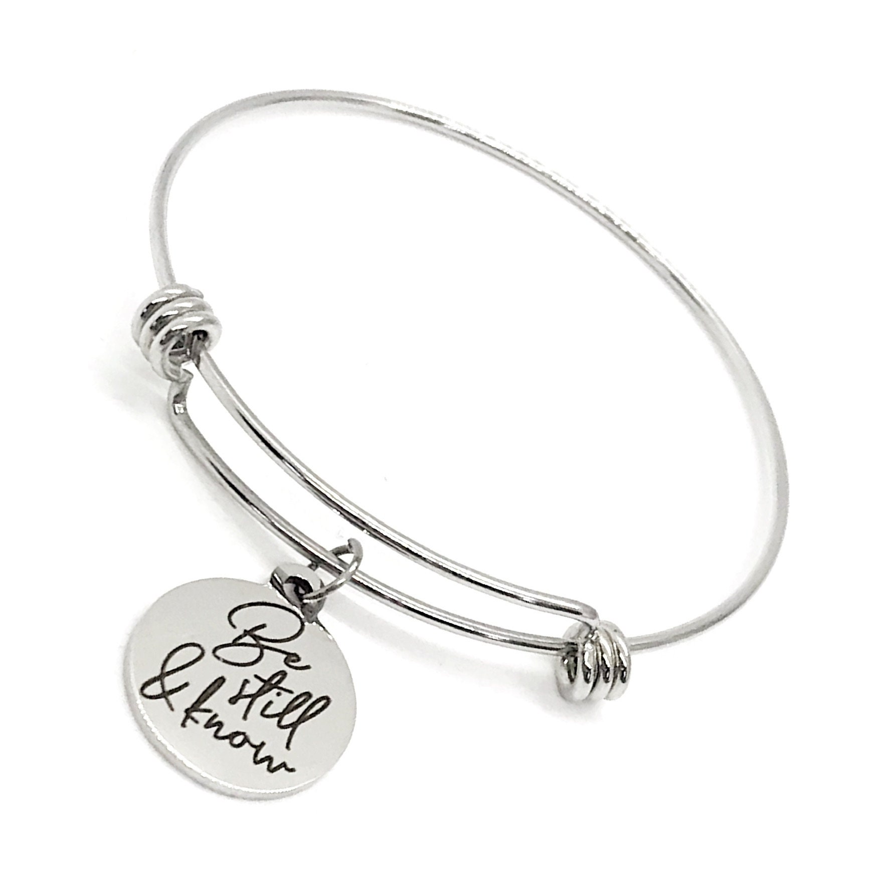 This is a beautiful bangle bracelet with a laser engraved stainless steel charm that has "Be still and know" from Psalm 46:10 on it