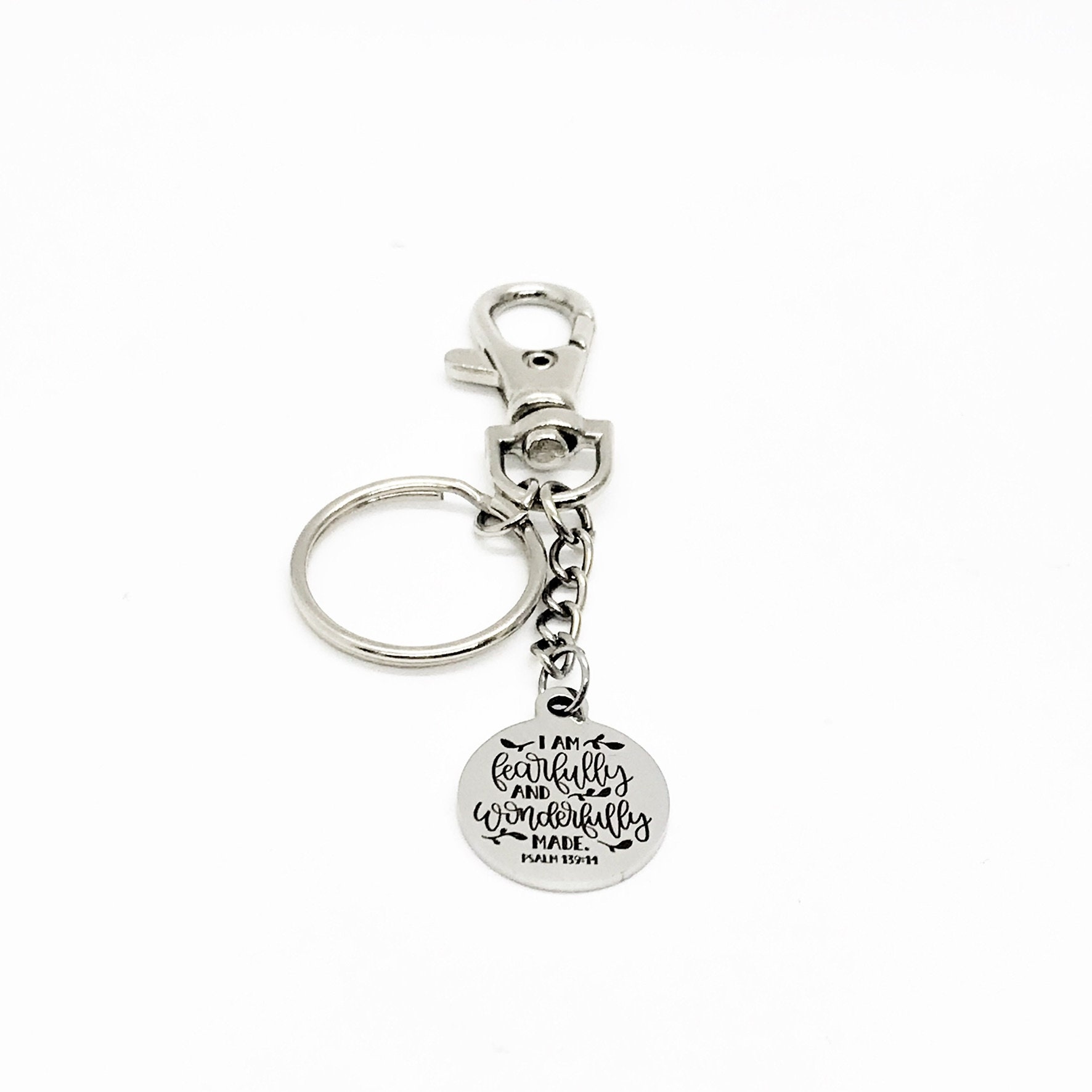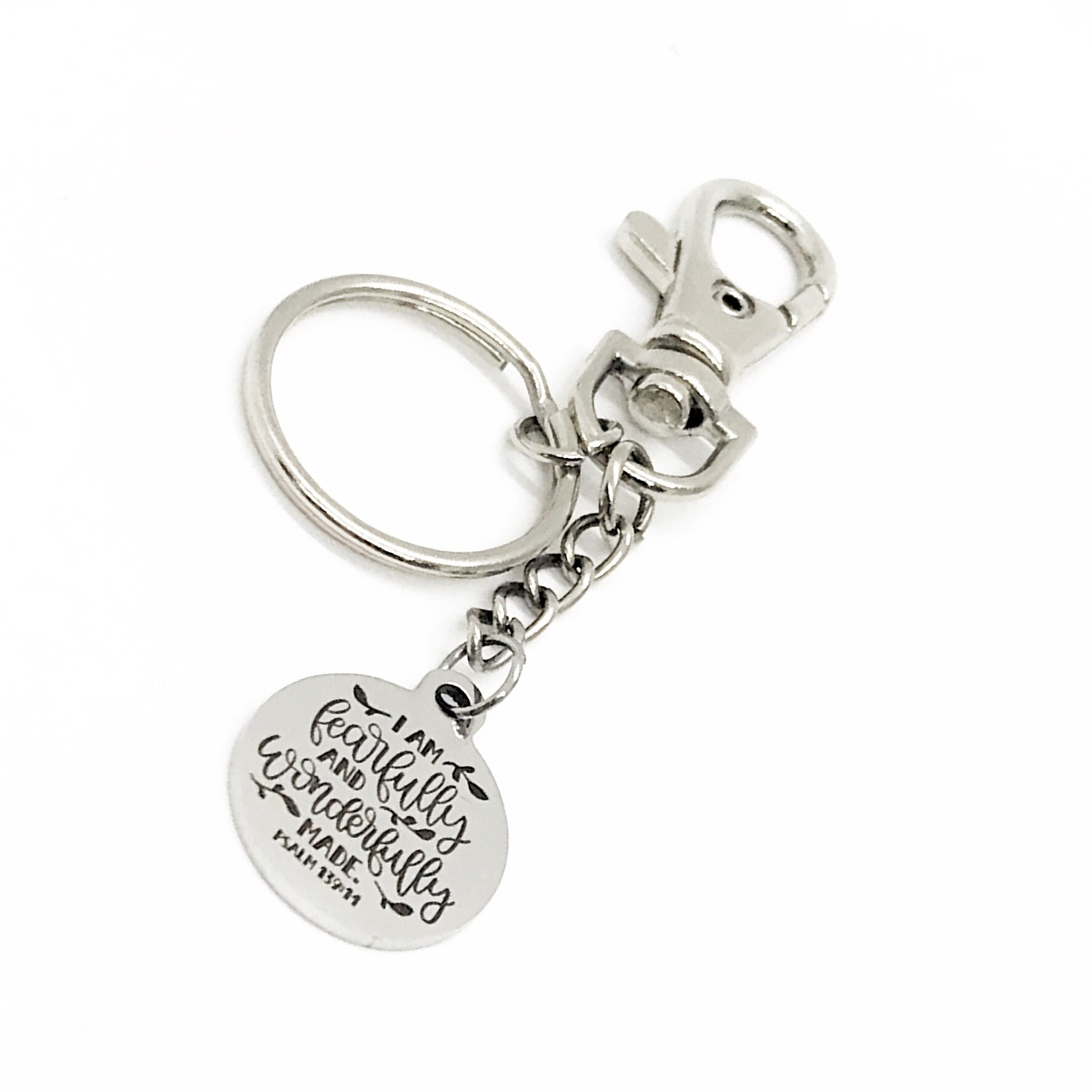 This is a great bible verse keychain gift . The keyring can be clipped onto your bag to make it easy to access without digging to the bottom of the bag. It has a stainless steel laser engraved charm with “I am fearfully and wonderfully made” from Psalms 139:14 on it.