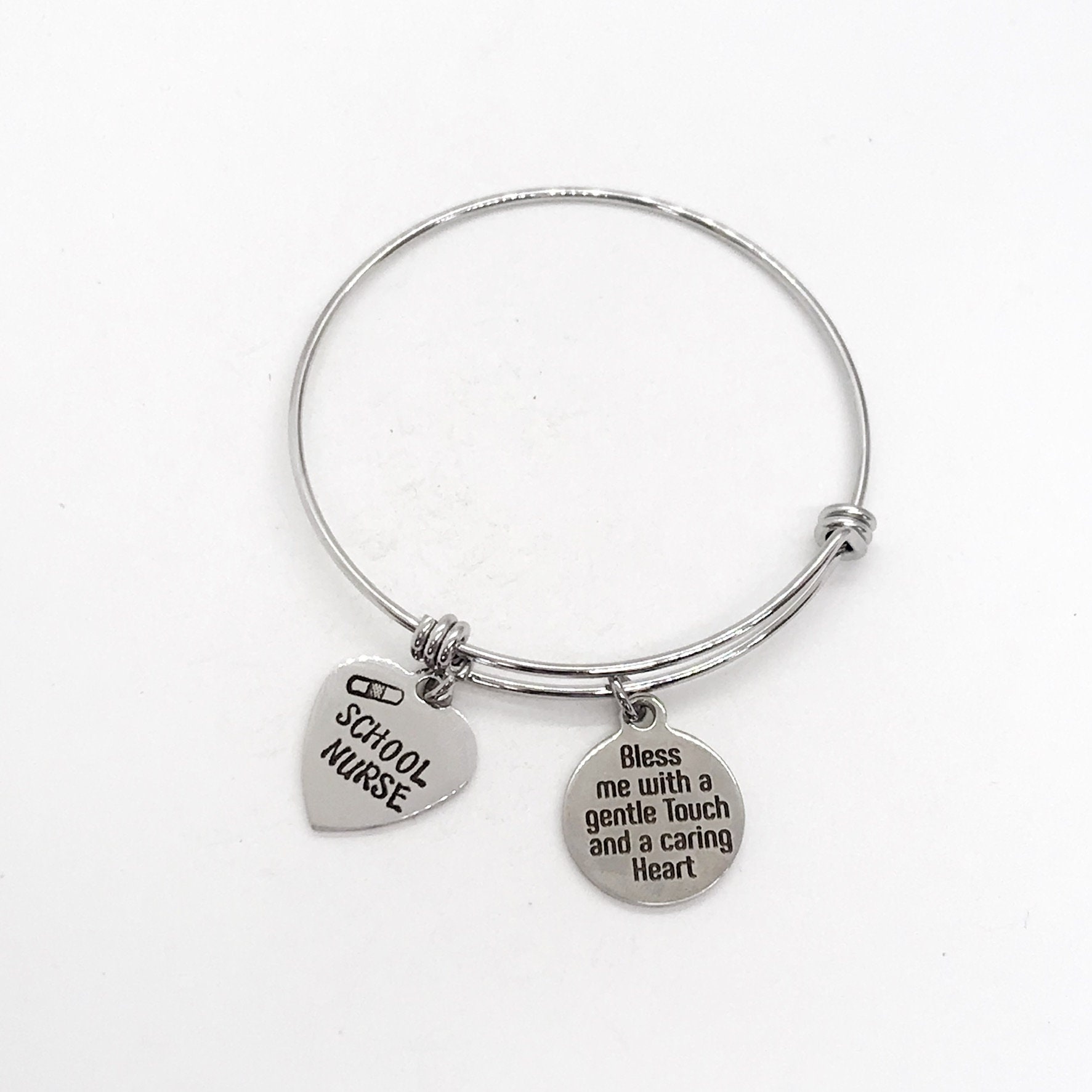 This stacking bangle bracelet is a beautiful gift for a school nurse. It has a stainless steel laser engraved charm that says “Bless me with a gentle touch and a caring heart" on it.