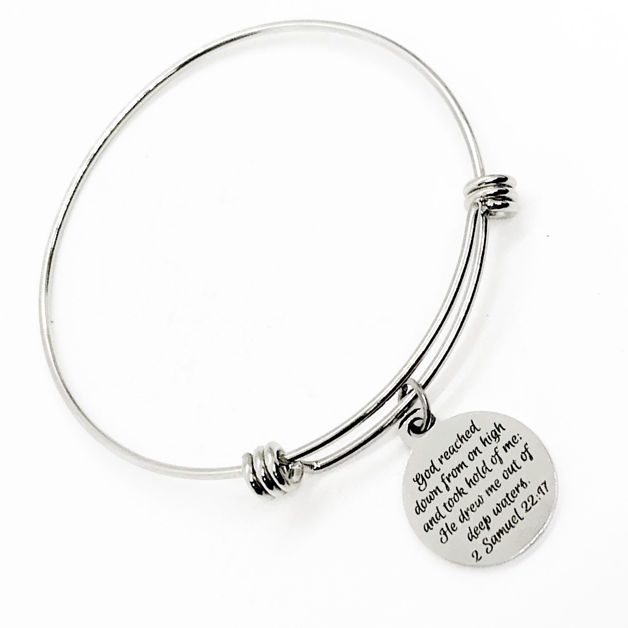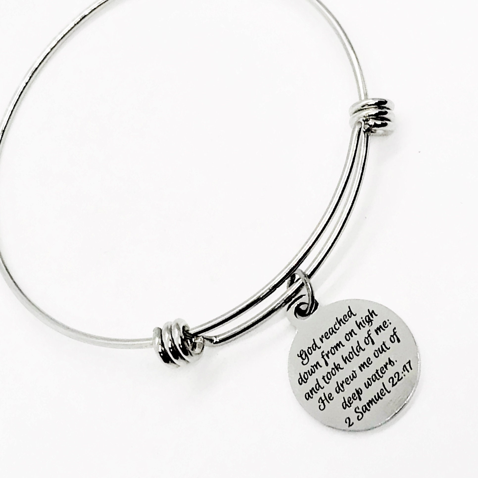 This is a beautiful bangle bracelet with a laser engraved stainless steel charm that has "God reached down from on high and took hold of me; He drew me out of deep waters" from 2 Samuel 22:47 on it.