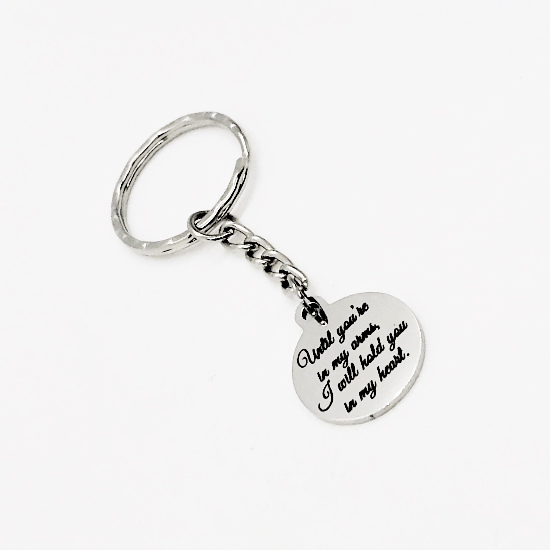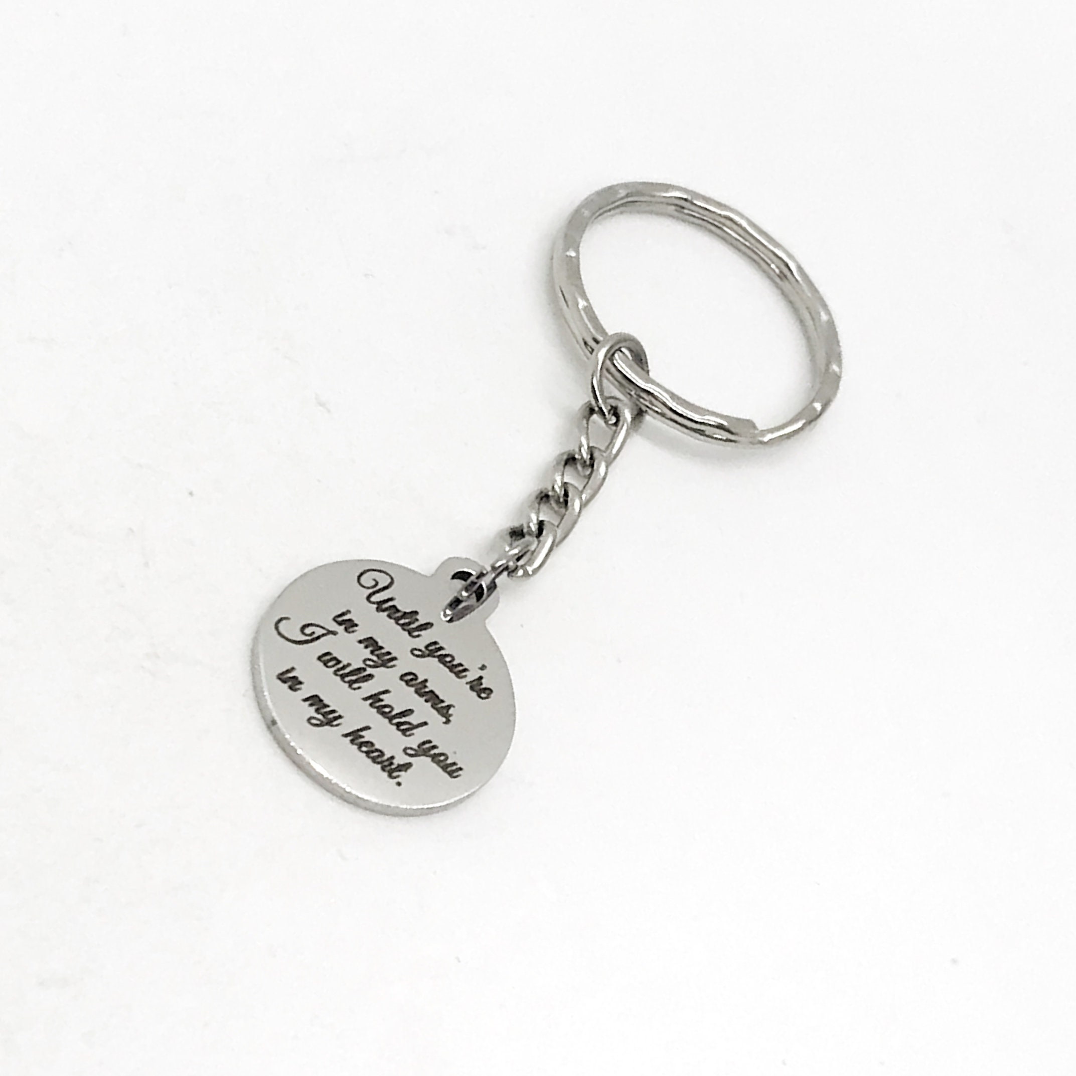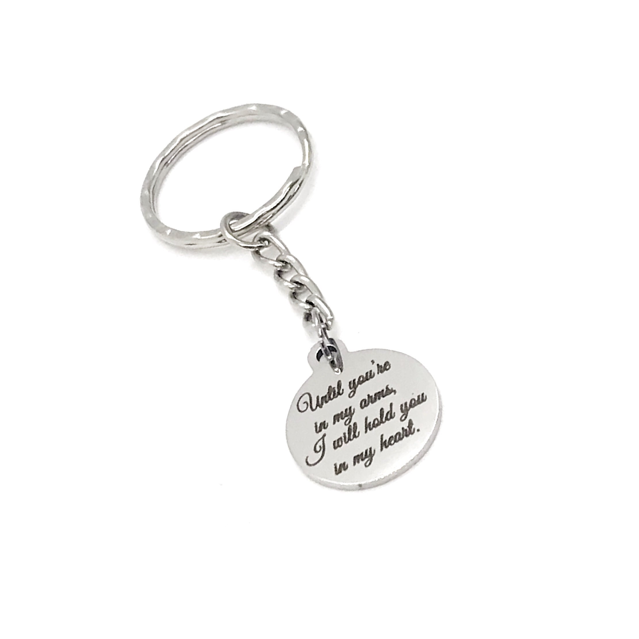 This is a great memorial keychain. It has a stainless steel laser engraved charm with “Until you’re in my arms, I will hold you in my heart” on it. The charm measures approx. 3/4 inch across.