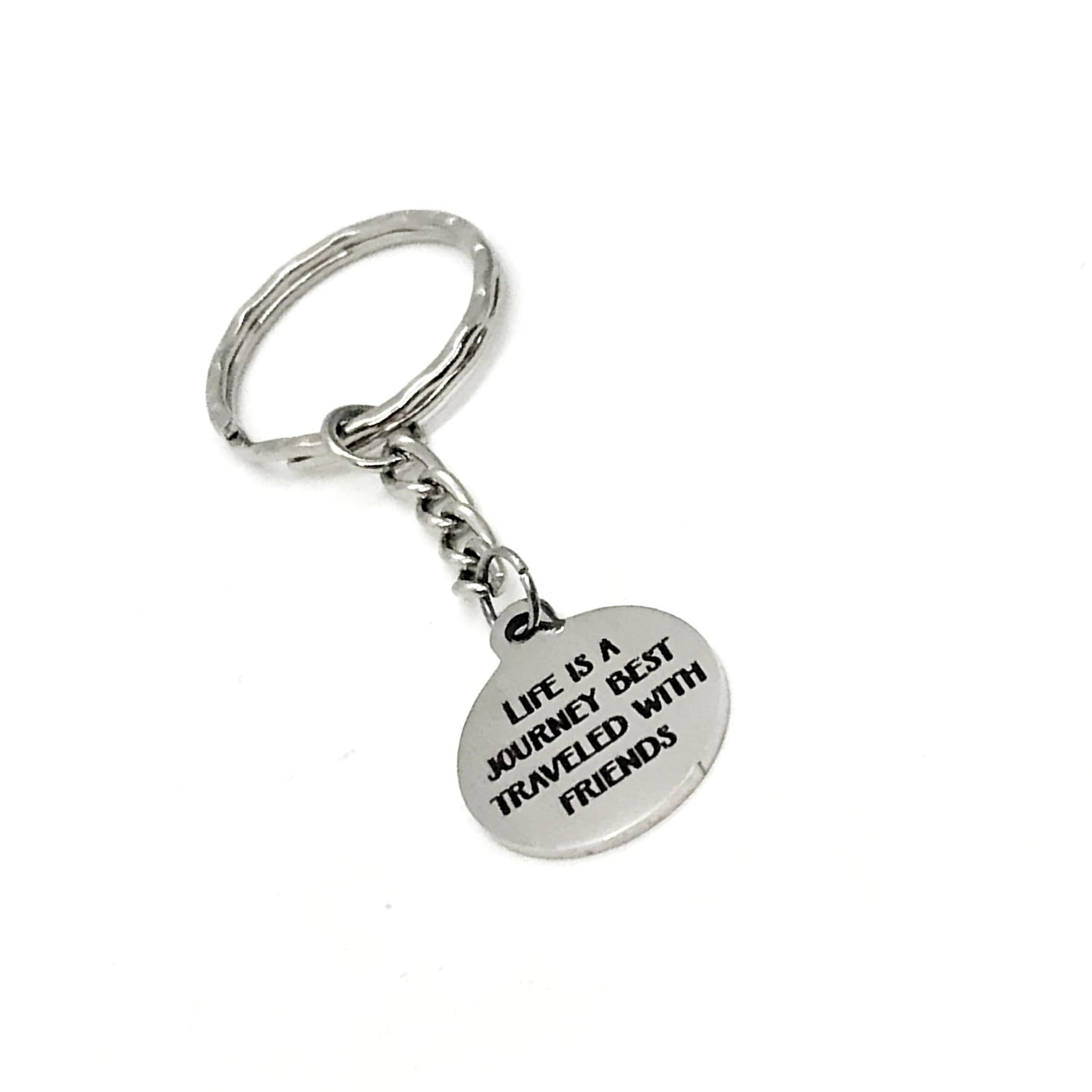 This is a great keychain gift. It has a stainless steel laser engraved charm with “Life is a journey best traveled with friends” on it. The charm measures approx. 3/4 inch across.
