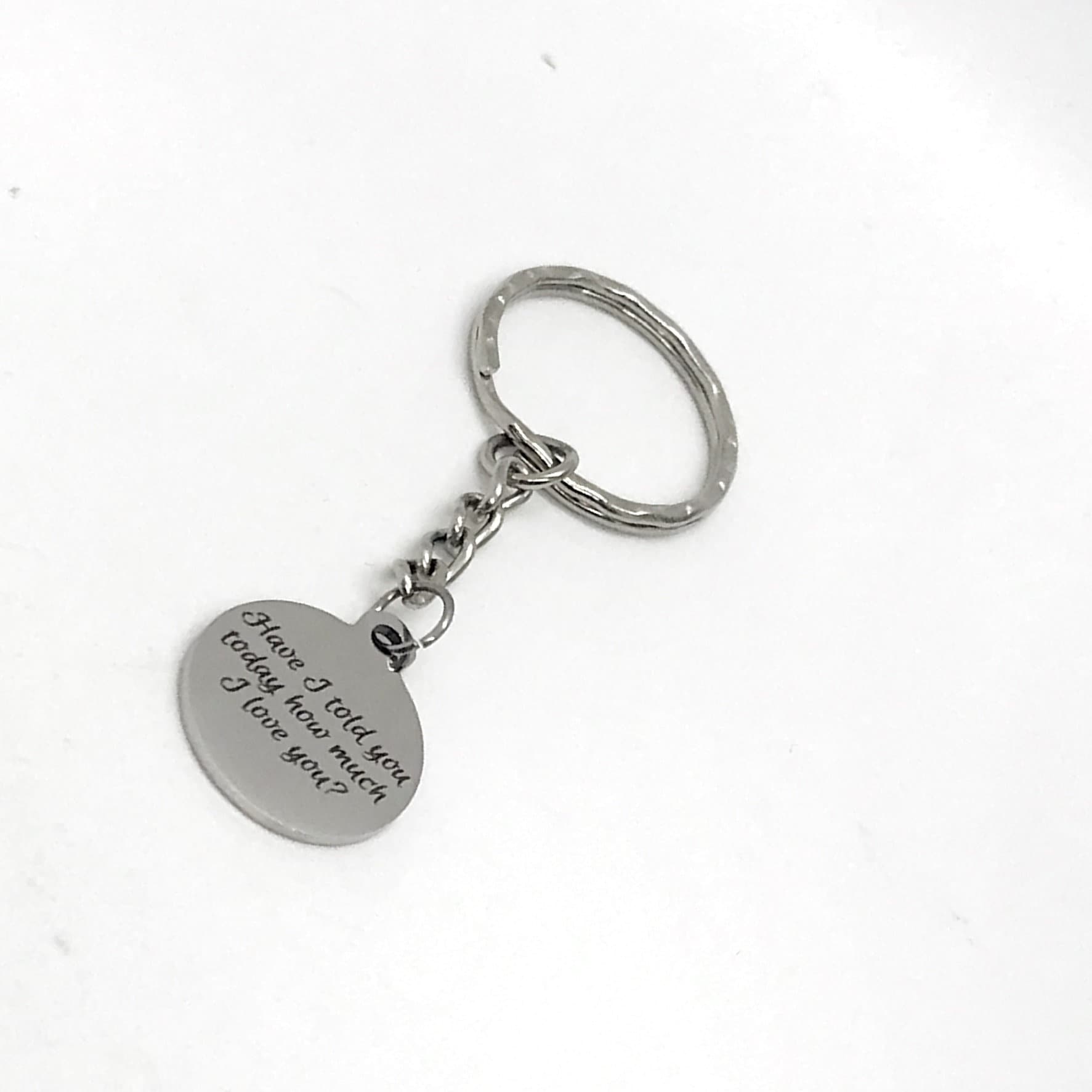 This is a great keychain gift. It has a stainless steel laser engraved charm with “Have I told you today how much I love you?” on it. The charm measures approx. 3/4 inch across.