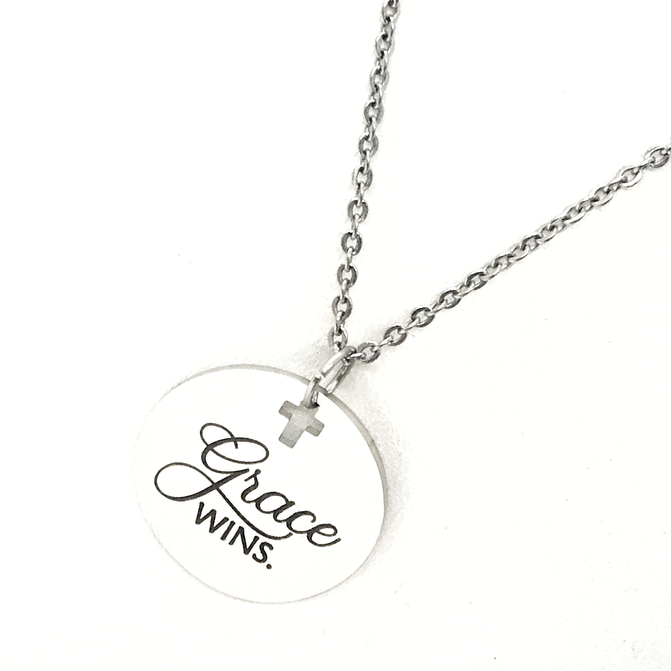 This beautiful necklace would make a wonderful gift. The pendant is a stainless steel laser engraved pendant that has “Grace Wins” on it.