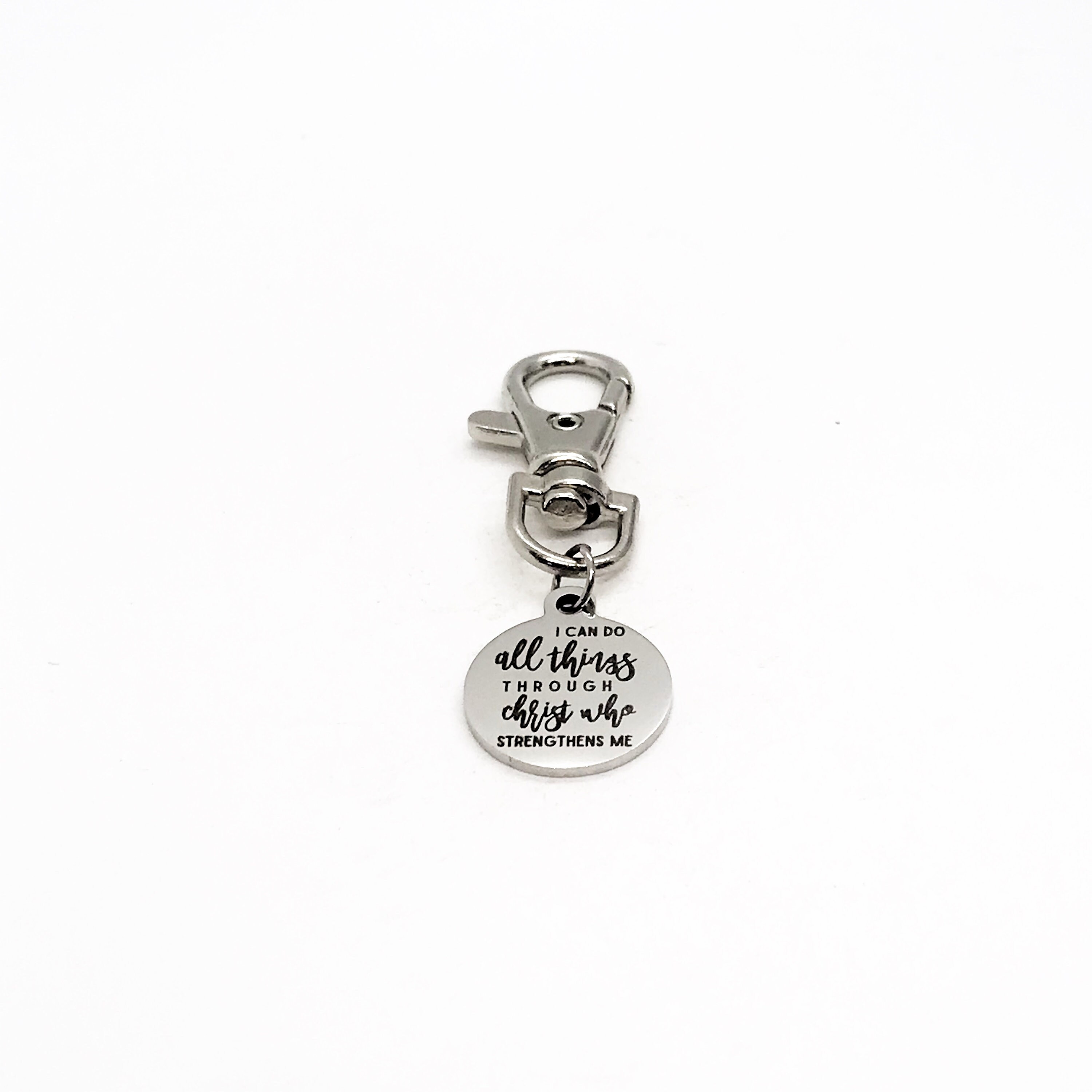 This is a great zipper pull or bag charm clip gift that would be a great gift. It would be a great charm to clip onto a tote, purse, sports bag, book bag or keychain. It has a engraved charm with “I can do all things through Christ who strengthens me” from Philippians 4:13 on it.