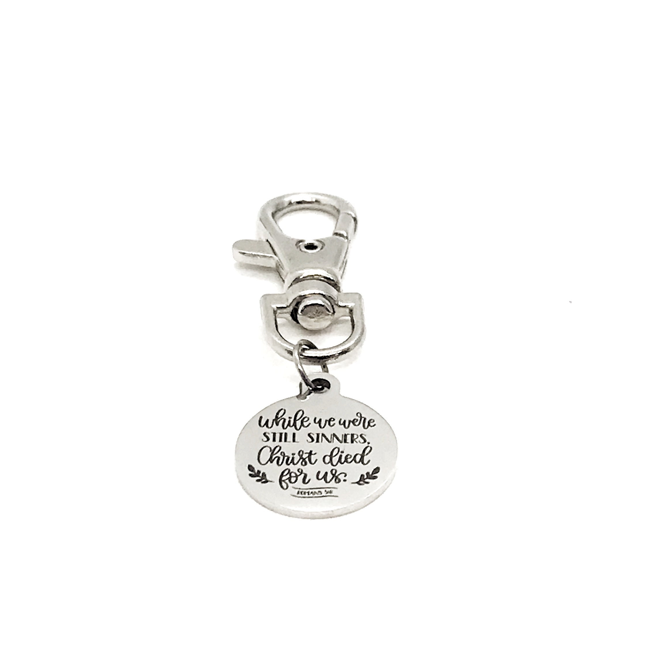 This is a great zipper pull or bag charm clip gift that would be a great gift. It would be a great charm to clip onto a tote, purse, sports bag, book bag or keychain. It has a engraved charm with “While we were still sinner, Christ died for us” from Romans 5:8 on it.