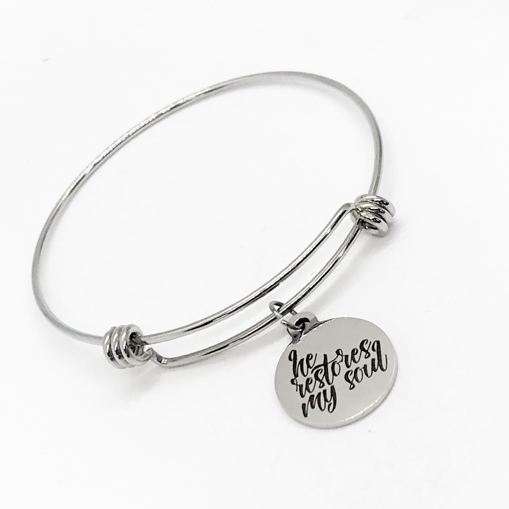 This is a beautiful bangle bracelet with a laser engraved stainless steel charm that has "He restores my soul" on it