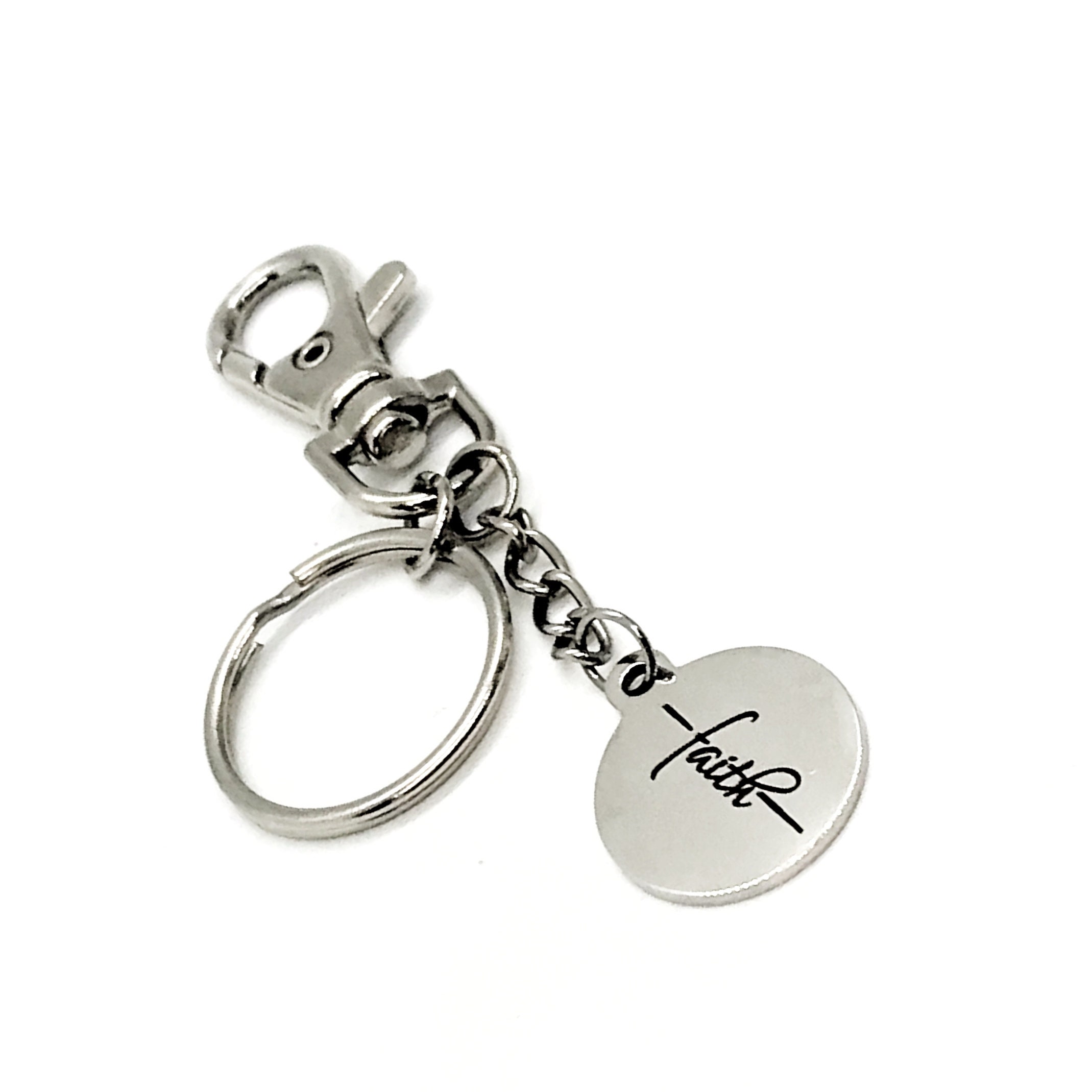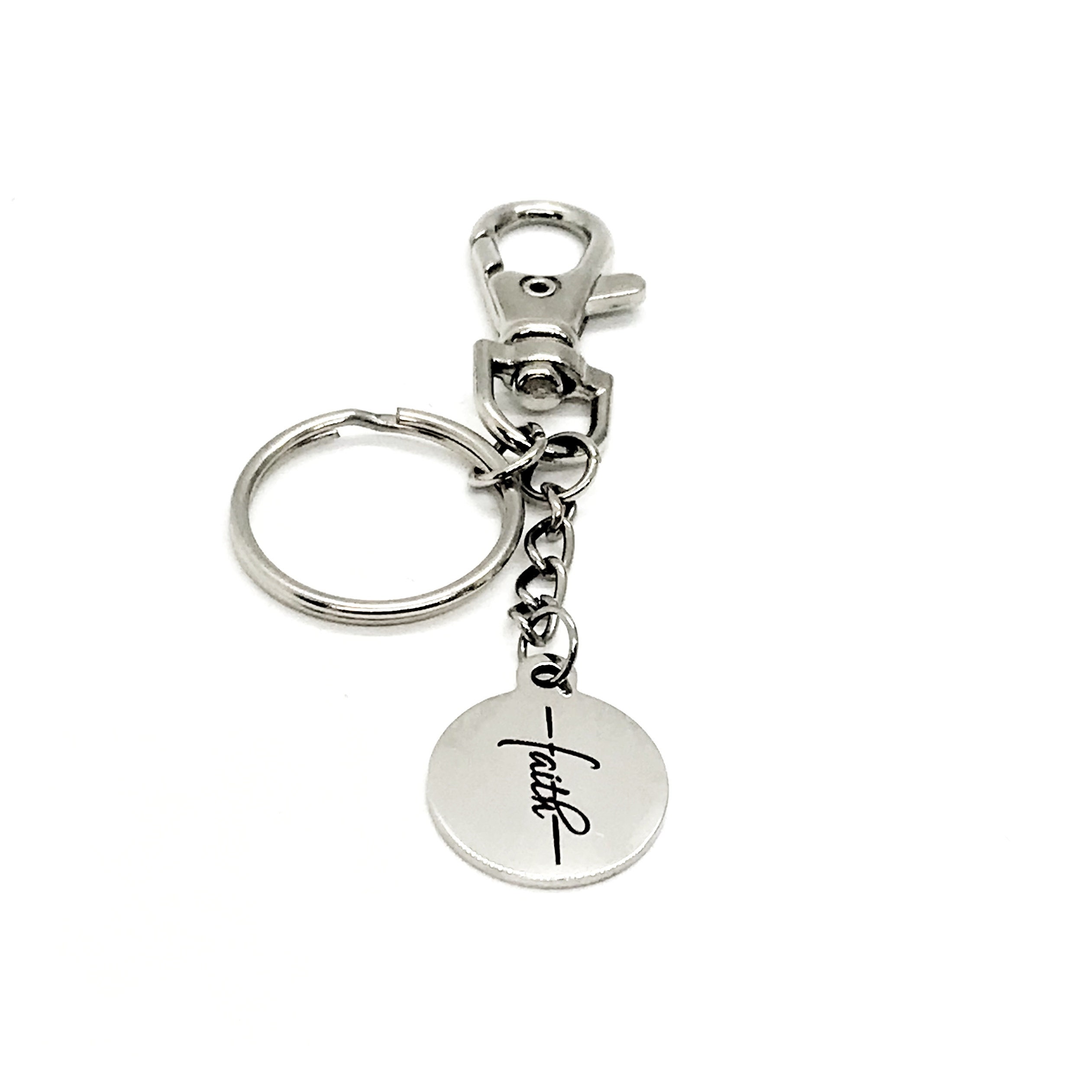 This is a clip-on keychain gift . The keyring can be clipped onto your bag to make it easy to access without digging to the bottom of the bag. It has a stainless steel laser engraved charm with “Faith” from on it.