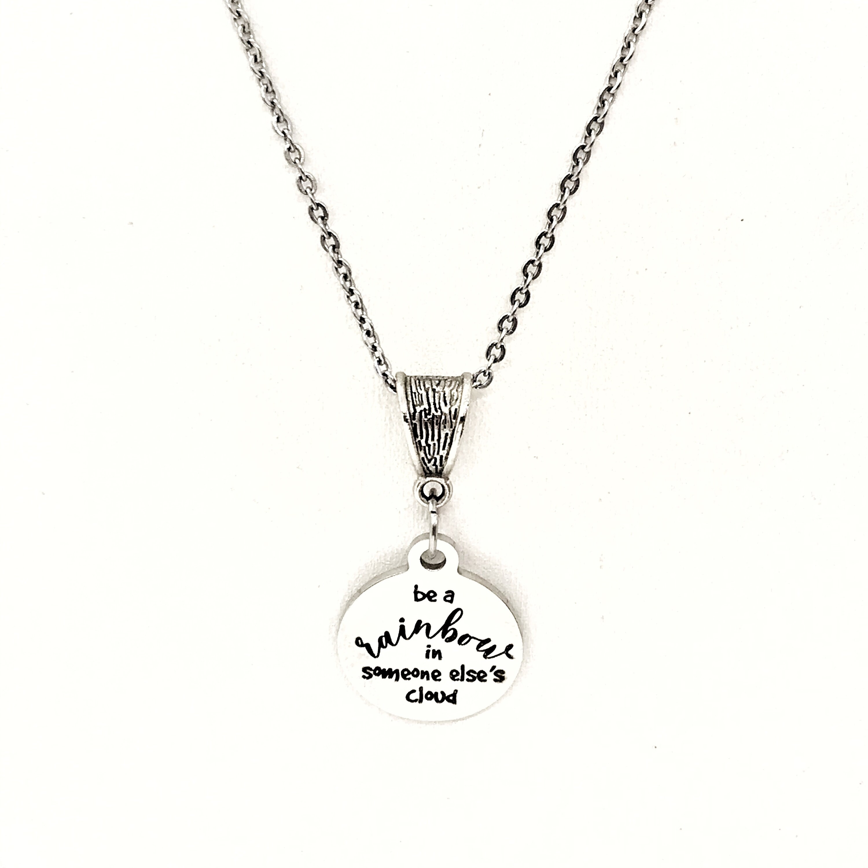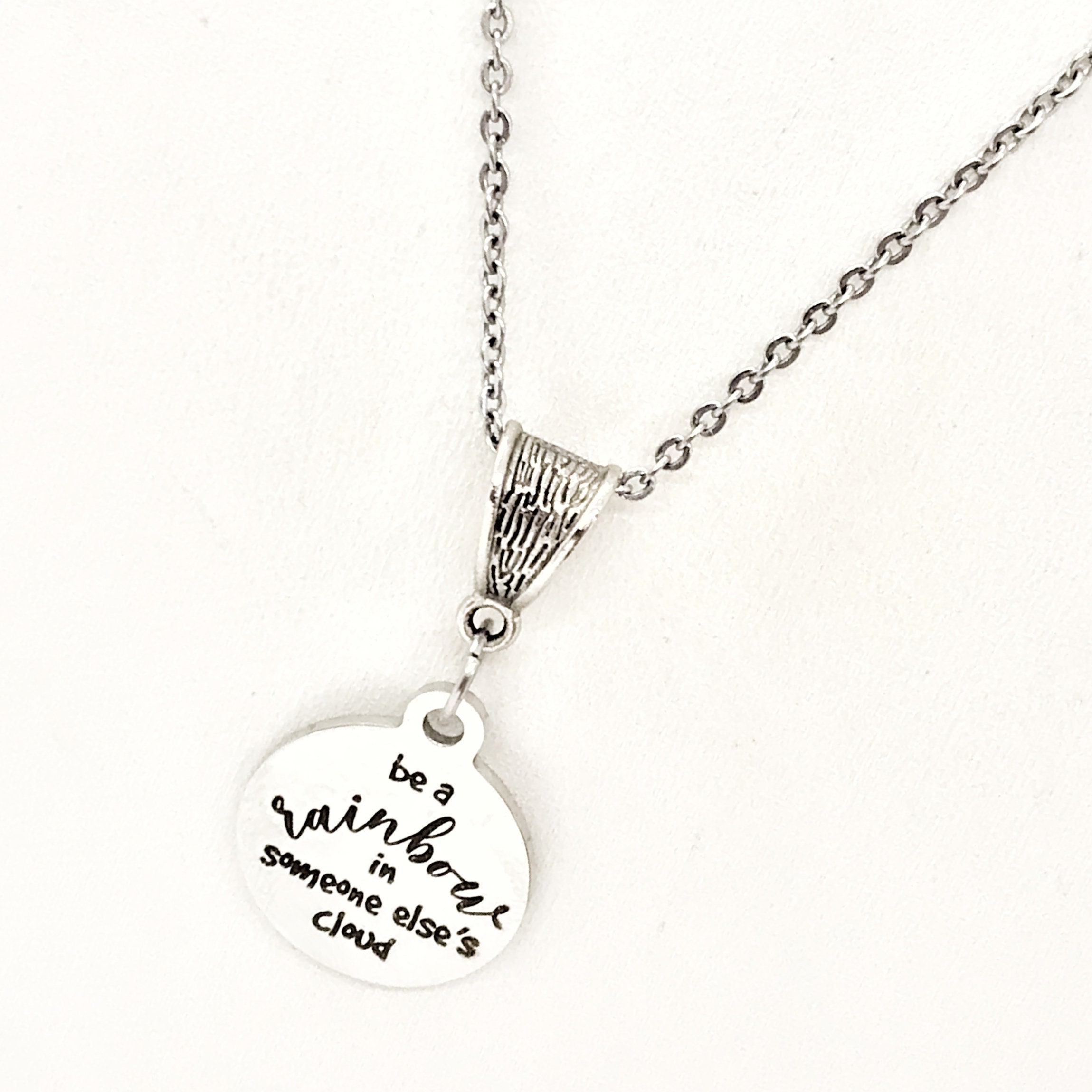 The is a beautiful jewelry piece that has a stainless steel laser engraved charm with the following on it “Be a rainbow in someone else’s cloud”.