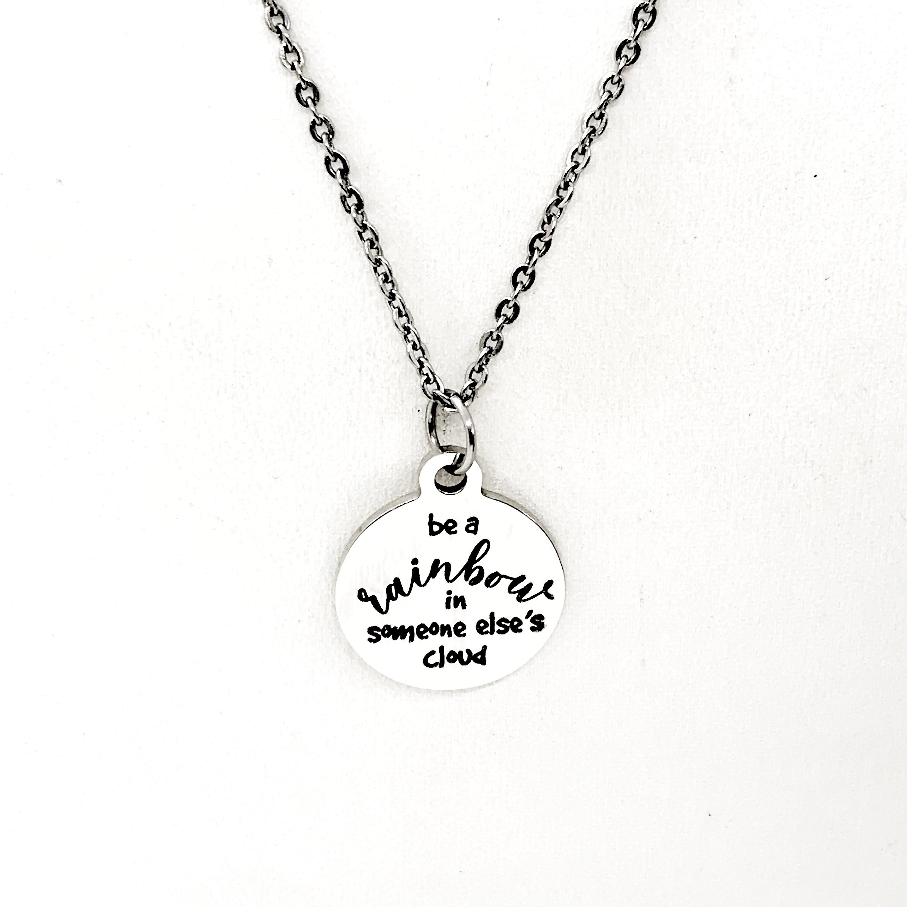 This is a stainless steel laser engraved pendant on a stainless steel chain. The pendant has "Be a rainbow in someone else’s cloud" on it. This pendant is available on your choice of 16, 18, 20, 22, 24, 26, 28 or 30 inch chain. The pendant is also available for individual purchase if you have another chain on which you would like to wear it.