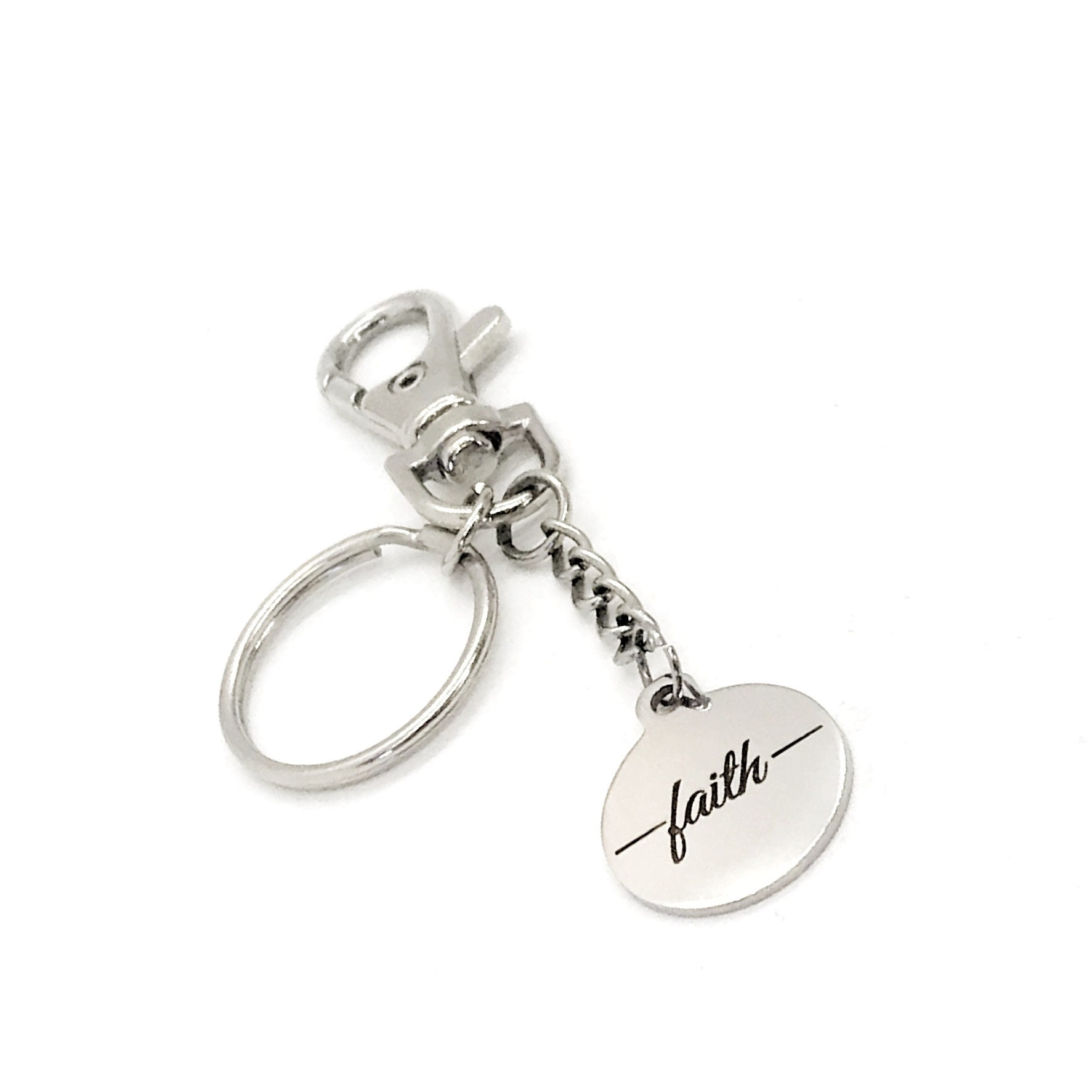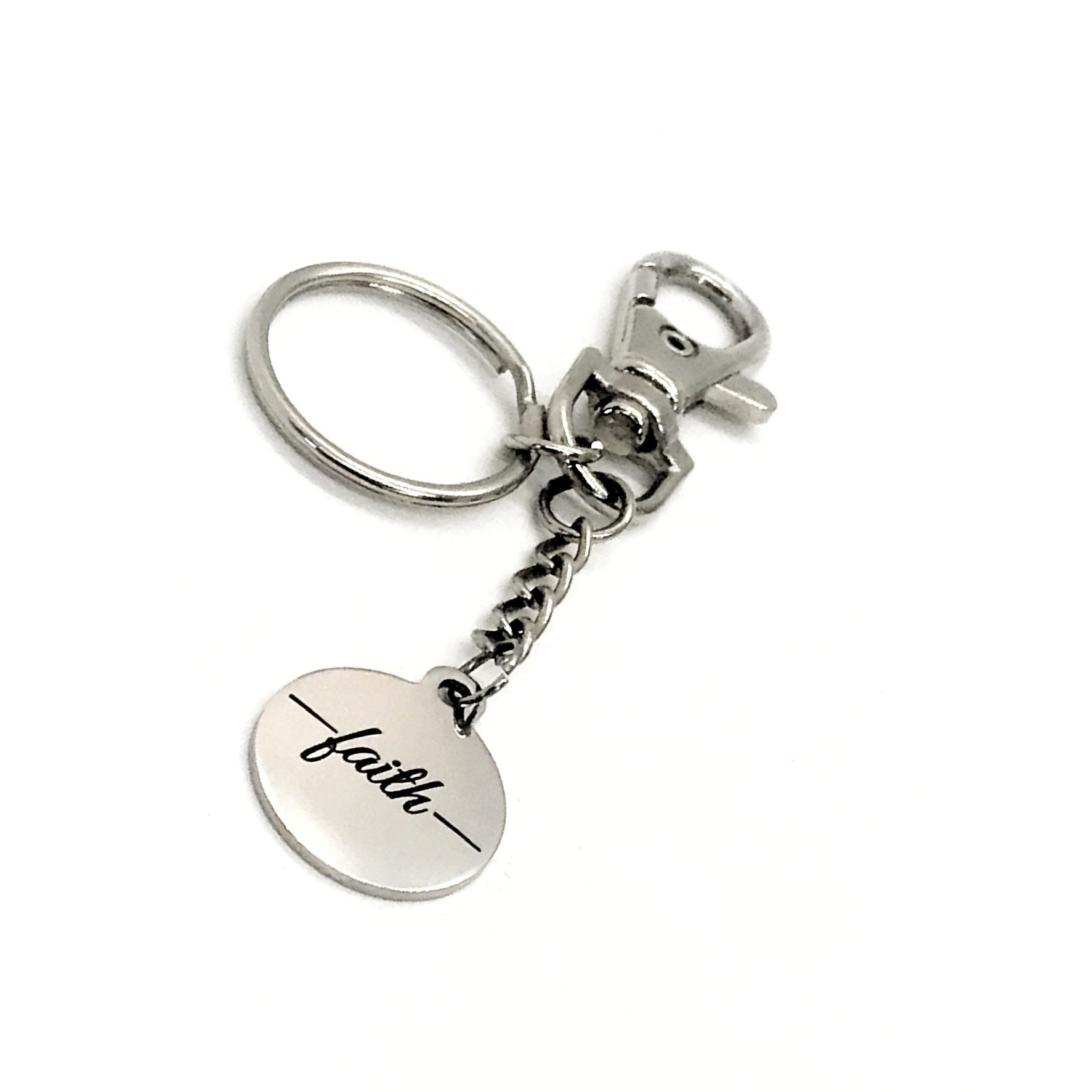 This is a clip-on keychain gift . The keyring can be clipped onto your bag to make it easy to access without digging to the bottom of the bag. It has a stainless steel laser engraved charm with “faith” on it.