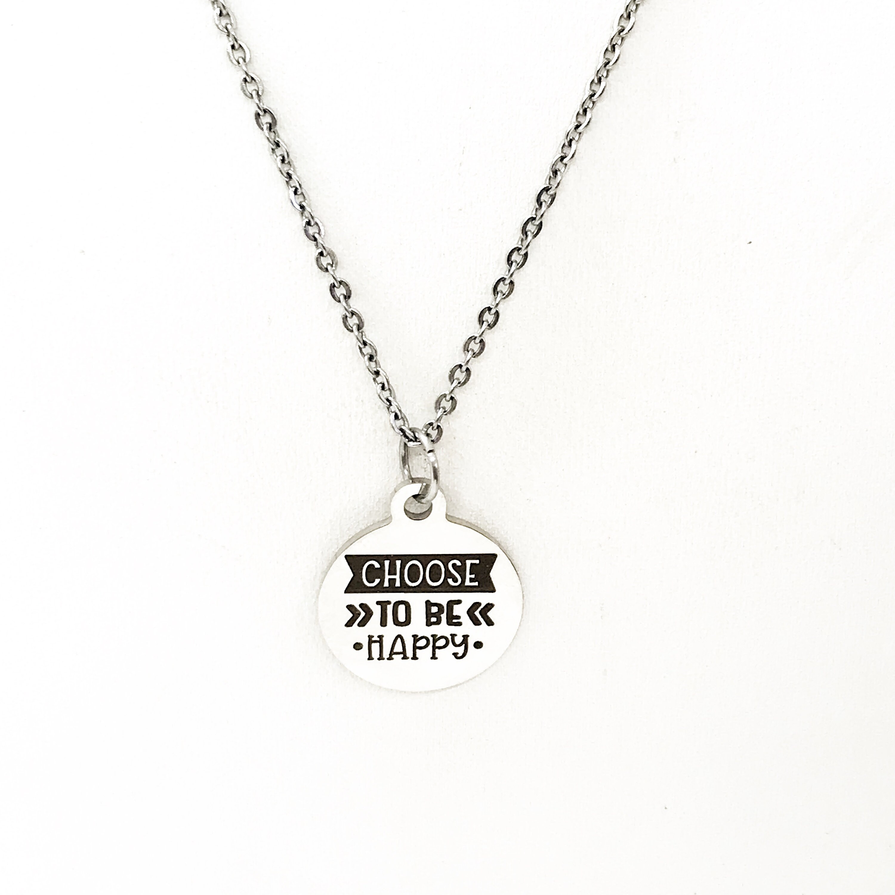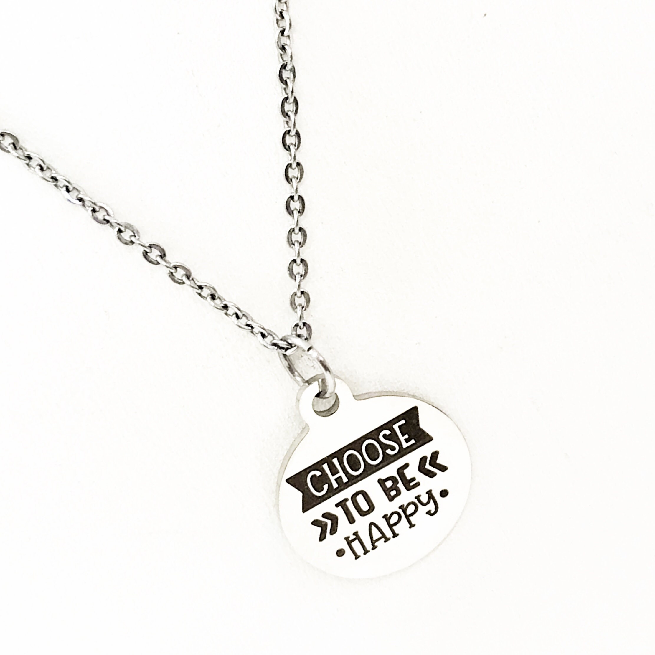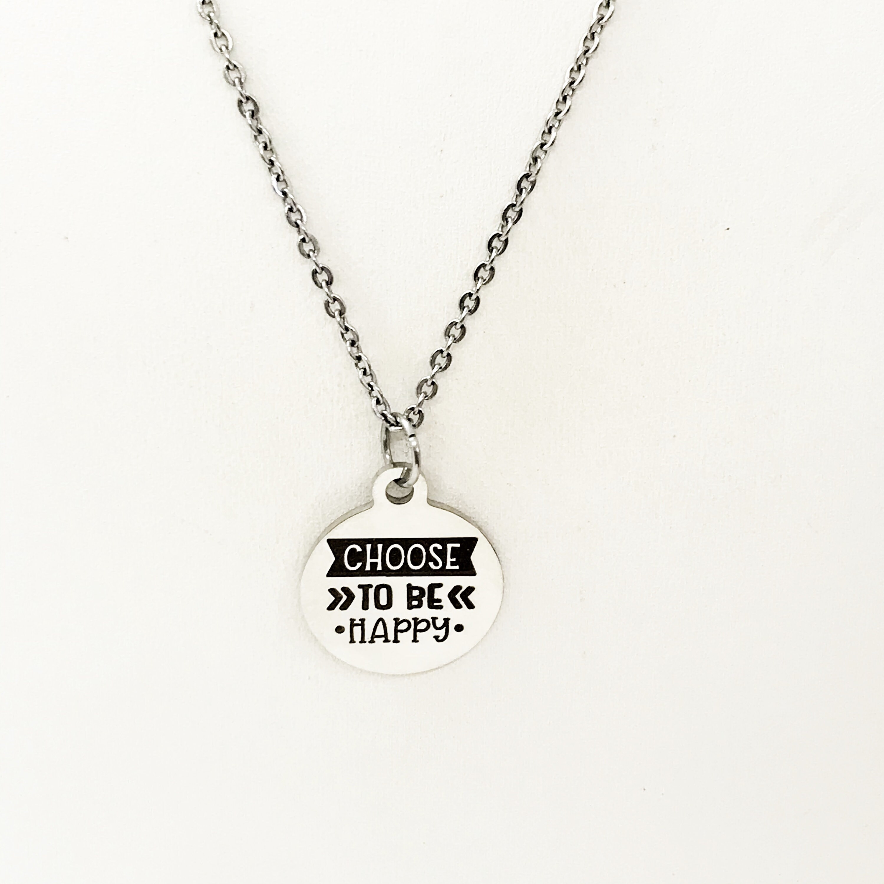 This is a stainless steel laser engraved pendant on a stainless steel chain. The pendant has “Choose to be happy" on it. This pendant is available on your choice of 16, 18, 20, 22, 24, 26, 28 or 30 inch chain. The pendant is also available for individual purchase if you have another chain on which you would like to wear it.