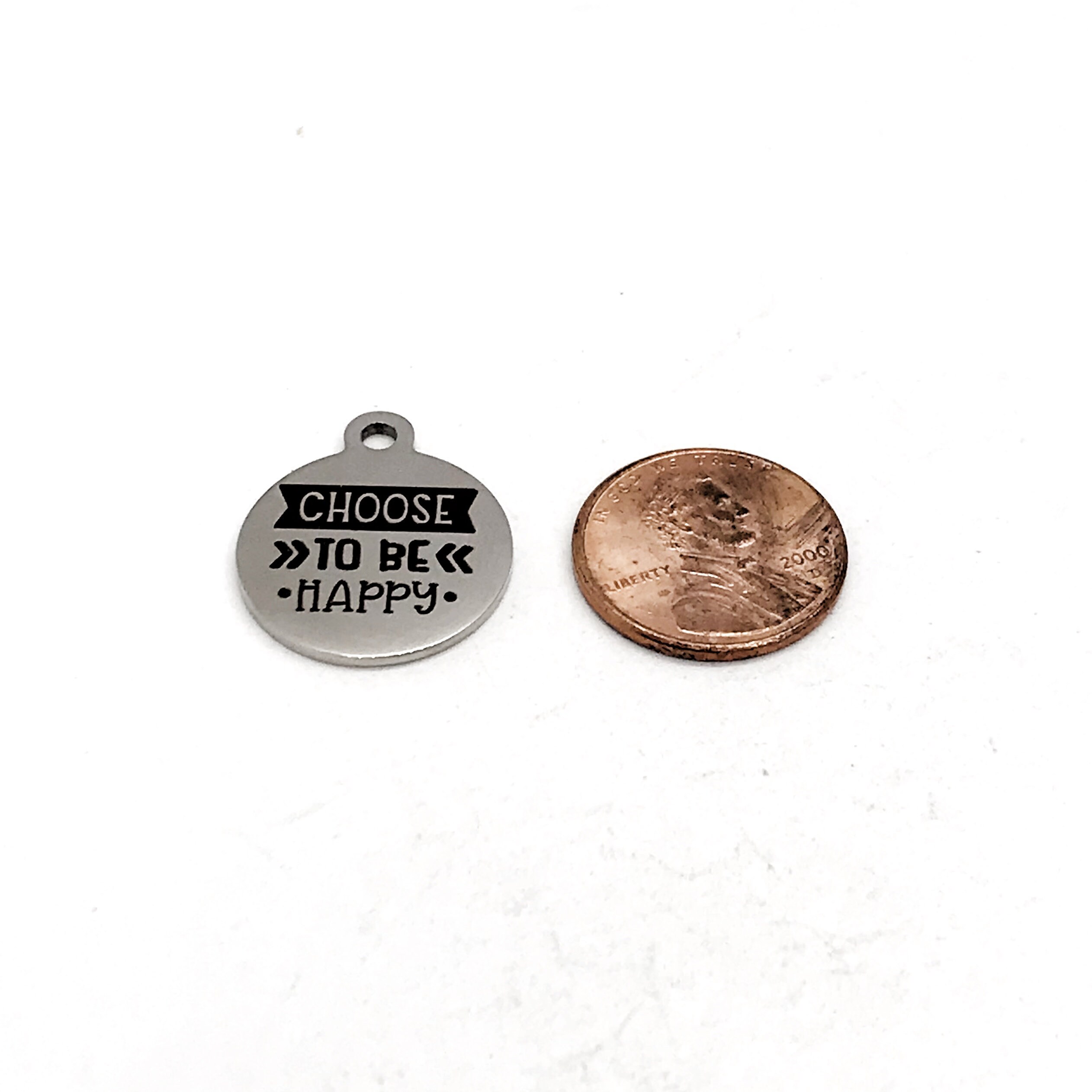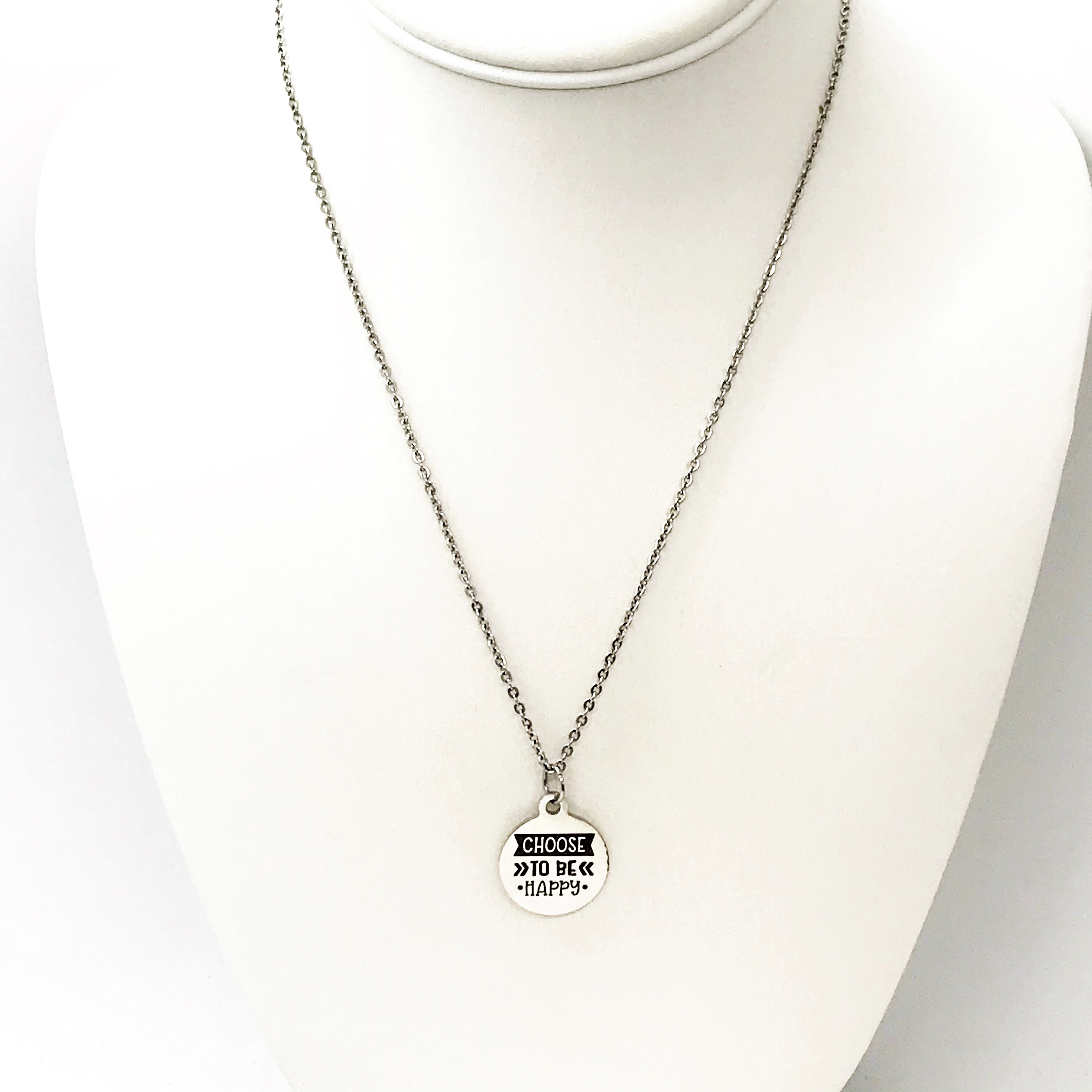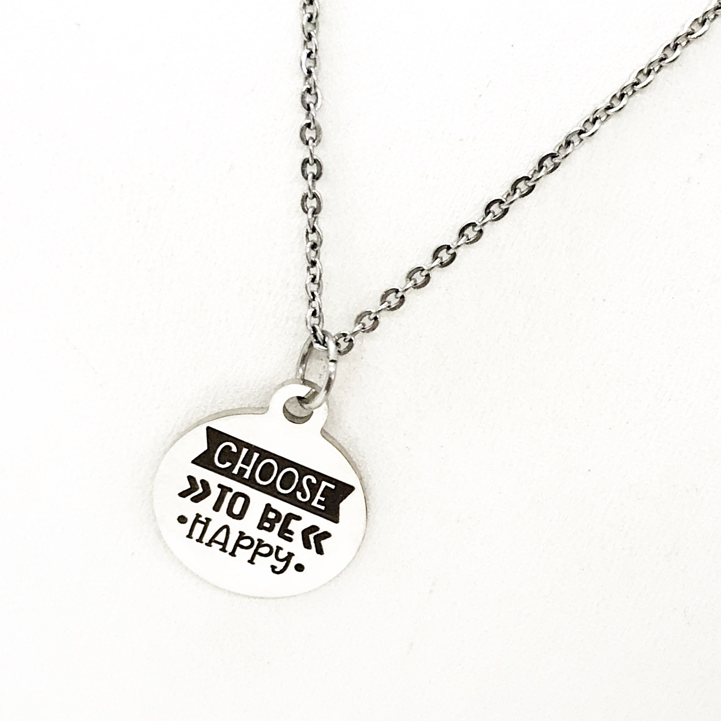 This is a stainless steel laser engraved pendant on a stainless steel chain. The pendant has “Choose to be happy" on it. This pendant is available on your choice of 16, 18, 20, 22, 24, 26, 28 or 30 inch chain. The pendant is also available for individual purchase if you have another chain on which you would like to wear it.