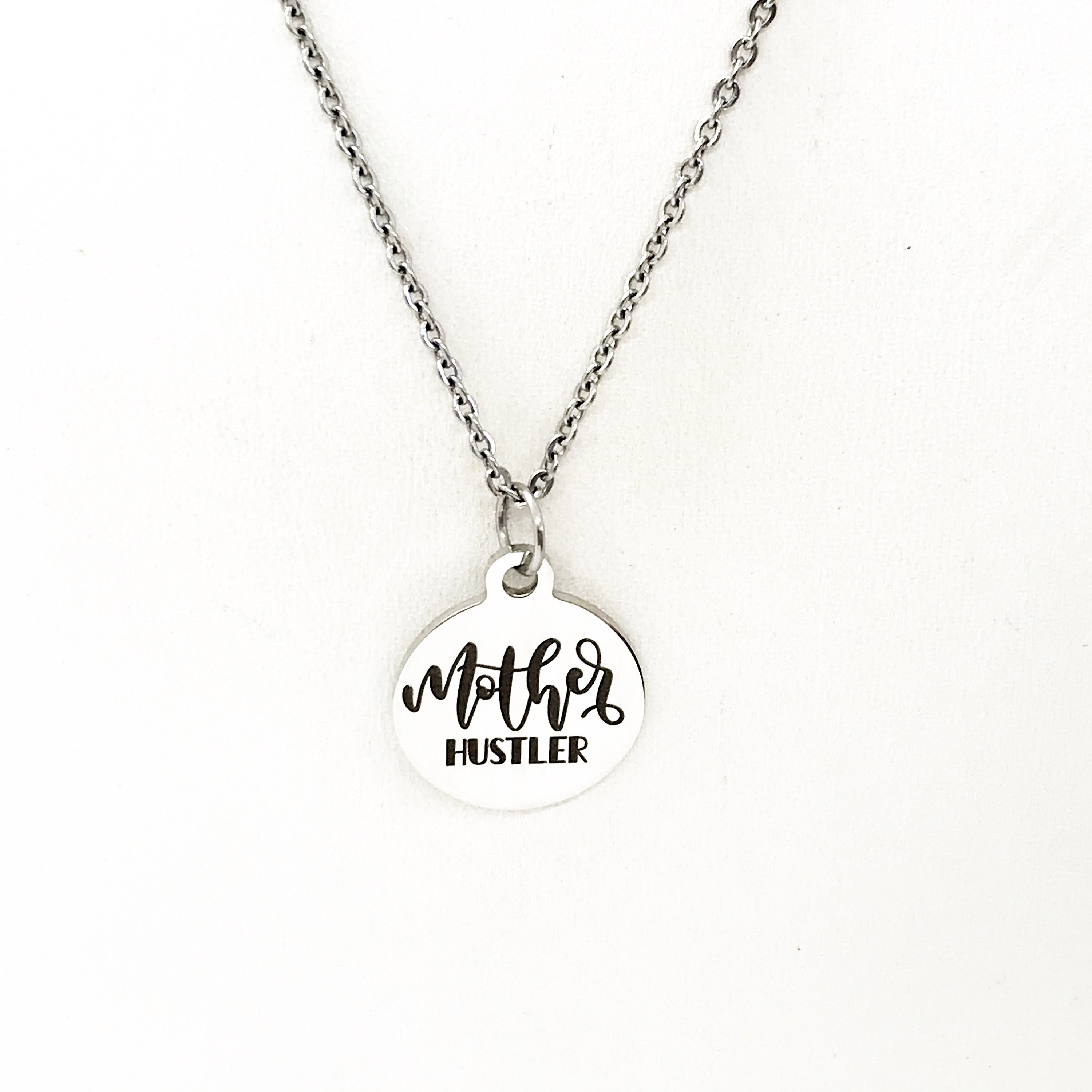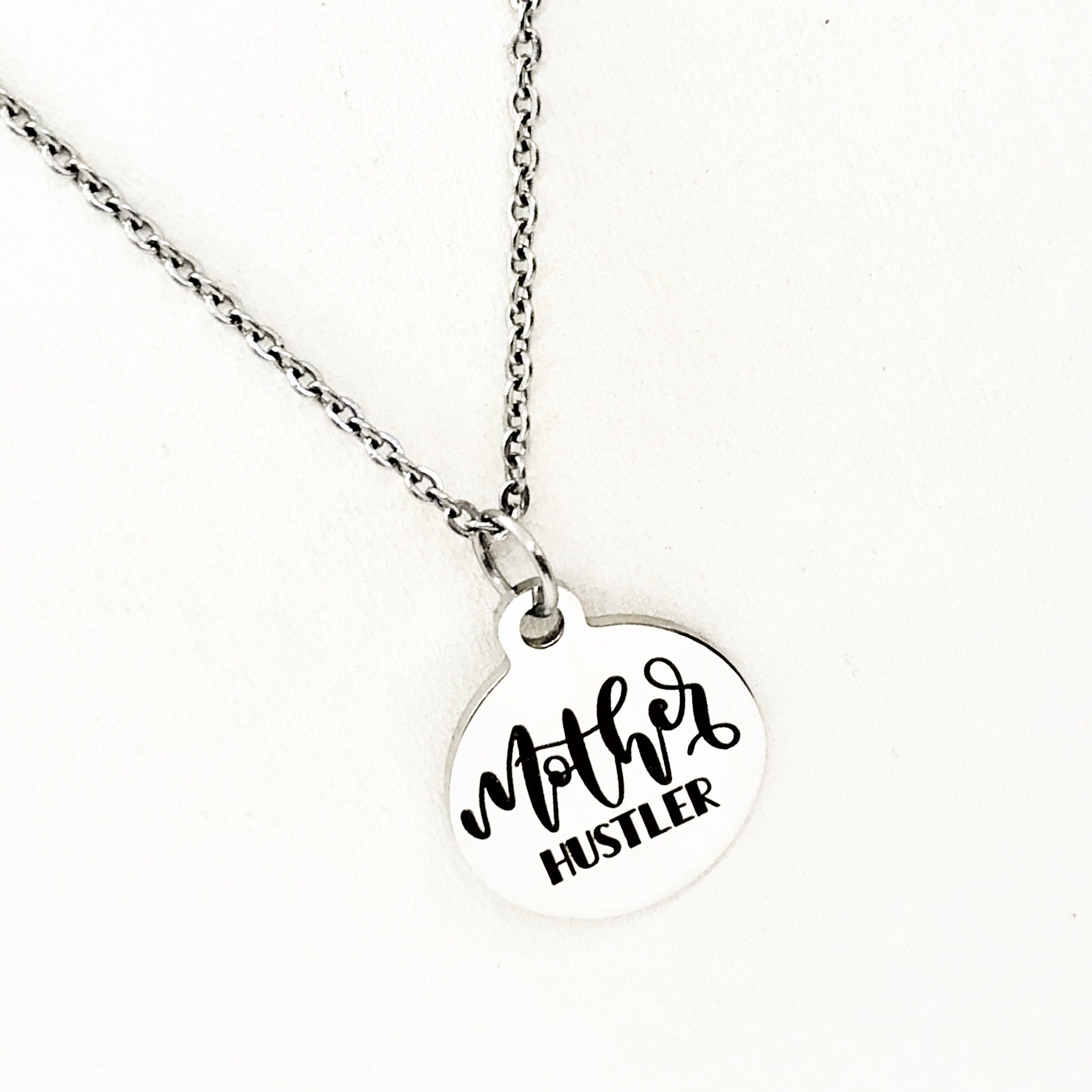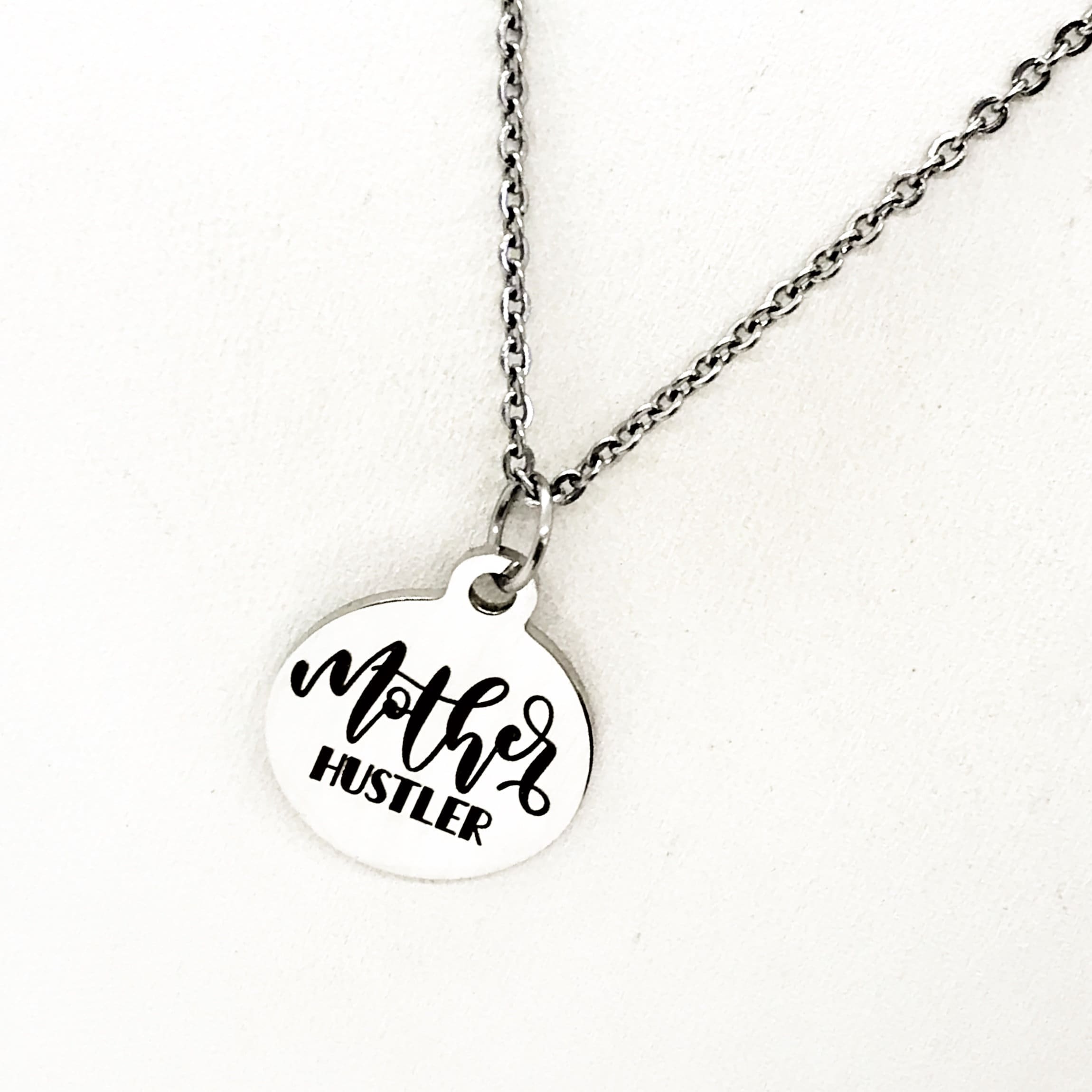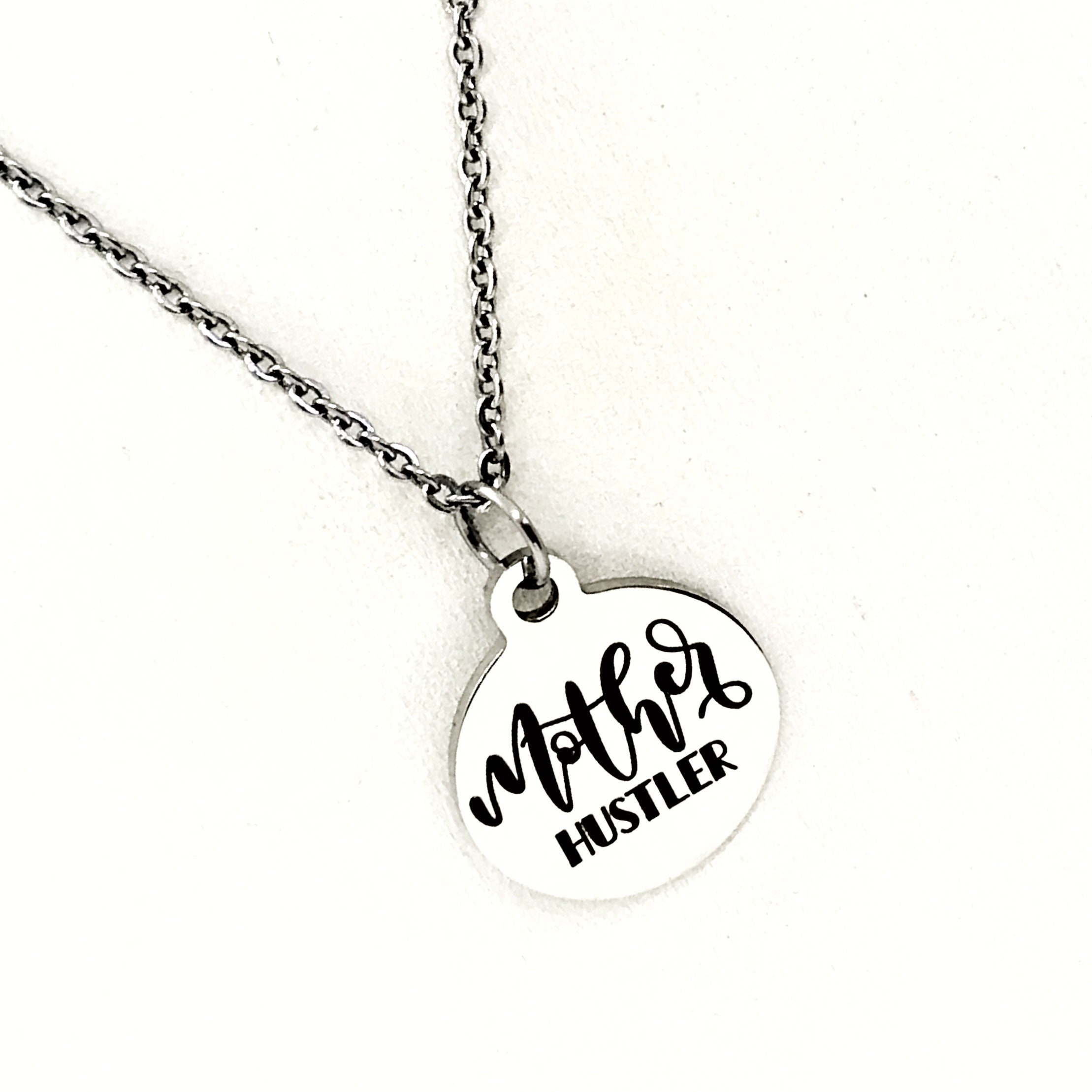 This is a stainless steel laser engraved pendant on a stainless steel chain. The pendant has “Mother Hustler" on it. This pendant is available on your choice of 16, 18, 20, 22, 24, 26, 28 or 30 inch chain. The pendant is also available for individual purchase if you have another chain on which you would like to wear it.