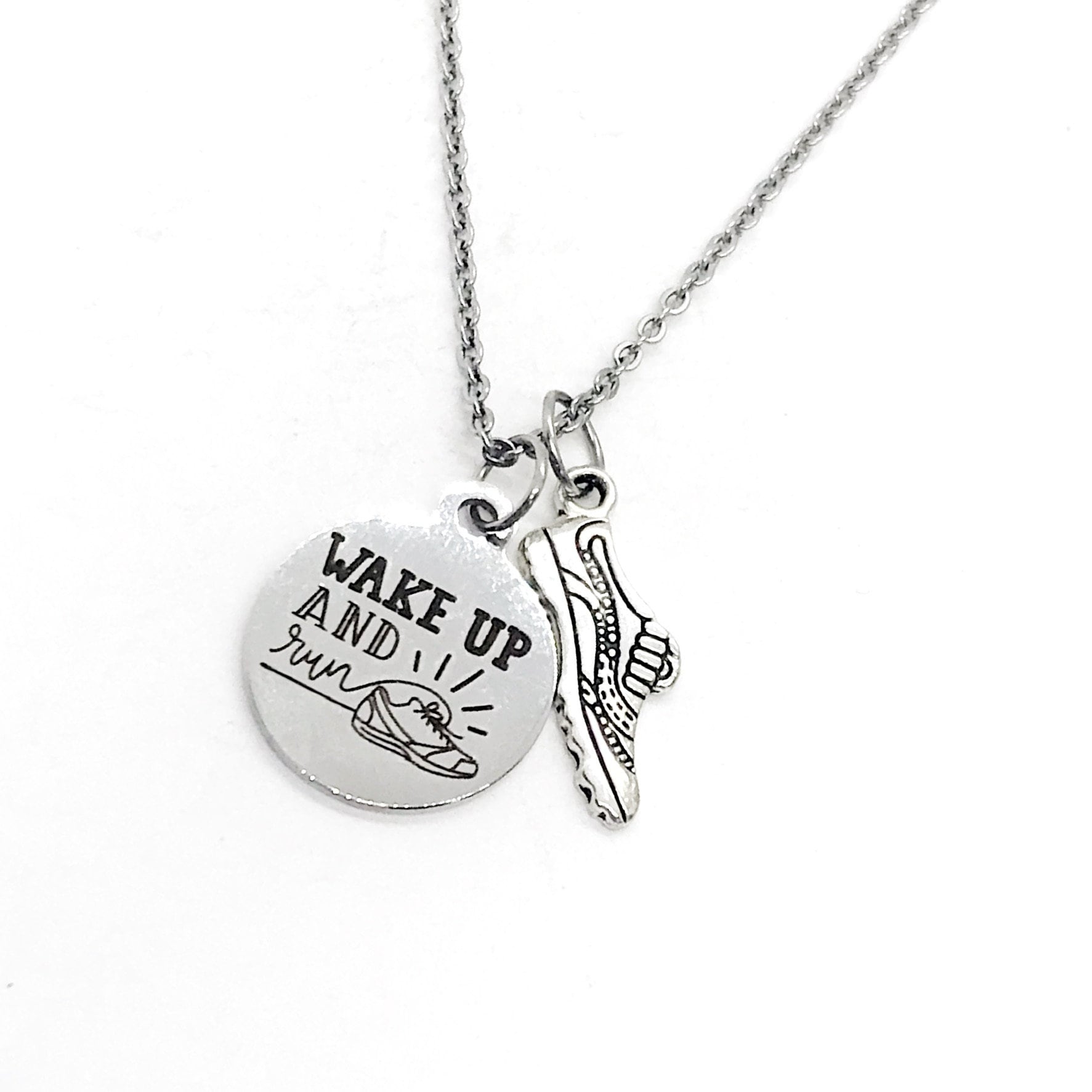 This is a stainless steel laser engraved pendant on a stainless steel chain. The pendant has “Wake up and Run" on it. This pendant is available on your choice of 16, 18, 20, 22, 24, 26, 28 or 30 inch chain. The pendant measures approx. 3/4 inch is also available for individual purchase if you have another chain on which you would like to wear it.