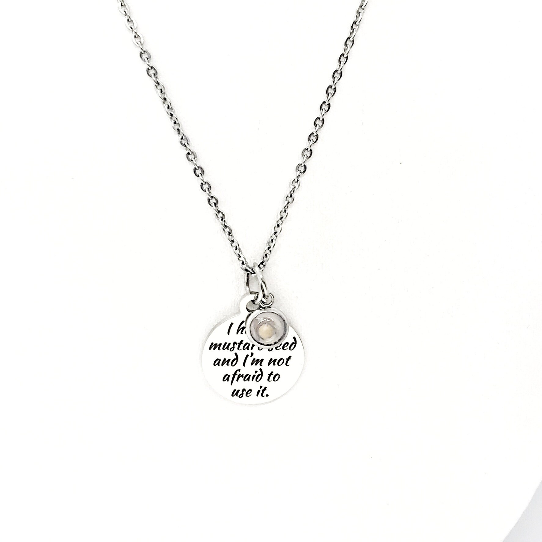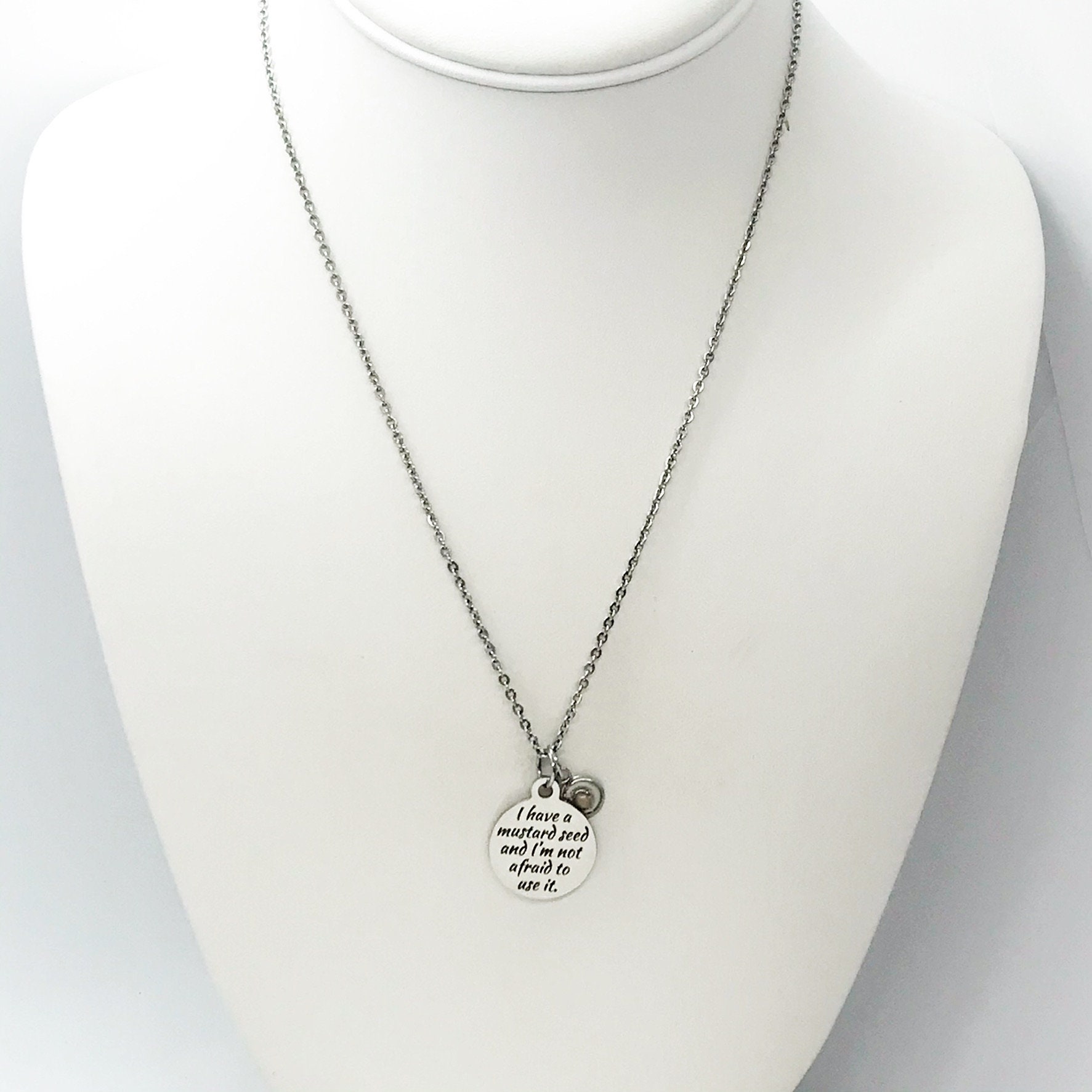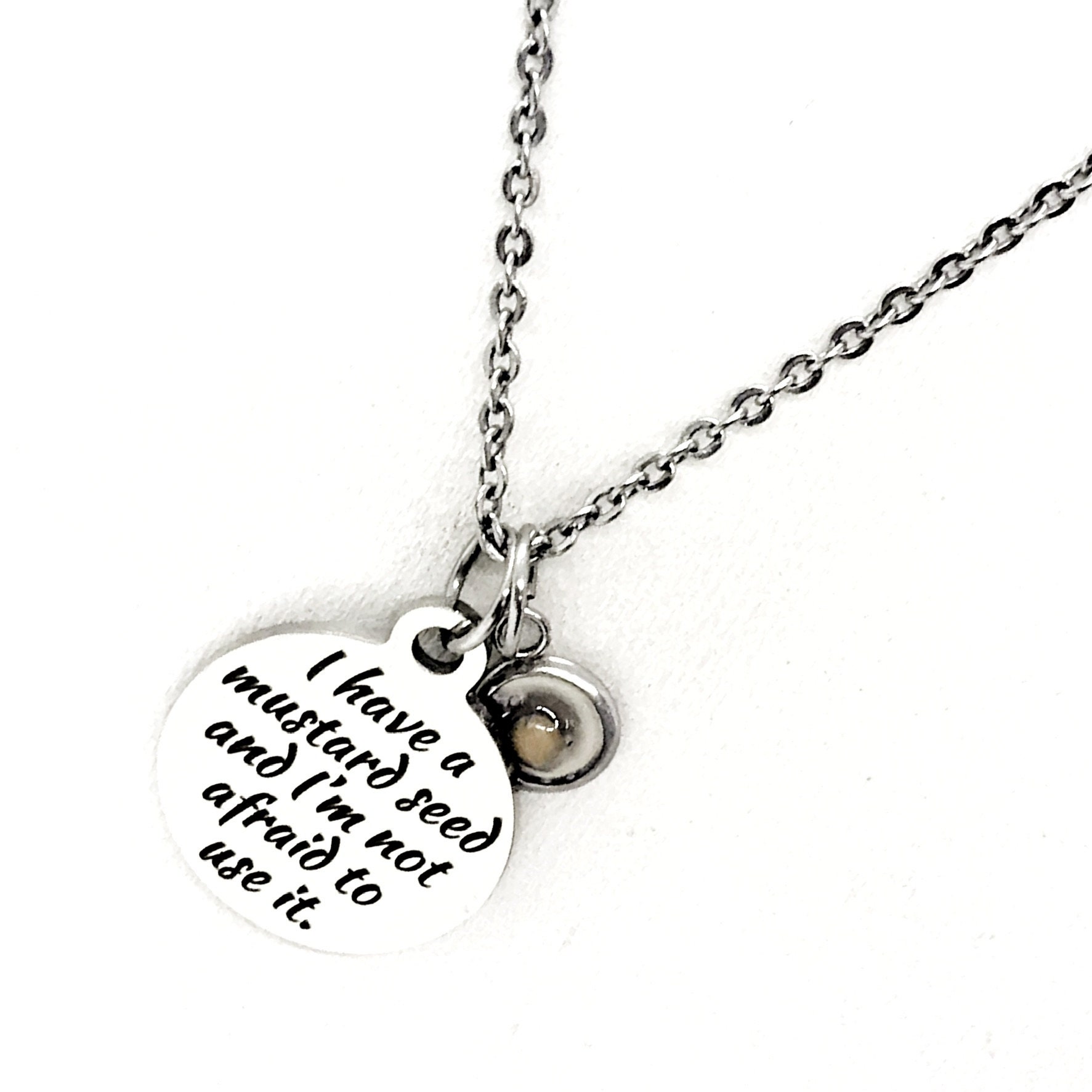 This is a stainless steel laser engraved pendant on a stainless steel chain. The pendant has “I have a mustard seed and I’m not afraid to use it" referencing the scripture of Matthew 17:20 on it. This pendant is available on your choice of 16, 18, 20, 22, 24, 26, 28 or 30 inch chain. The pendant measures approx. 3/4 inch is also available for individual purchase if you have another chain on which you would like to wear it.