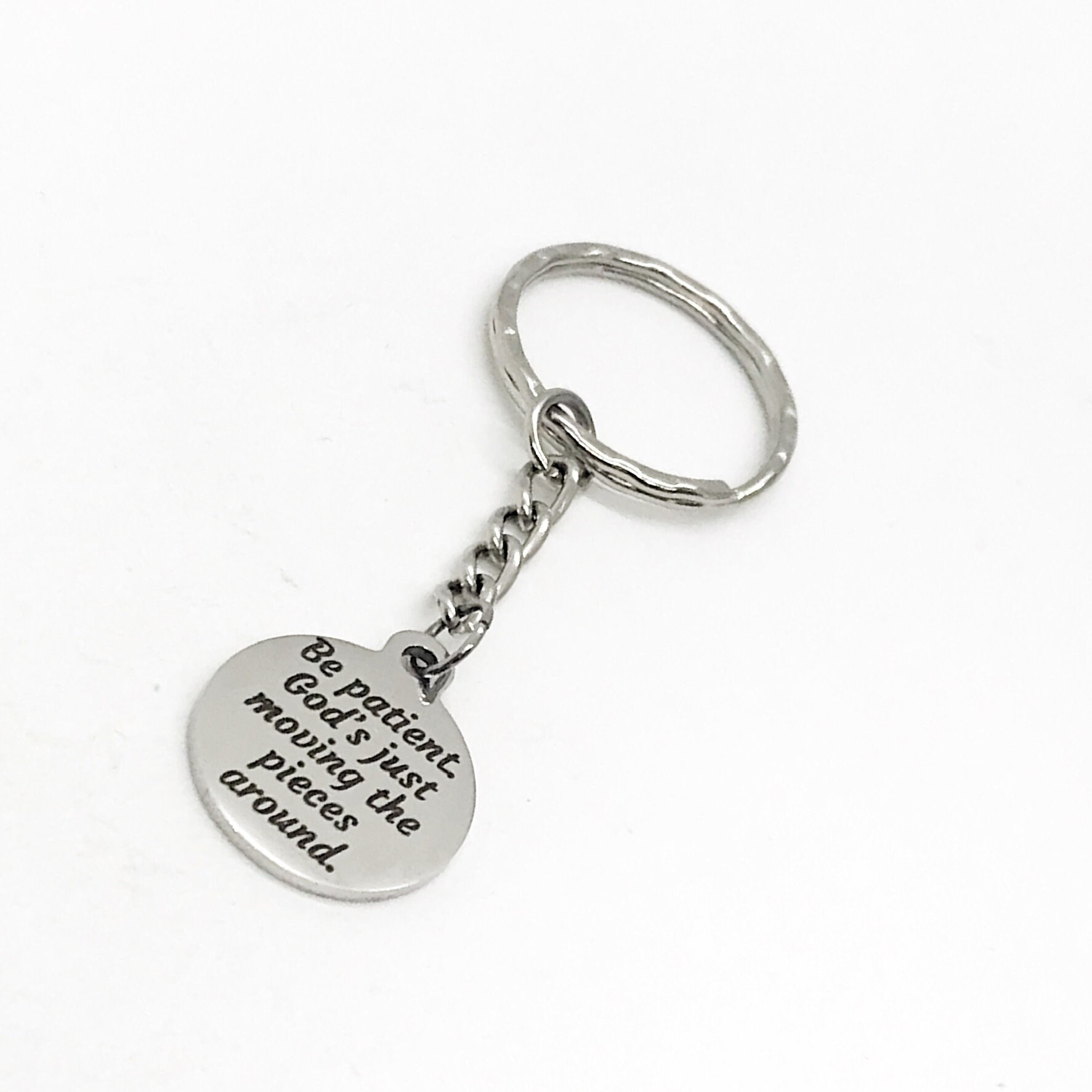 This is a great Christian encouragement keychain. It has a stainless steel laser engraved charm with “Be patient, God’s just moving around the pieces.” on it. The charm measures approx. 3/4 inch across.