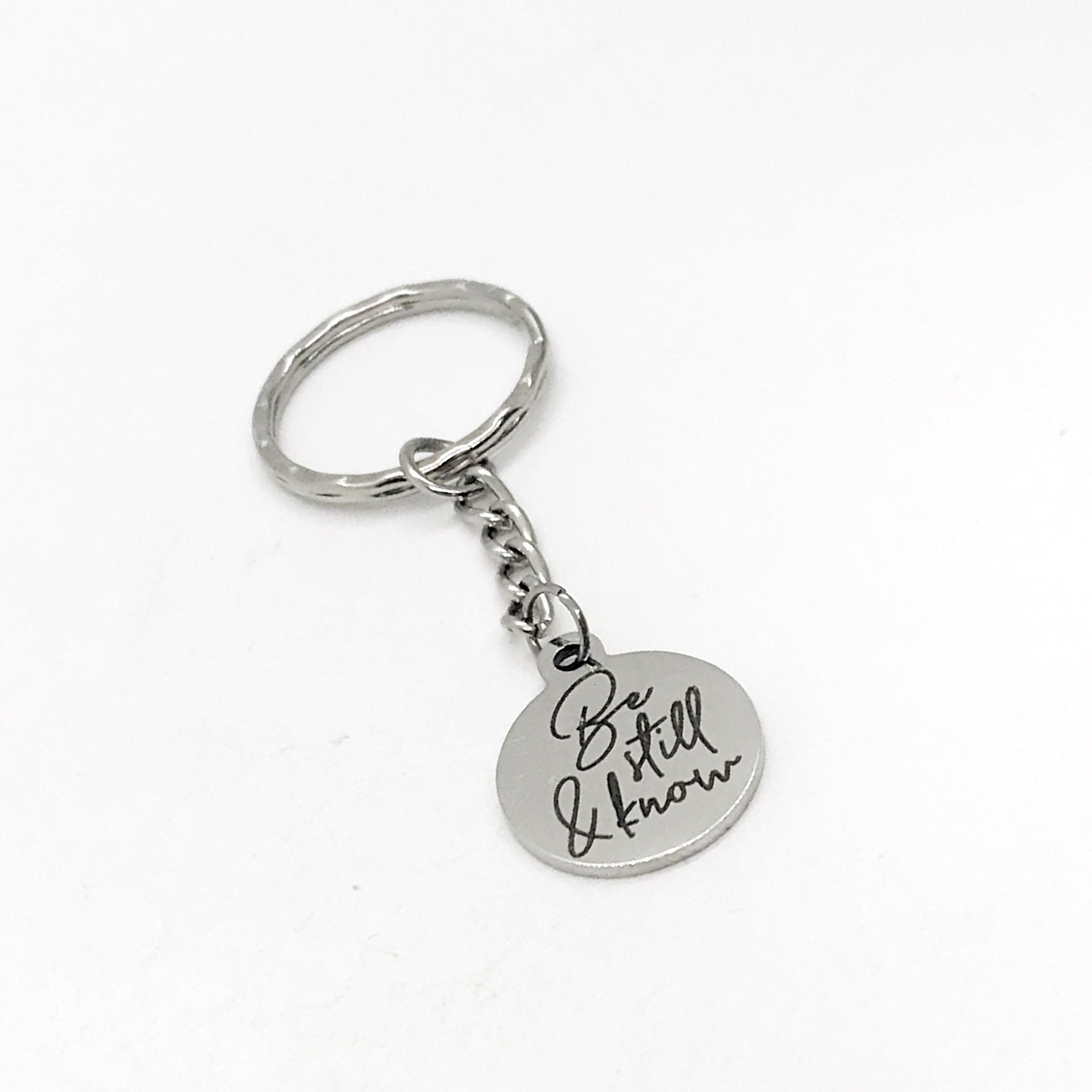 This is a great Christian encouragement keychain. It has a stainless steel laser engraved charm with “Be still and know” from Psalm 46:10 on it. The charm measures approx. 3/4 inch across.
