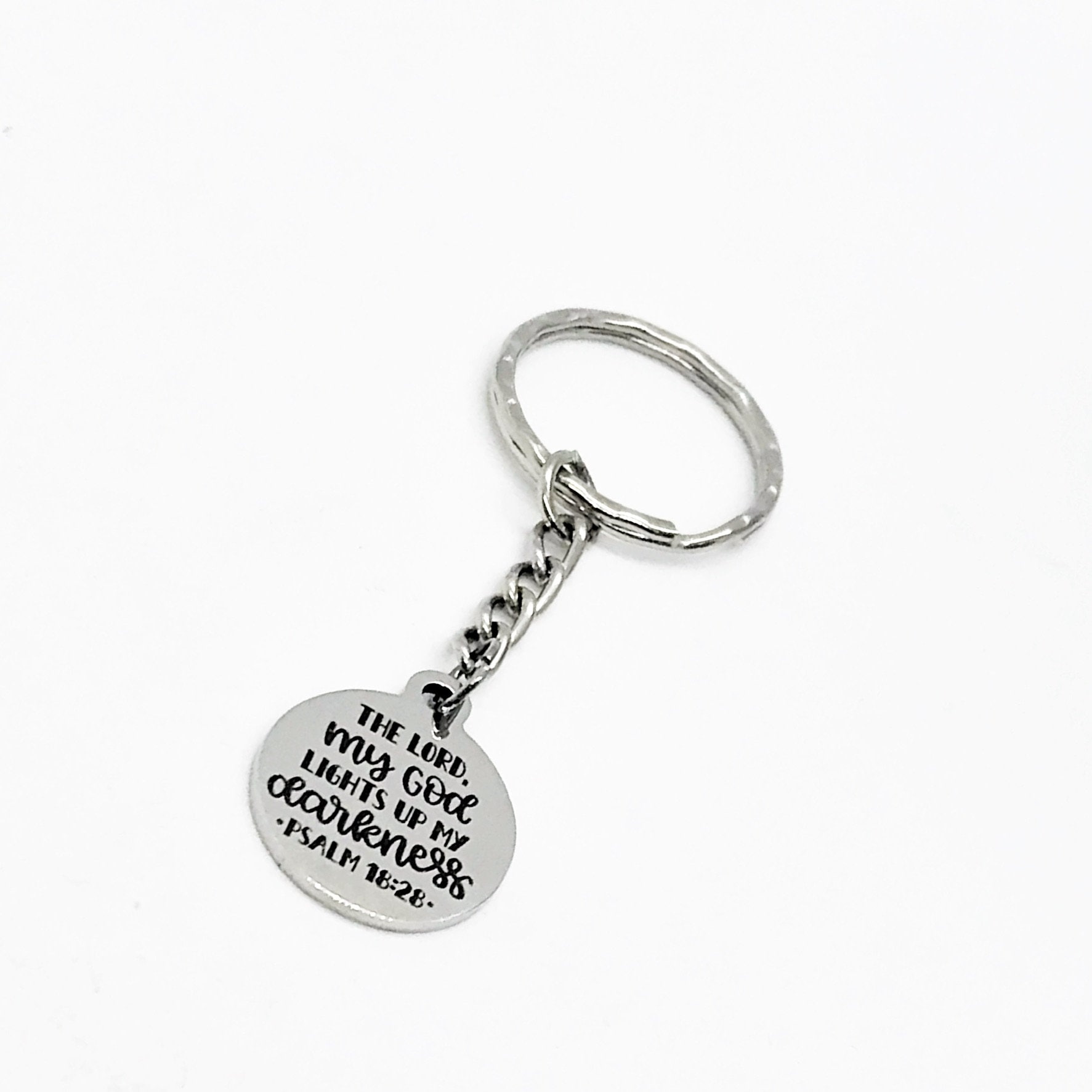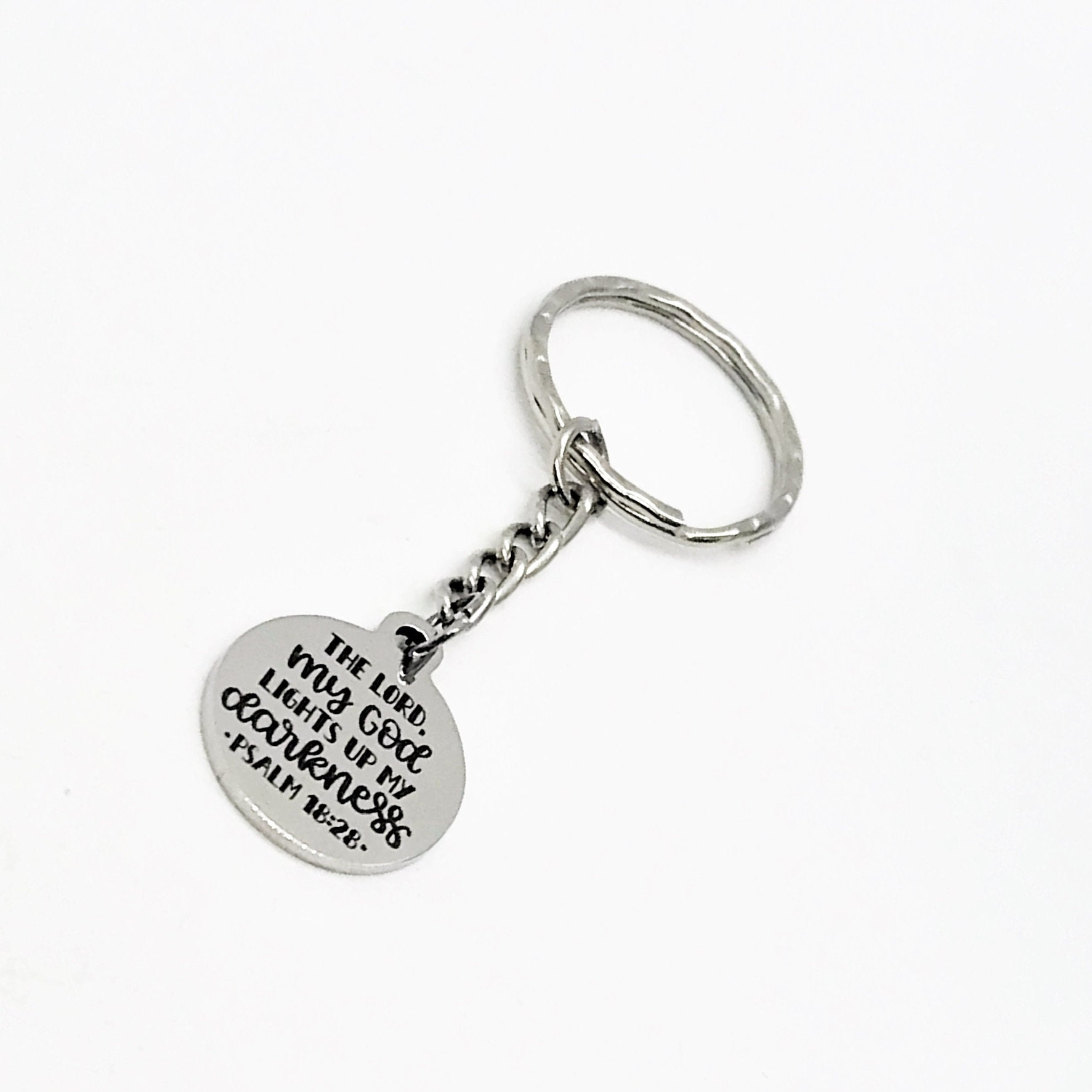 This is a great keychain gift. It has a stainless steel laser engraved charm with “The Lord my God lights up my darkness” from Psalm 18:28on it. The charm measures approx. 3/4 inch across.