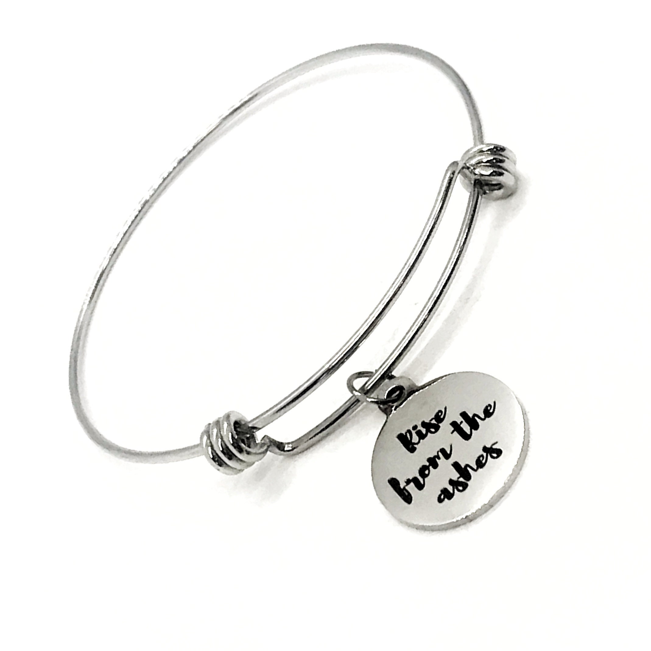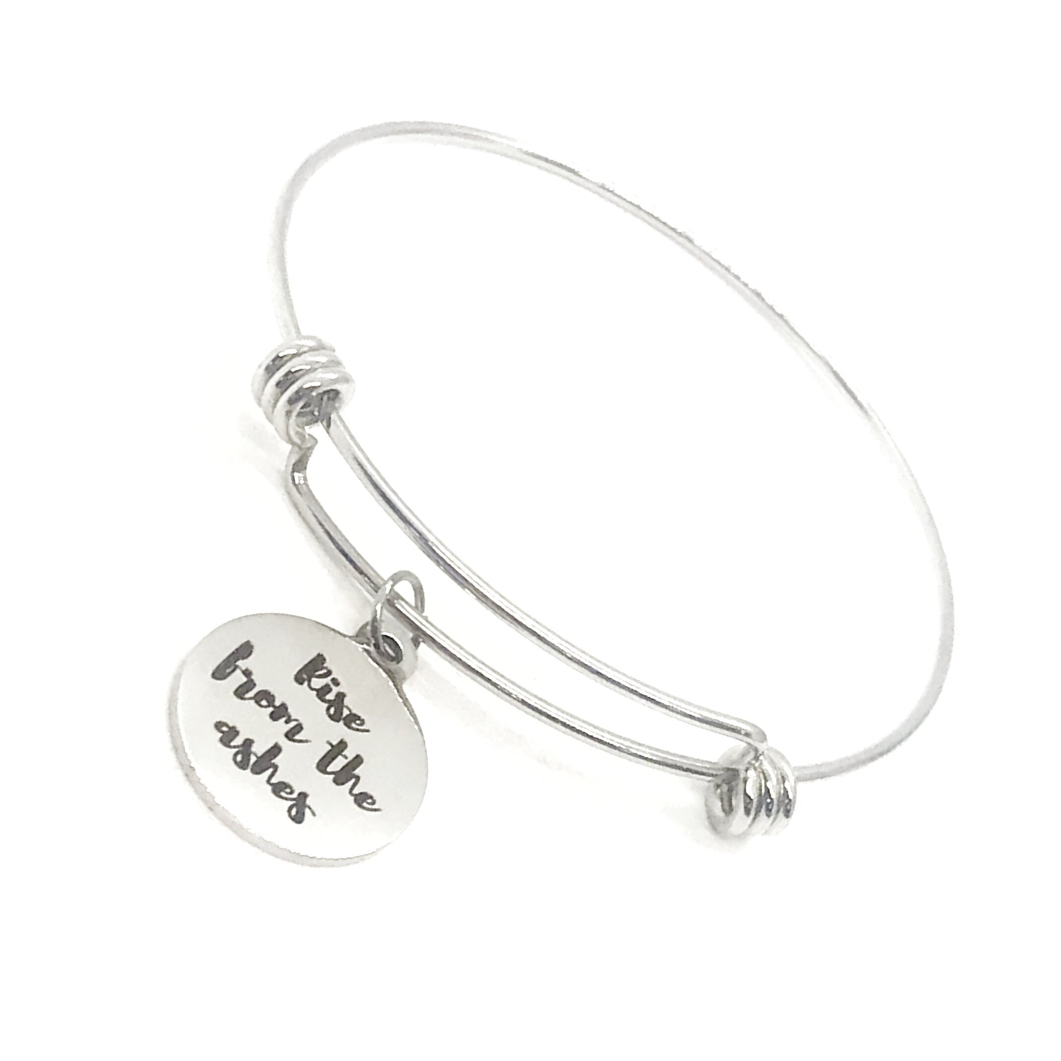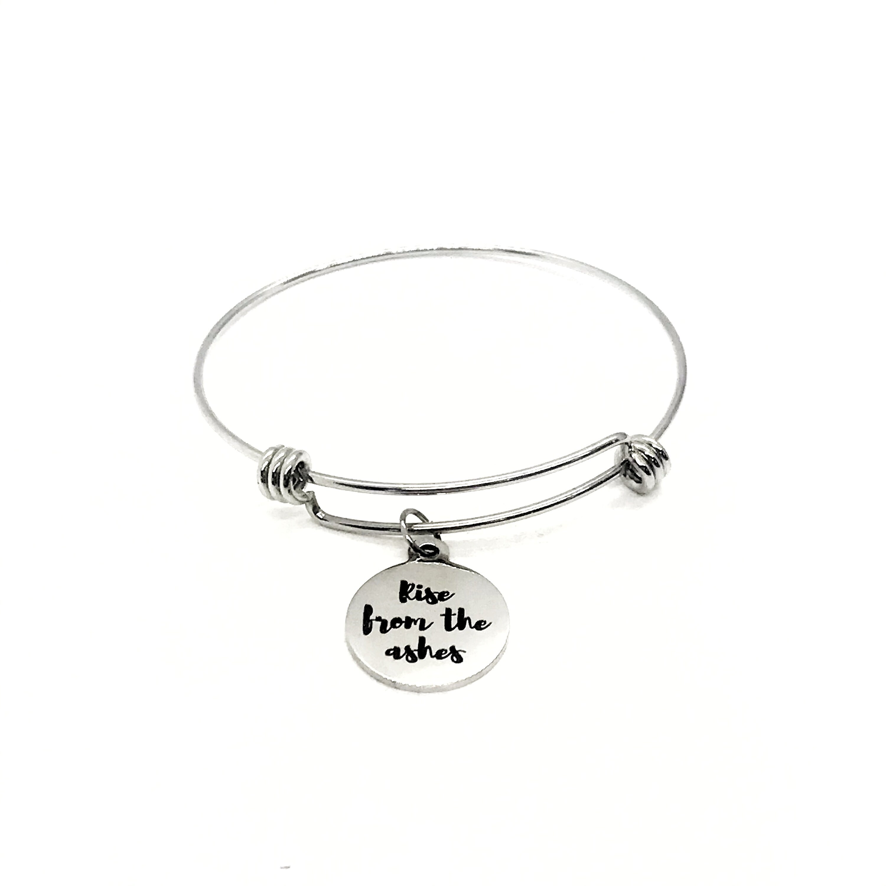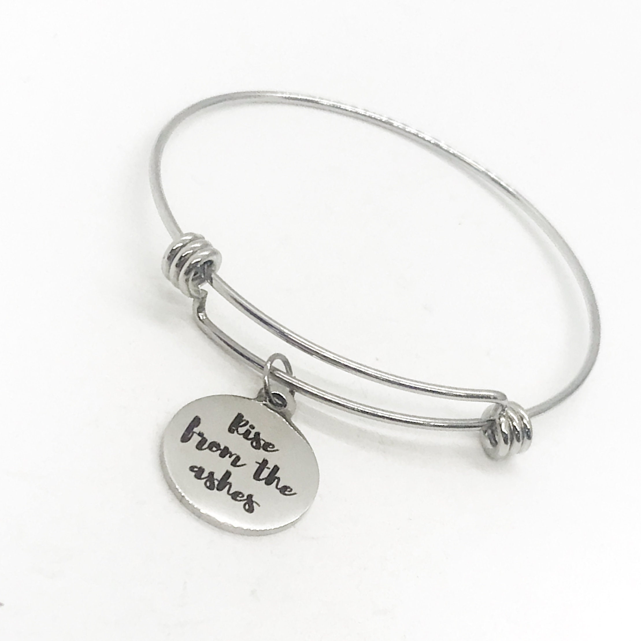 This stacking bangle bracelet would be a great motivational jewelry gift. It has a stainless steel laser engraved charm with “Rise from the ashes” on it.
