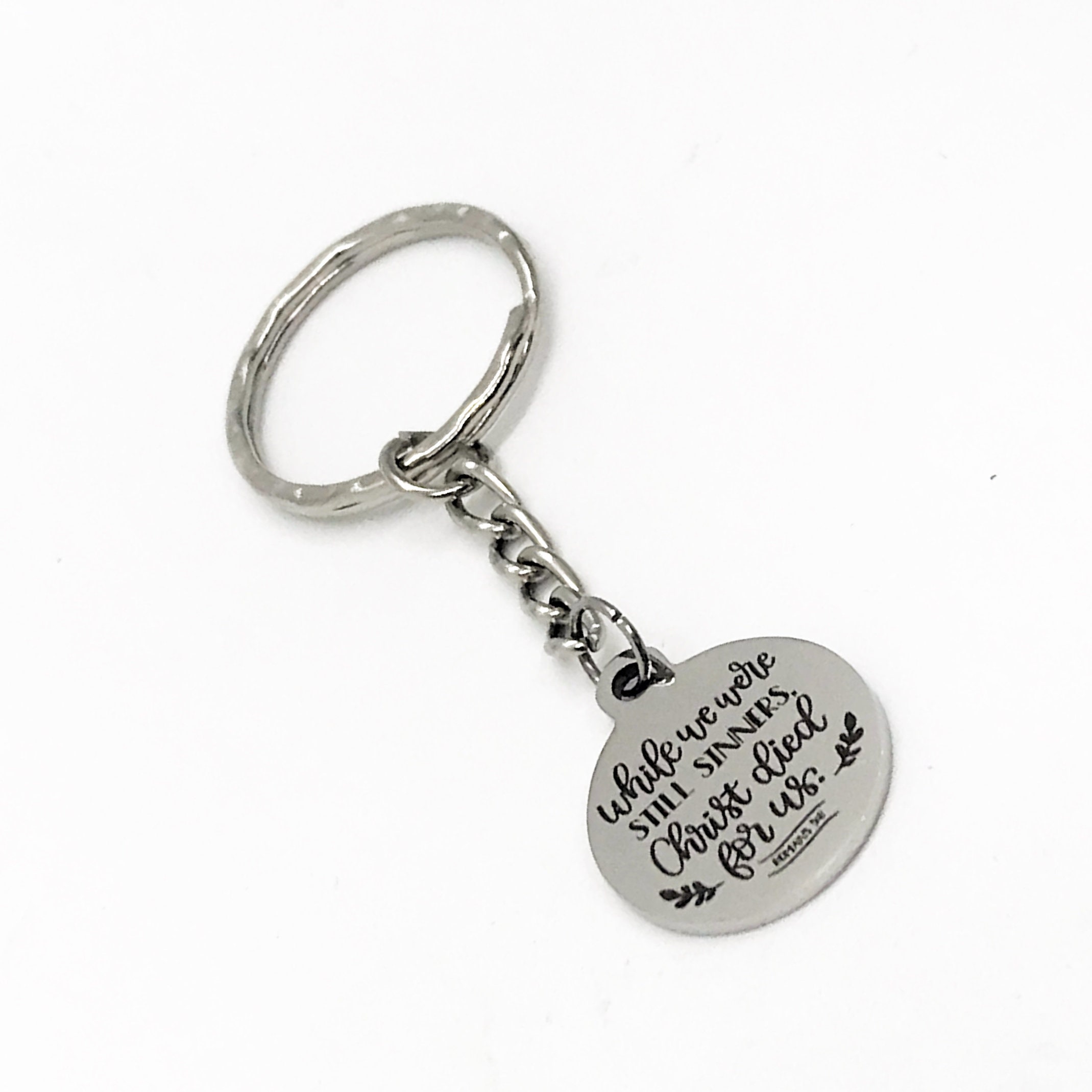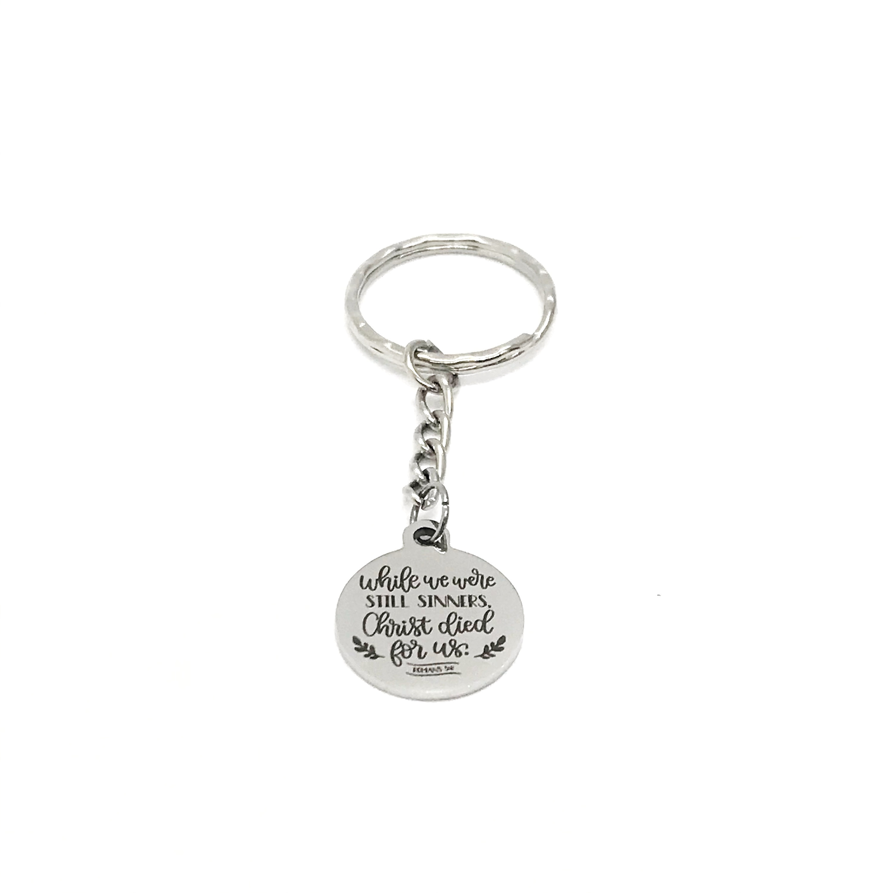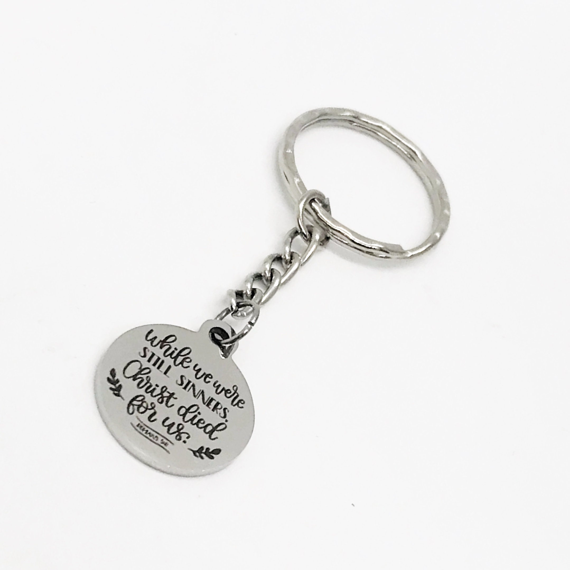 This is a great keychain gift. It has a stainless steel laser engraved charm with “While we were still sinners, Christ died for us” from Romans 5:8 on it. The charm measures approx. 3/4 inch across.
