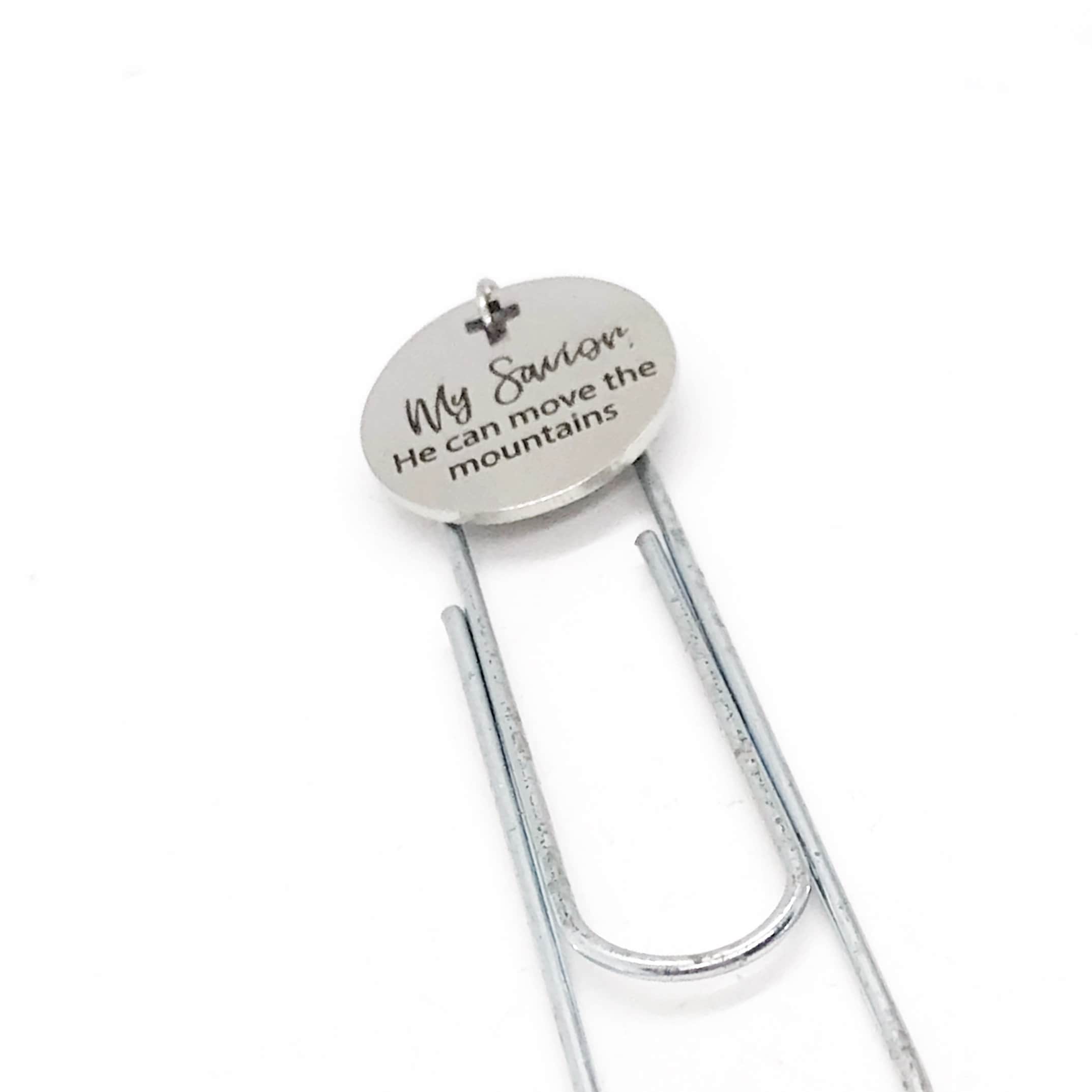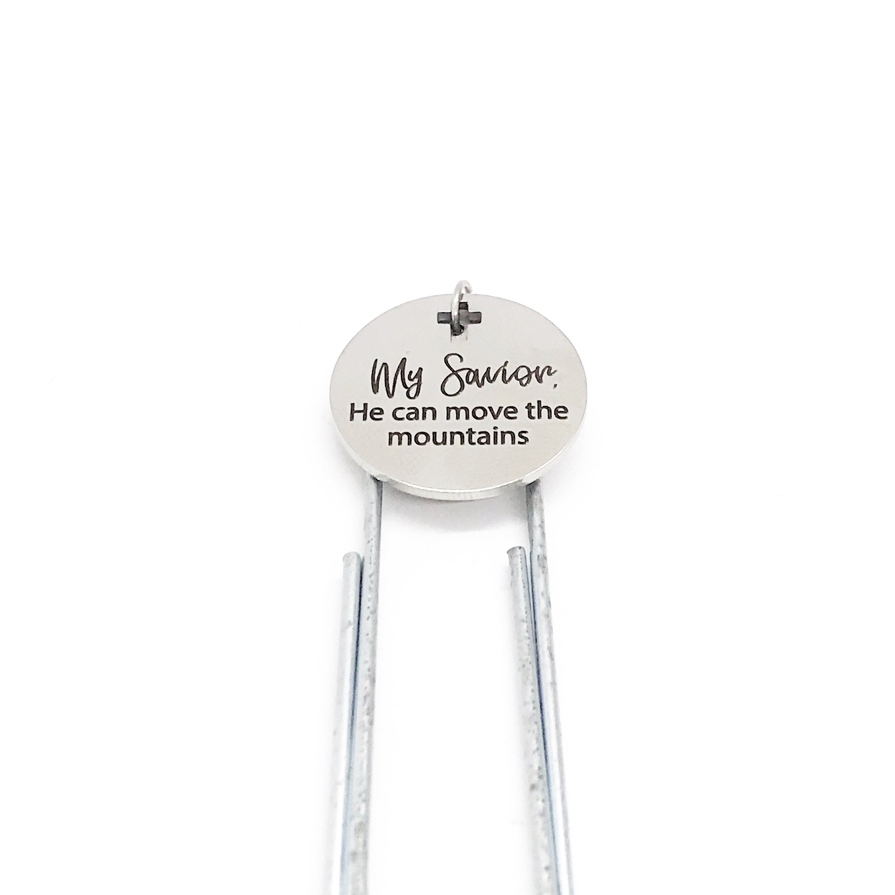 This bookmark has a stainless steel laser engraved charm with “My Savior, He can move the mountains” on it. It can be used as a bookmark, page marker, or planner book mark.