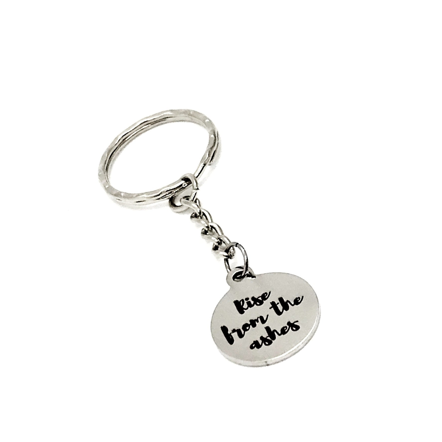 This is a great keychain gift. It has a stainless steel laser engraved charm with “Rise from the ashes” on it. The charm measures approx. 3/4 inch across.
