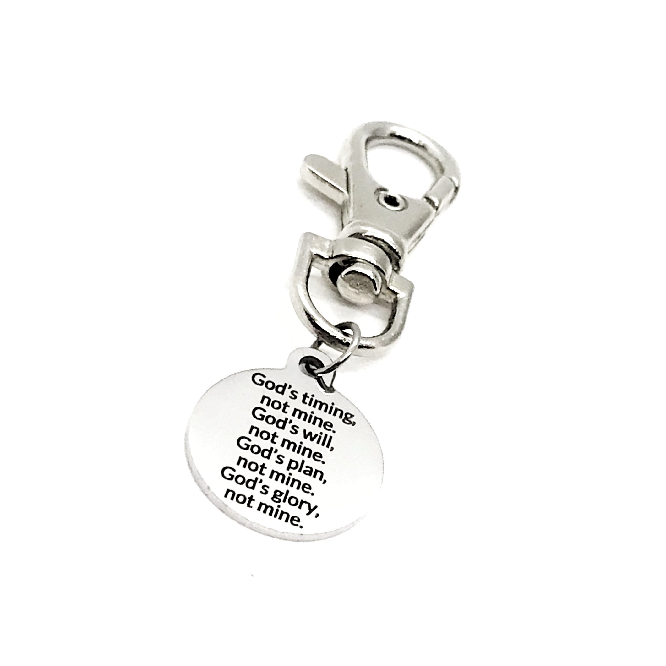 This is a great zipper pull or bag charm clip gift that would be perfect gift of Christian encouragement. It would be a great charm to clip onto a tote, purse, sports bag, book bag or keychain. It has “God’s timing, not mine. God’s will, not mine. God’s plan, not mine. God’s glory, not mine.” on it. The charm measures approx. 3/4 inch across.
