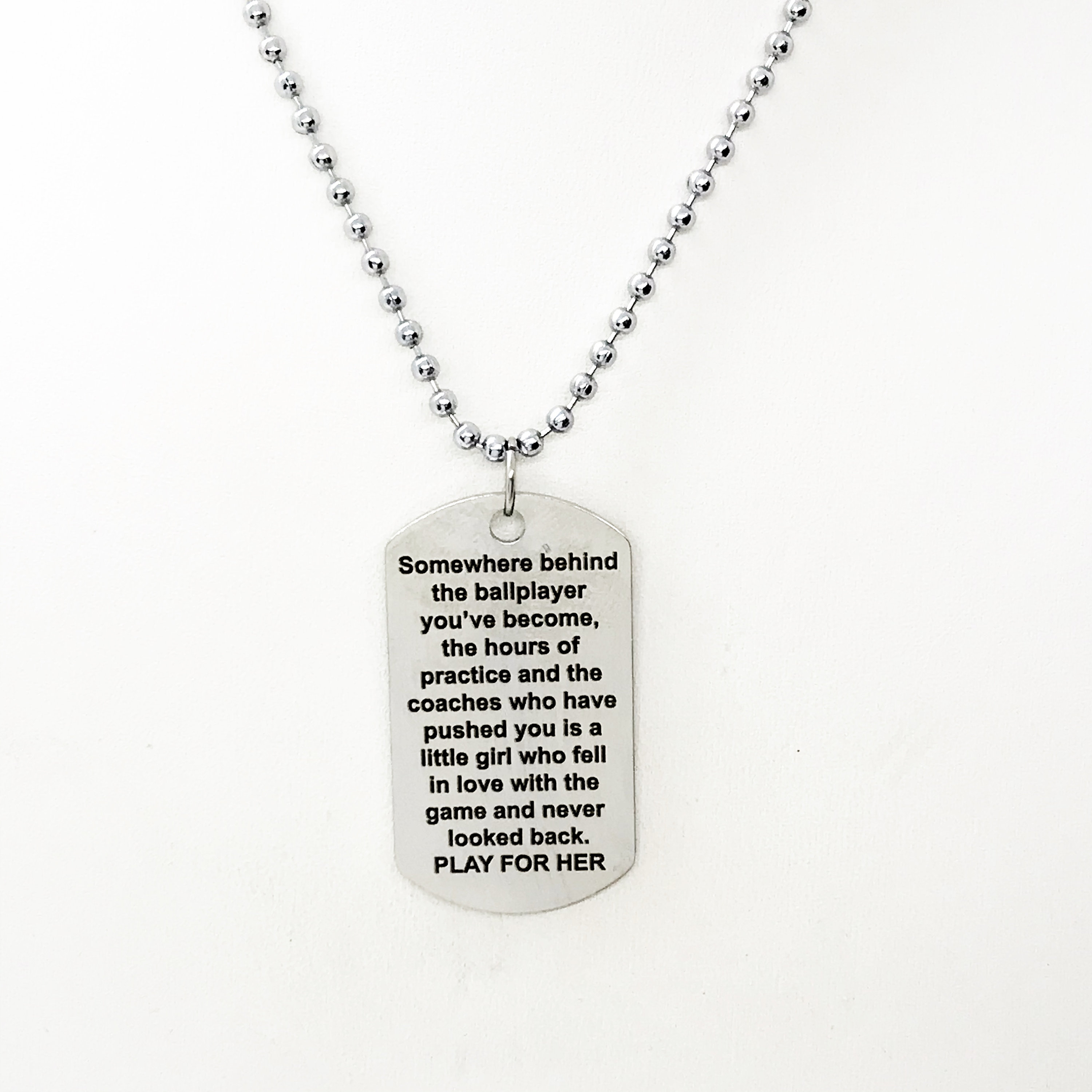 The pendant is a stainless steel laser engraved charm on a 24 inch stainless steel ball chain. The charm has the following on it: