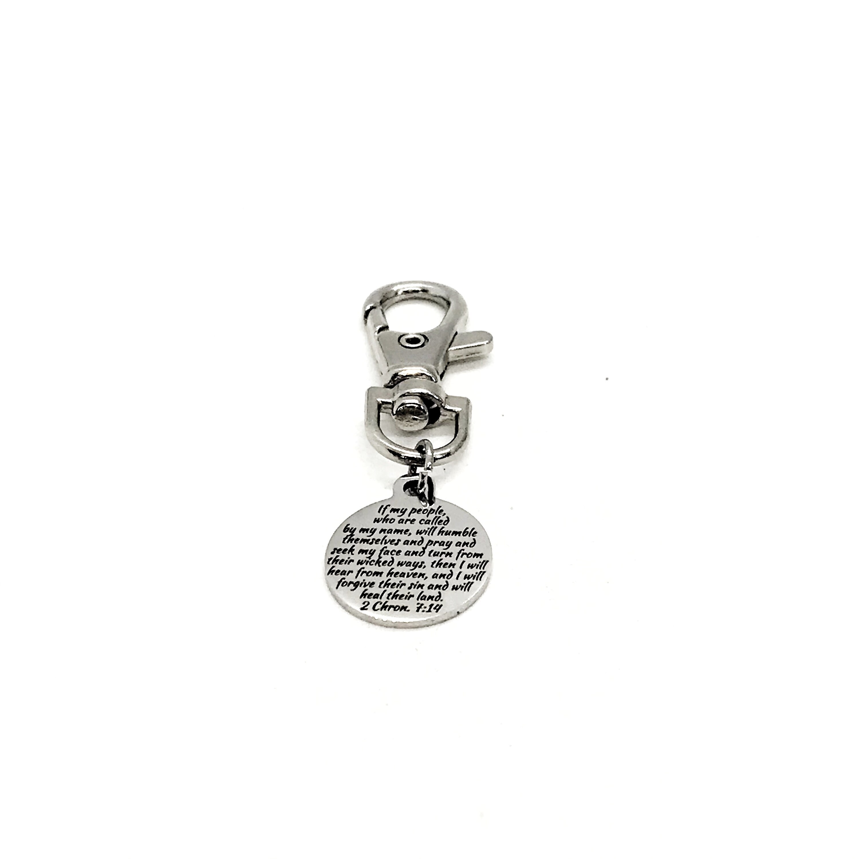 This is a zipper pull which includes a stainless steel laser engraved charm with “If my people, who are called by my name, will humble themselves and pray and seek my face and turn from their wicked ways, then I will hear from heaven, and I will forgive their sin and will heal their land” from 2 Chronicles 7:14 on it. This charm measures approx. 3/4 inch across. Please note that due to the amount of text on this charm, the font is small. It is intended to be a reminder to the wearer.