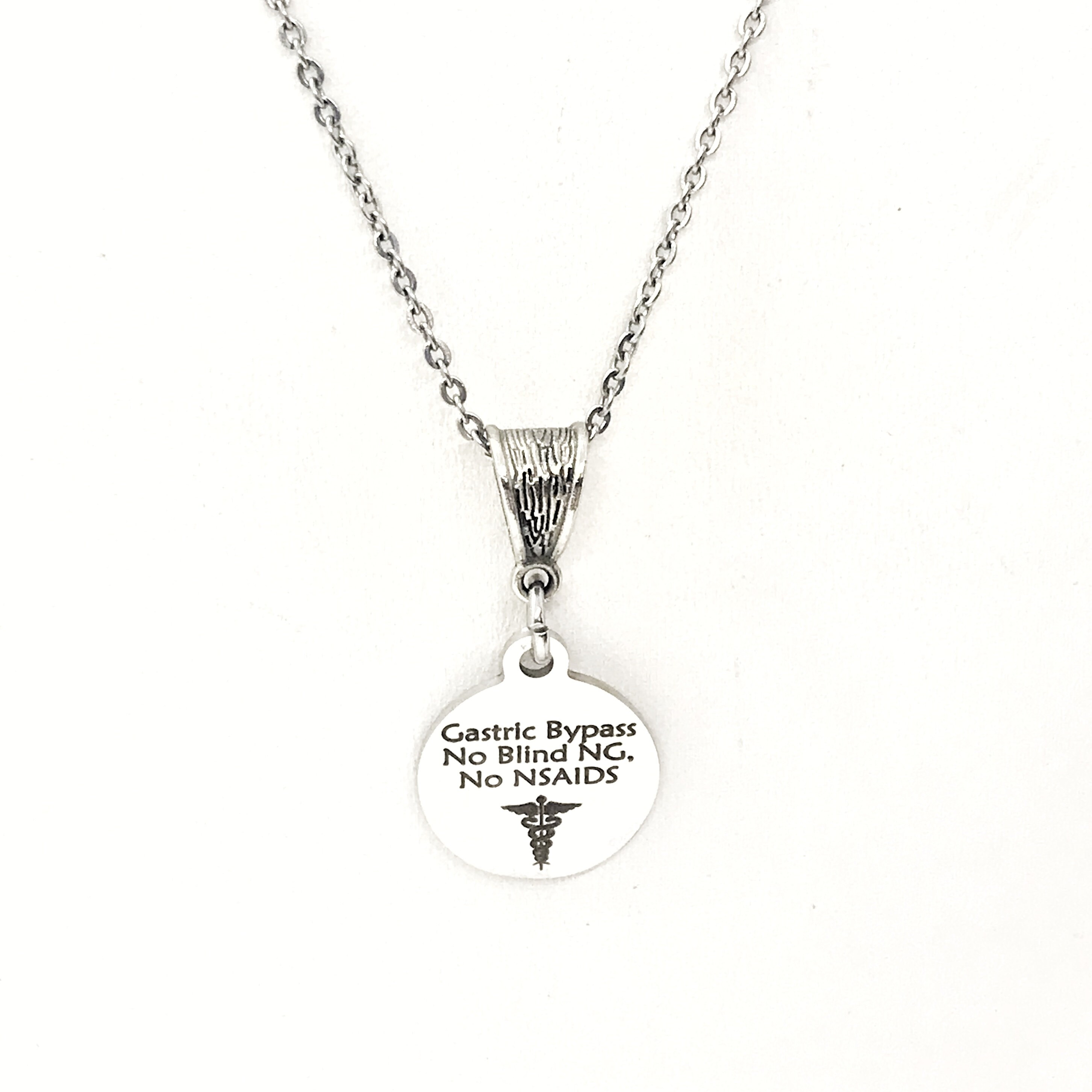 This is a stainless steel laser engraved pendant on a stainless steel chain. The pendant has “Gastric Bypass, No Blind NG, No NSAIDS” and a medical caduceus symbol on it. This pendant is on a silver-tone bale and measures approx. 3/4 inch across is available on your choice of 16, 18, 20, 22, 24, 26, 28 or 30 inch chain. The pendant is also available for individual purchase if you have another chain on which you would like to wear it.