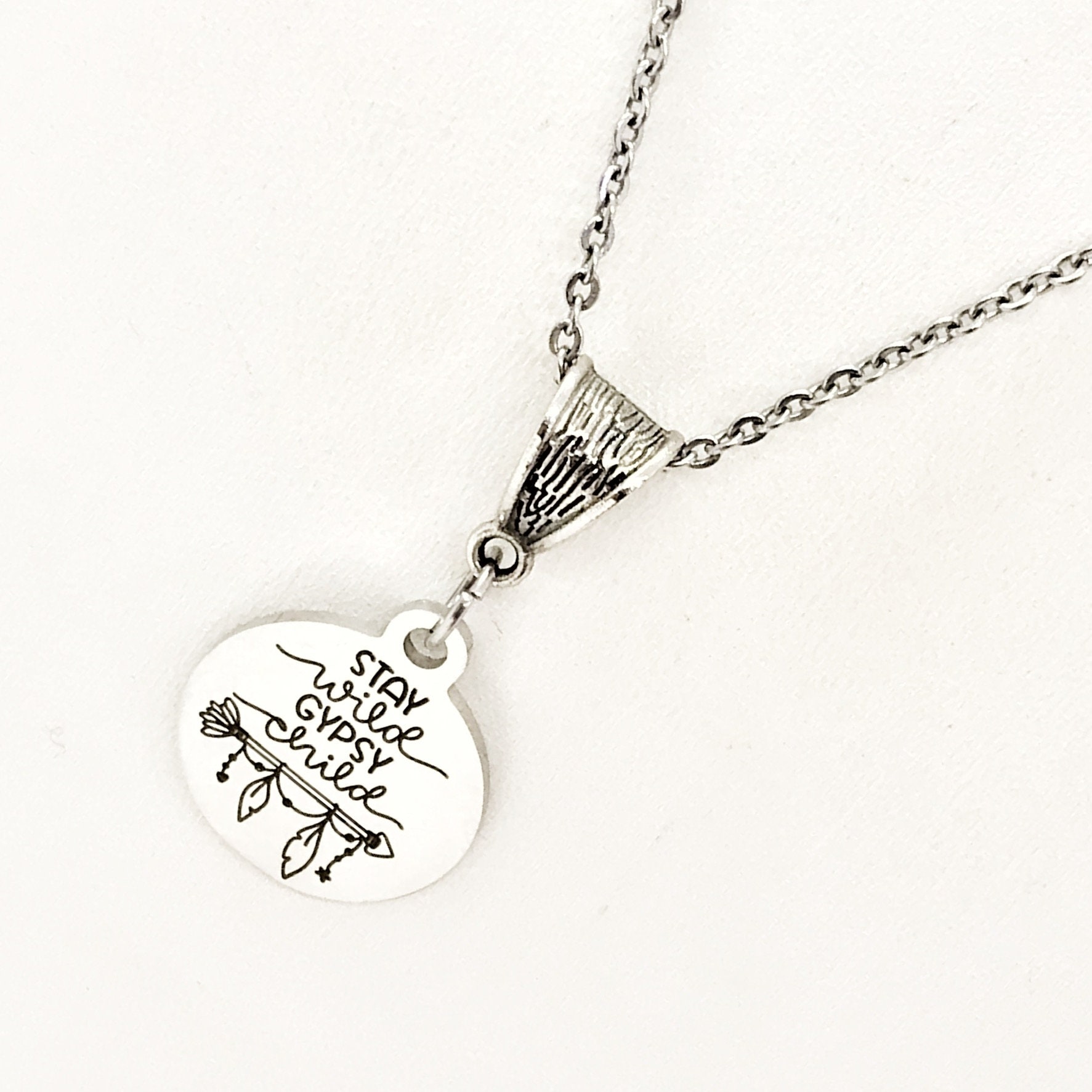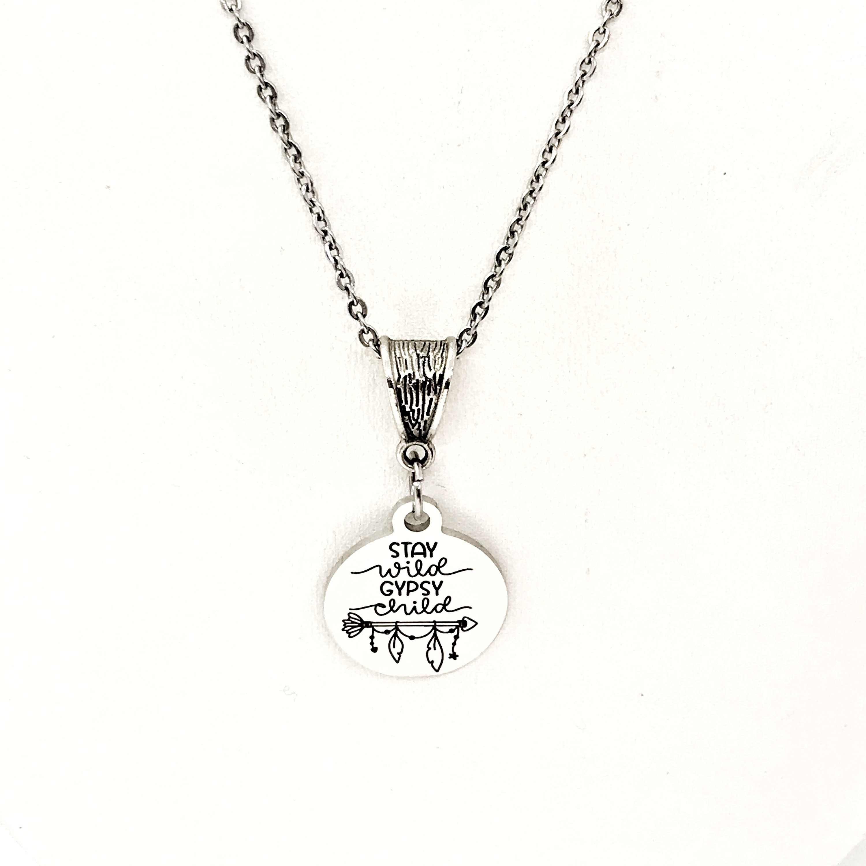The is a beautiful jewelry piece that has a stainless steel laser engraved charm with the following on it “Stay wild Gypsy Child”.