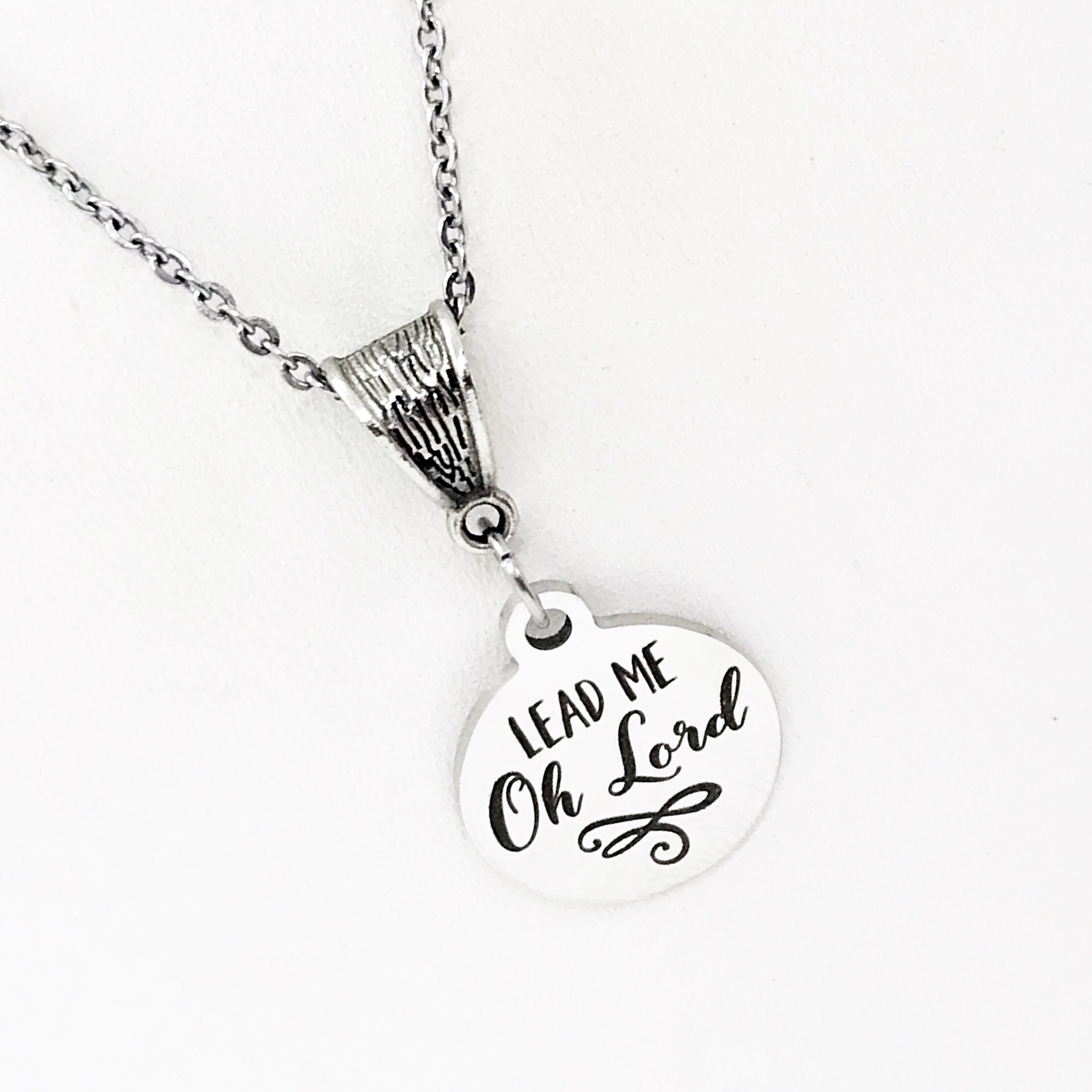The is a beautiful jewelry piece that has a stainless steel laser engraved charm with the following on it “Lead Me, O Lord”