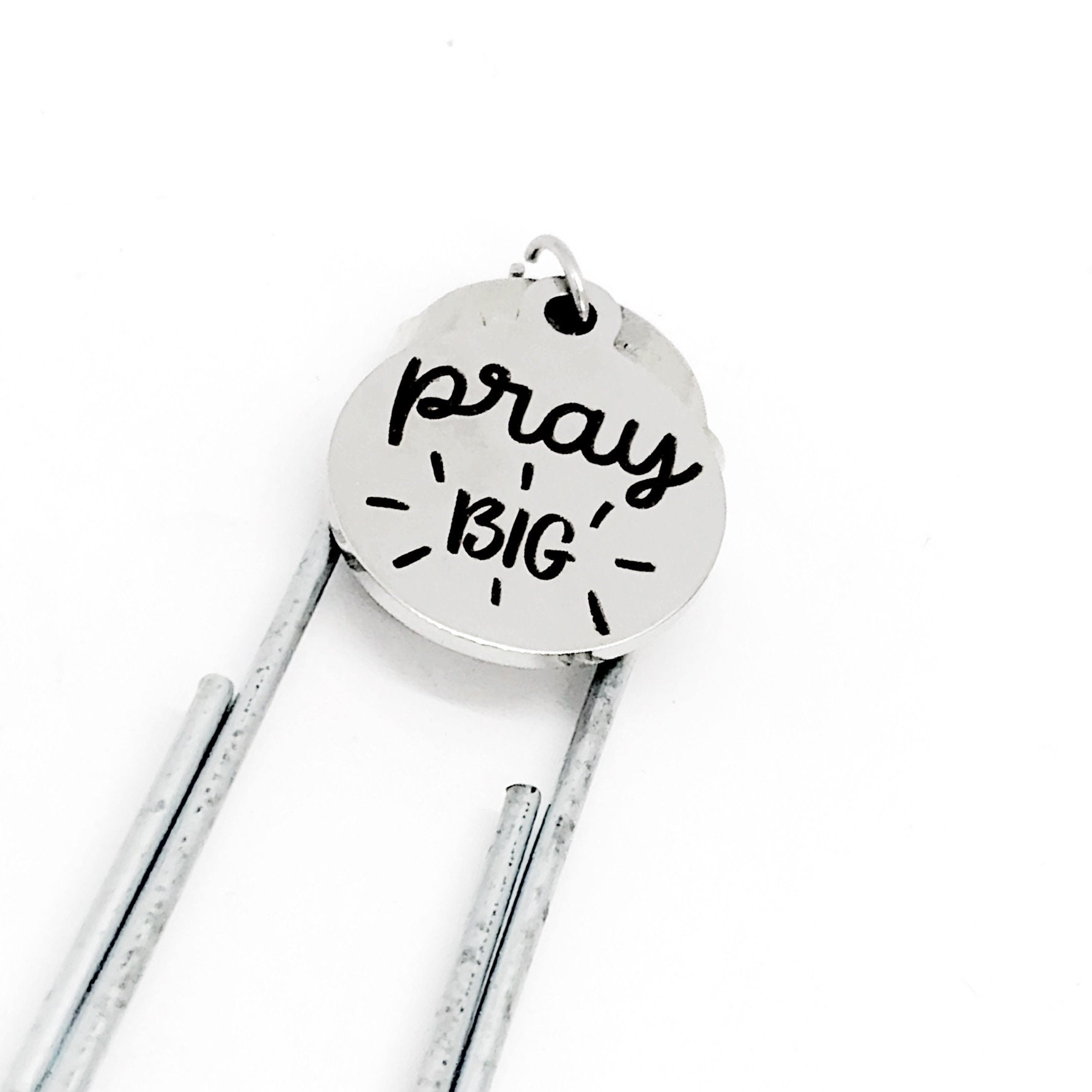 This bookmark has stainless steel laser engraved charm that says, “Pray Big” on it. This charm measures approx. 3/4 inch across.