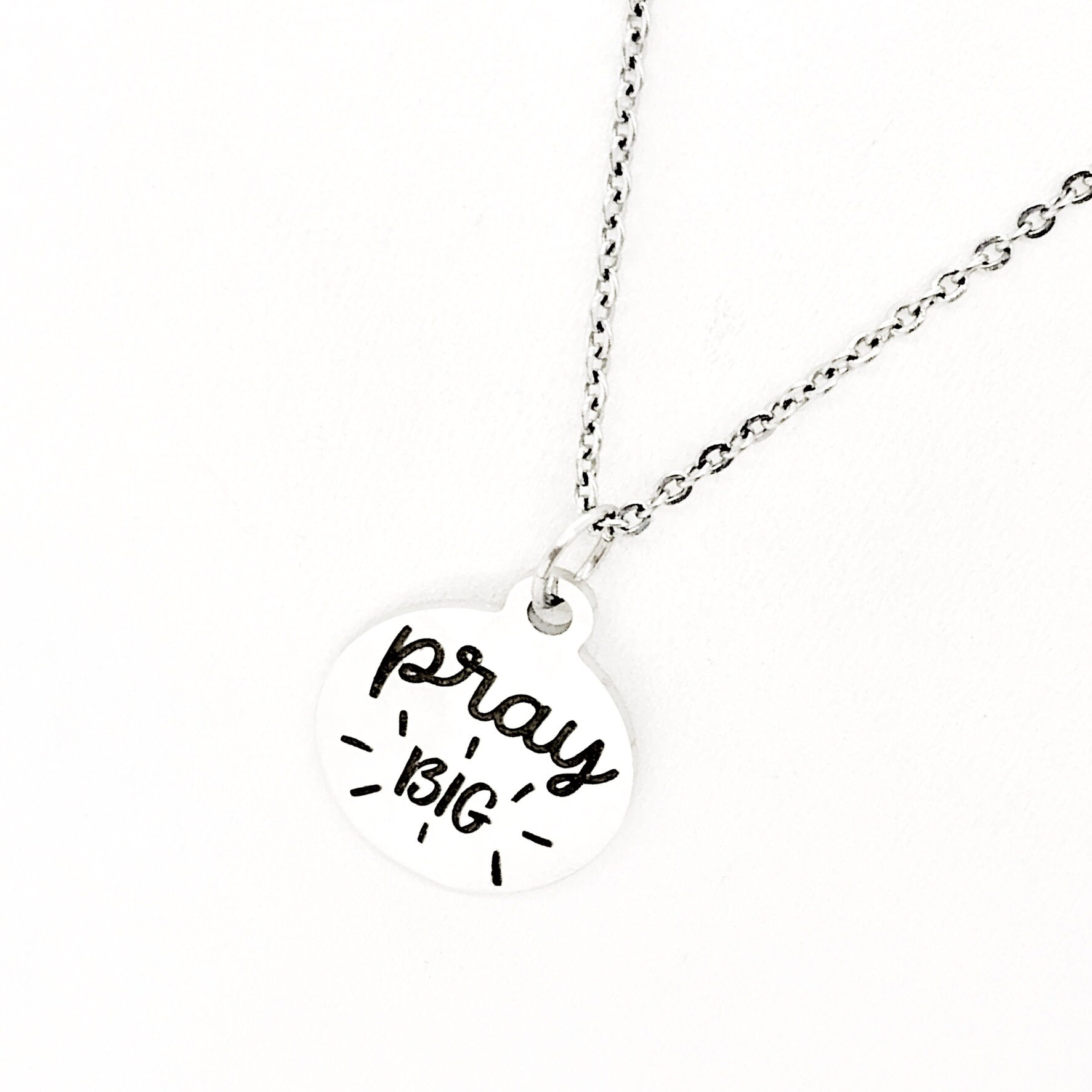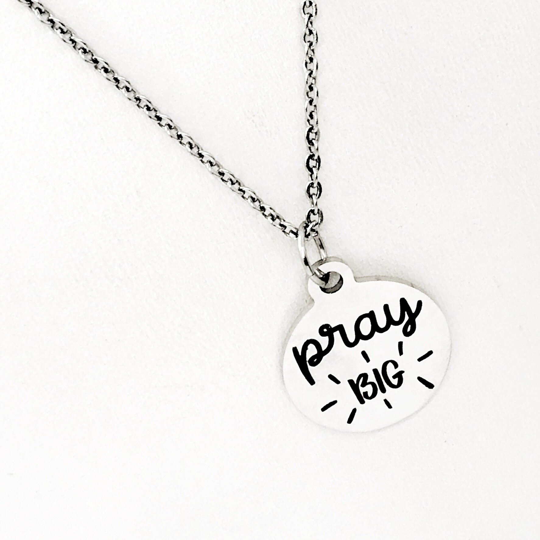 This is a stainless steel laser engraved pendant on a stainless steel chain. The pendant has “Pray Big” on it.