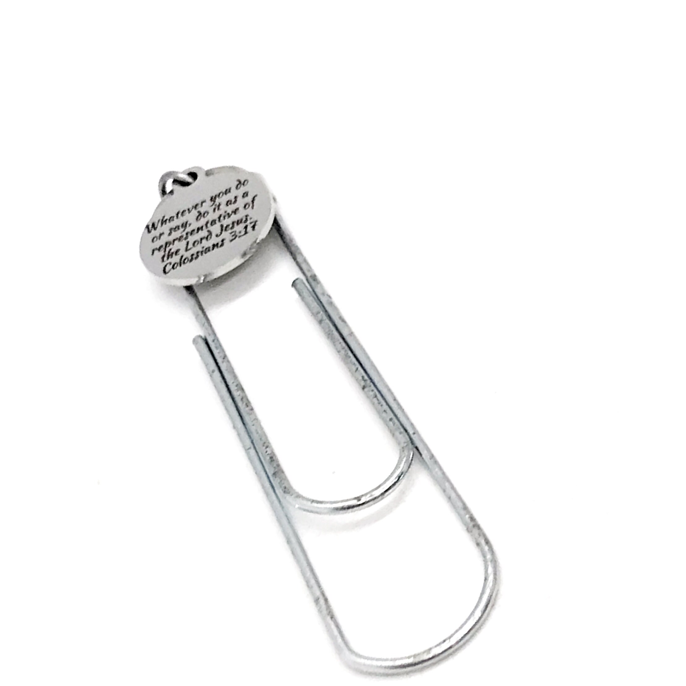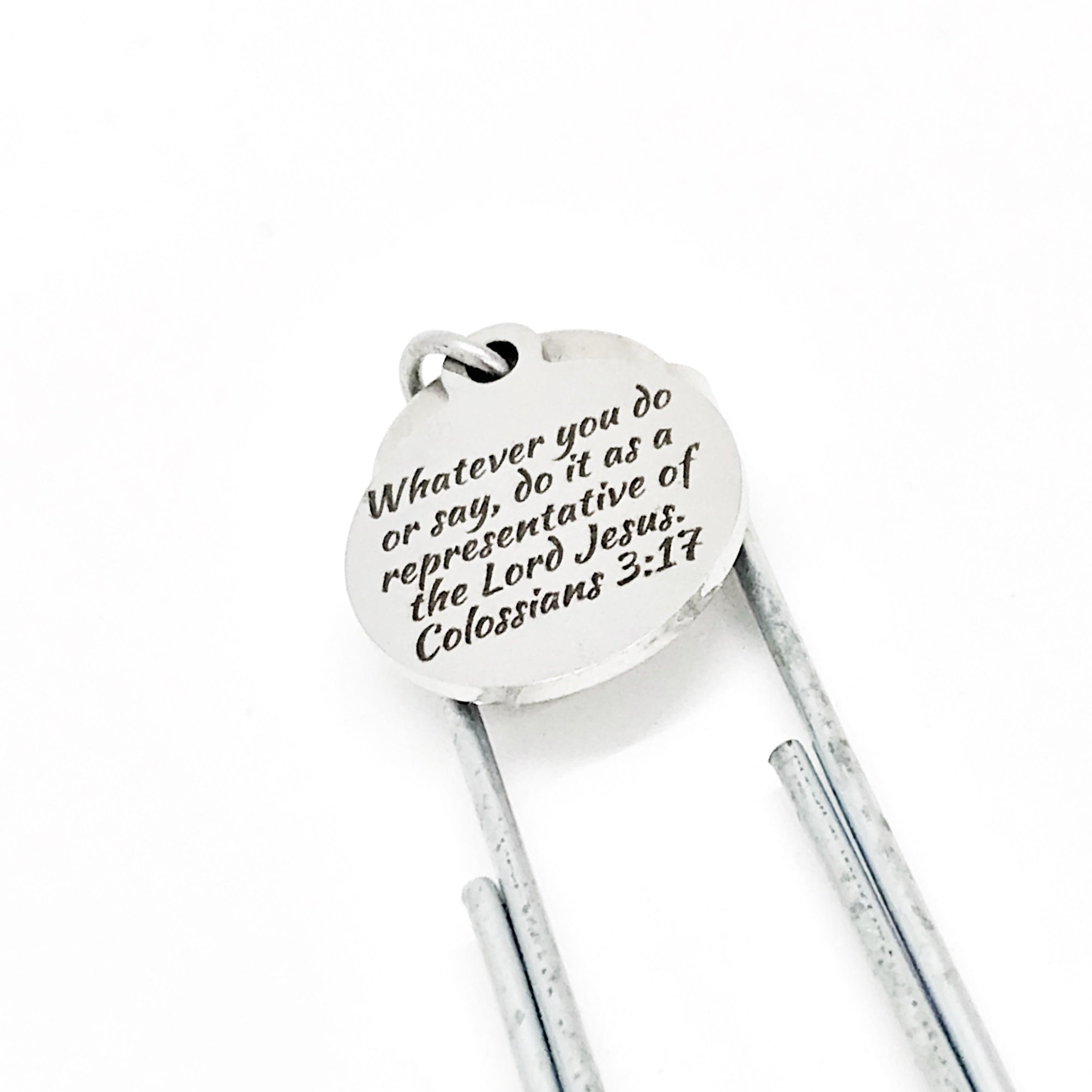 This bookmark has stainless steel laser engraved charm that says, “Whatever you do or say, do it as a representative of the Lord Jesus” from Colossians 3:17 on it. This charm measures approx. 3/4 inch across.