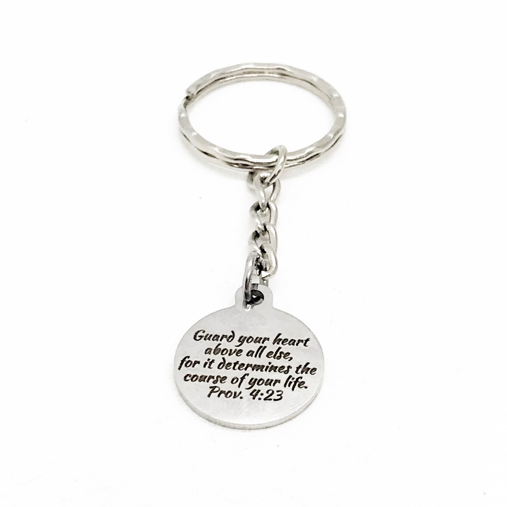 This is a great keychain gift. It has a stainless steel laser engraved charm with “Guard your heart above all else for it determines the course of your life” from Proverbs 4:23 on it.