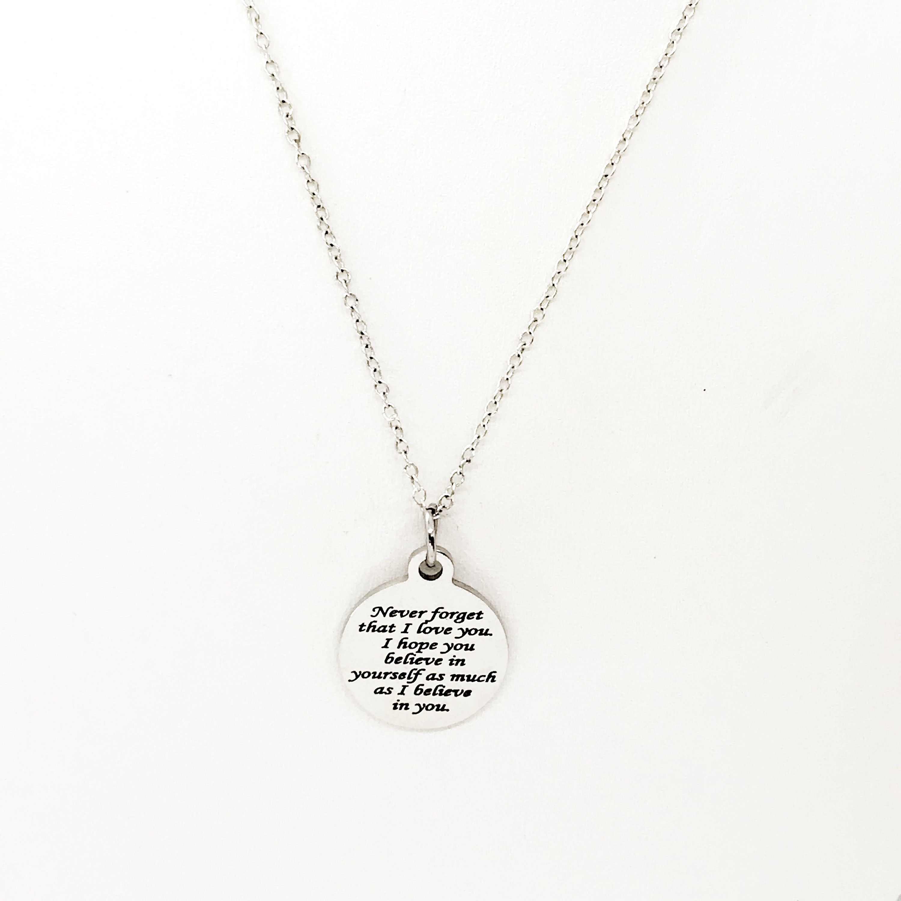 This silver necklace is a simple but beautiful gift for a loved one in your life. It is a stainless steel laser engraved charm on a stainless steel link chain. The charm has the following on it: