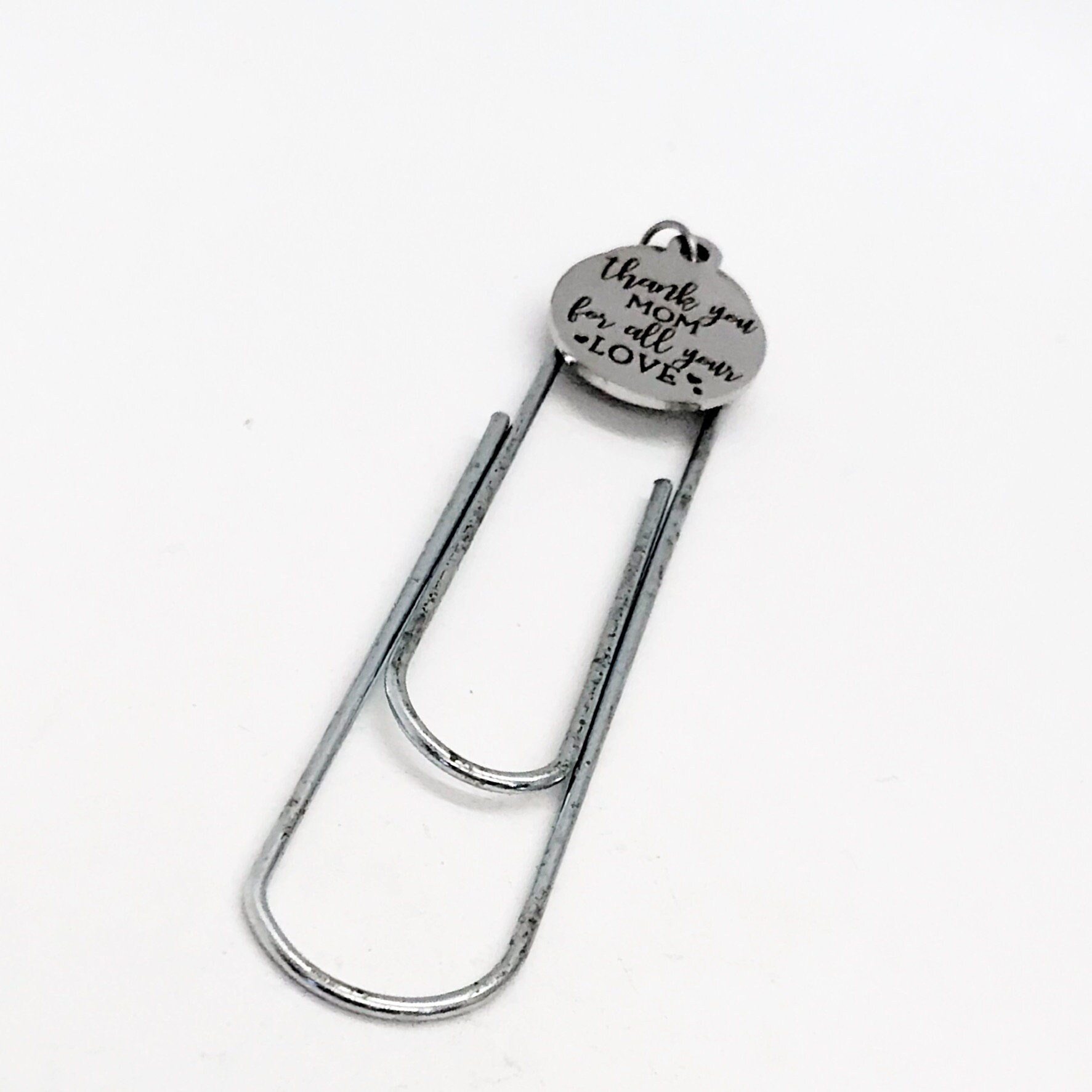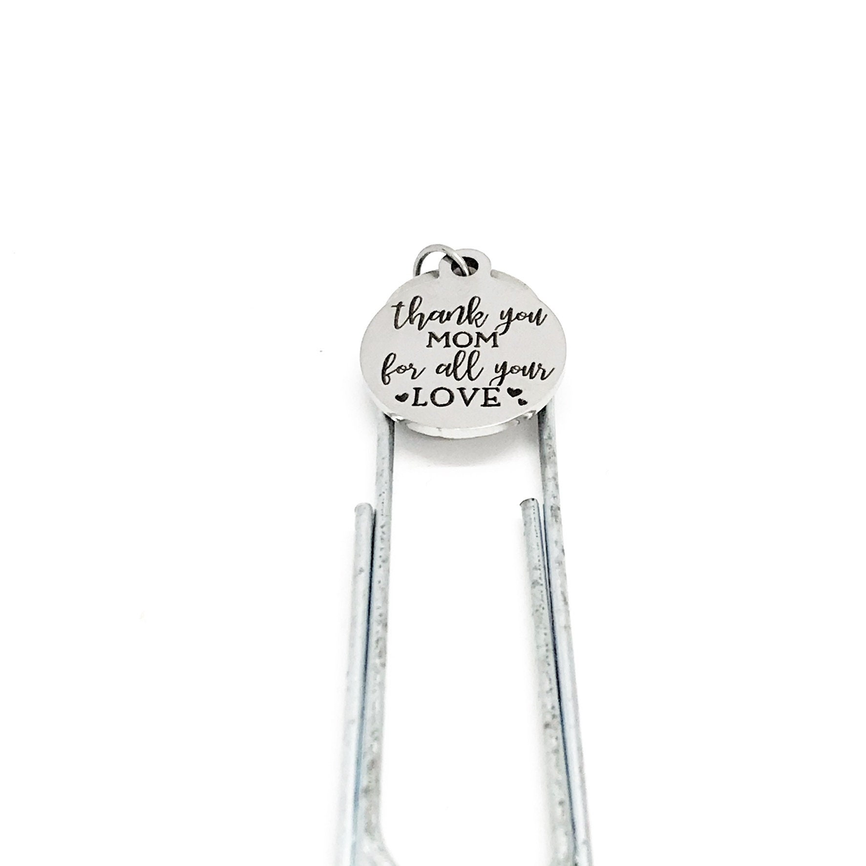 This bookmark has stainless steel laser engraved charm that says, “Thank you Mom for all your love” on it. This charm measures approx. 3/4 inch across.