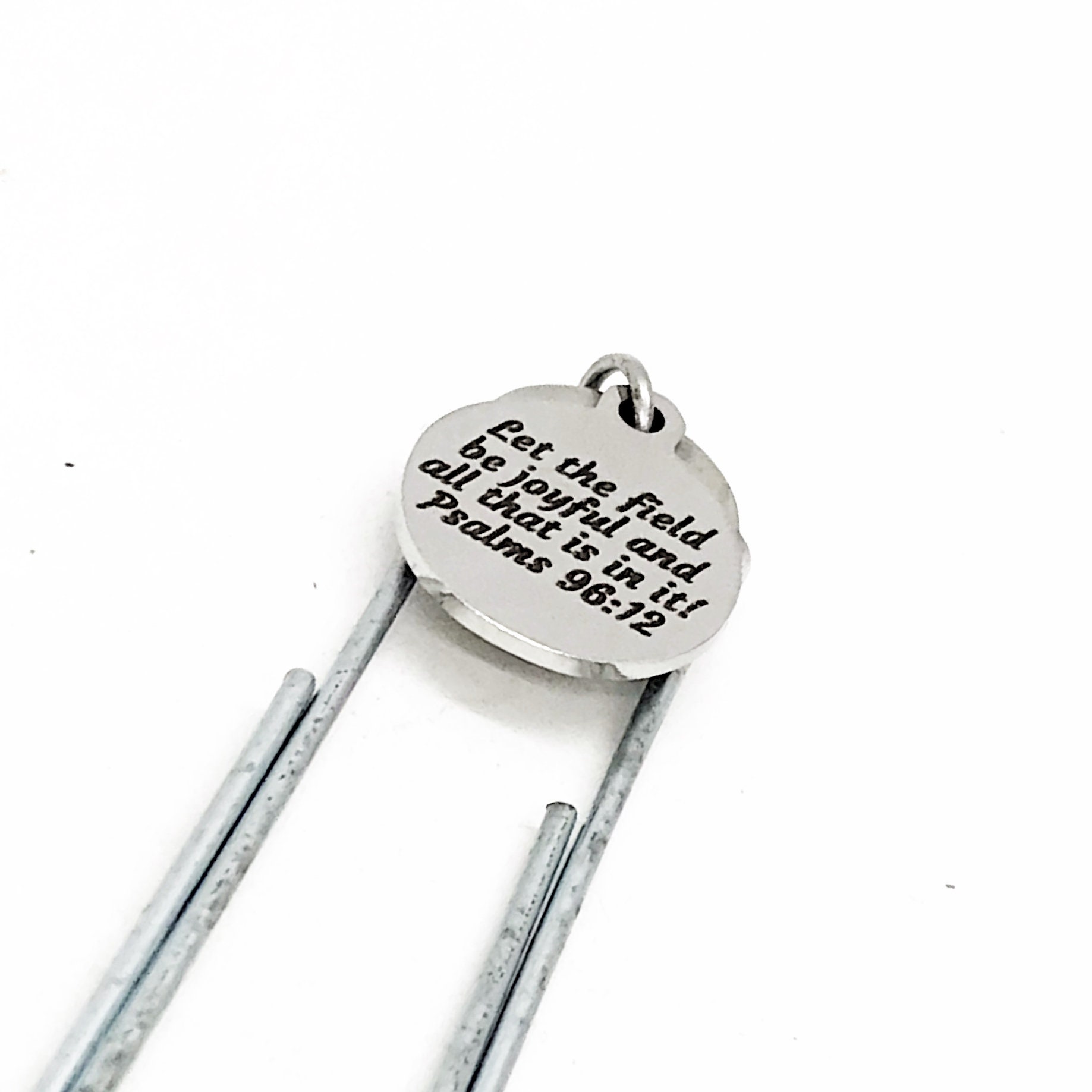 This bookmark has stainless steel laser engraved charm that says, “Let the field be joyful and all that is in it” from Psalm 96:12 on it. This charm measures approx. 3/4 inch across.