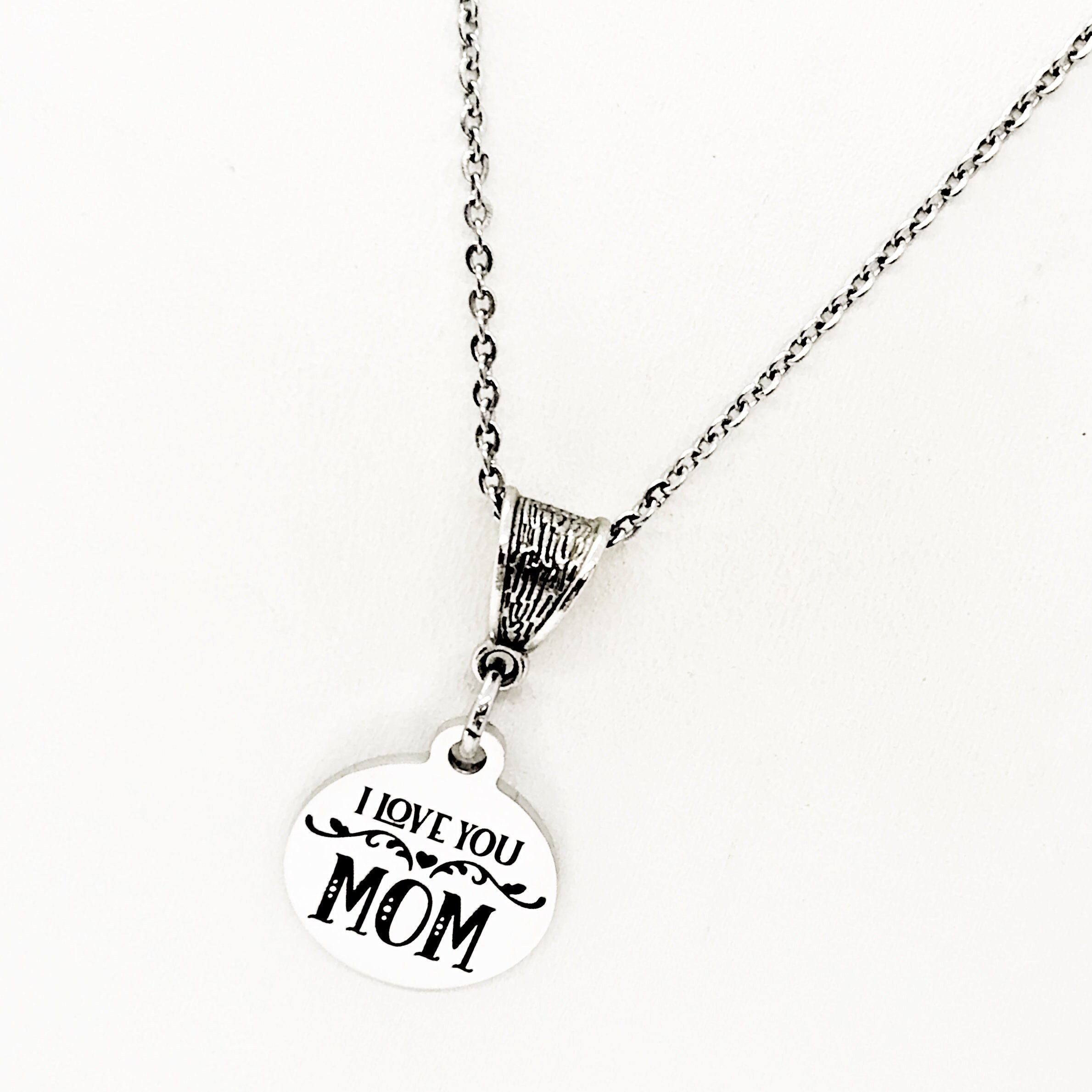 This necklace is a simple but beautiful gift for a loved one in your life. It is a stainless steel laser engraved charm on a stainless steel link chain with a silver-tone bale. The charm has “I love you Mom” on it.