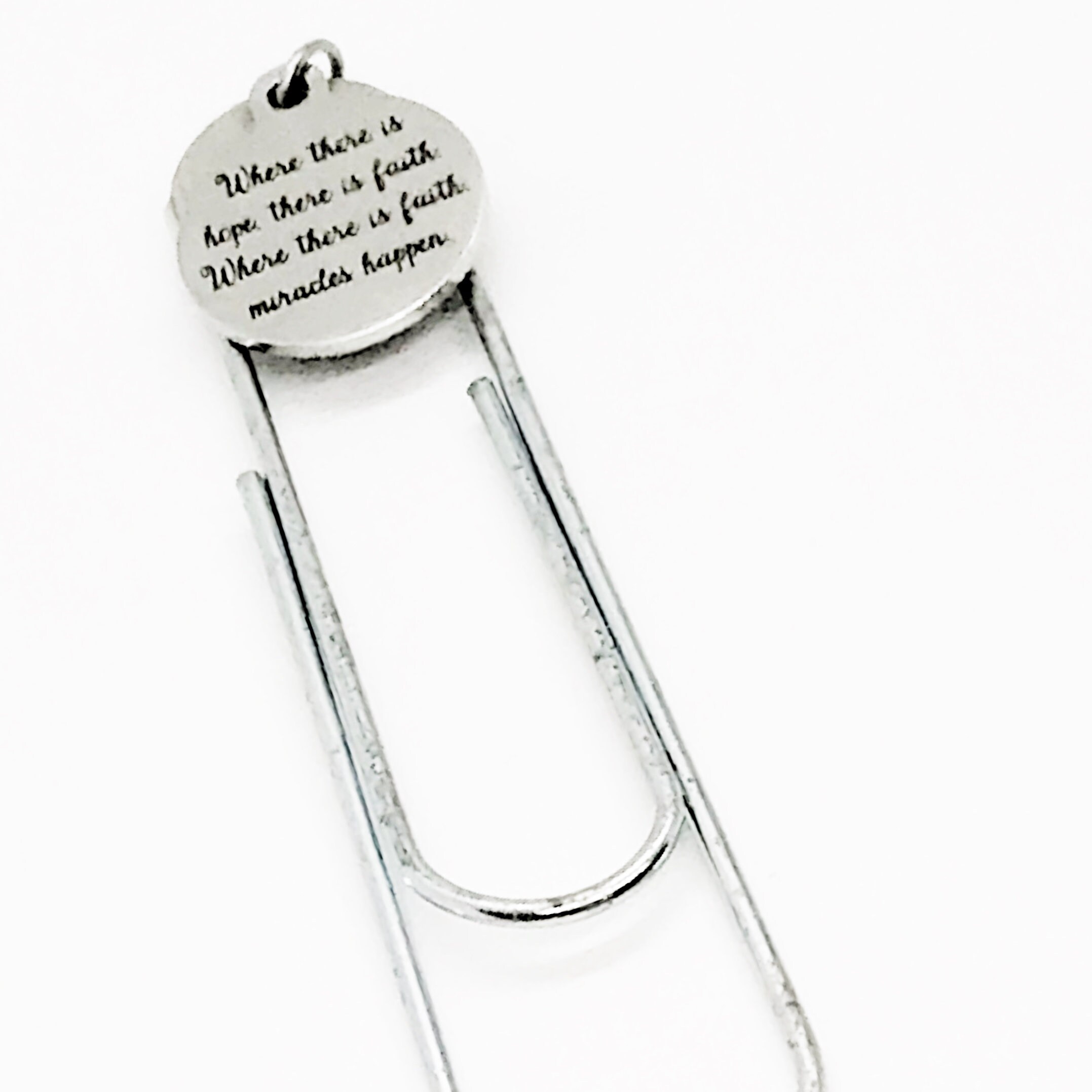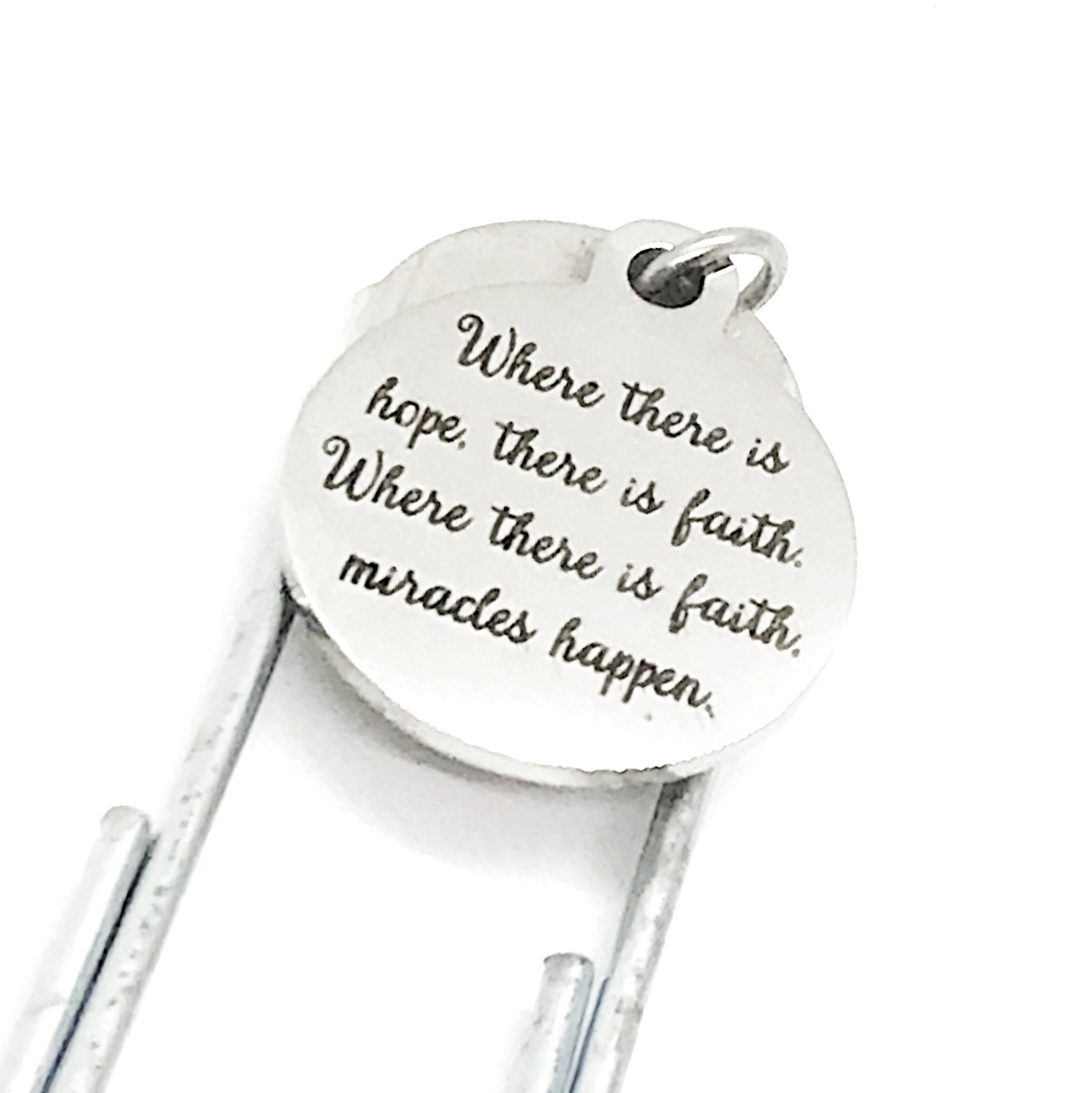 This bookmark has stainless steel laser engraved charm that says, “Where there is hope, there is faith. Where there is faith, miracles happen” on it. This charm measures approx. 3/4 inch across. Please note that due to the amount of text on this charm, the font size is small. It is intended to be a reminder to the user.