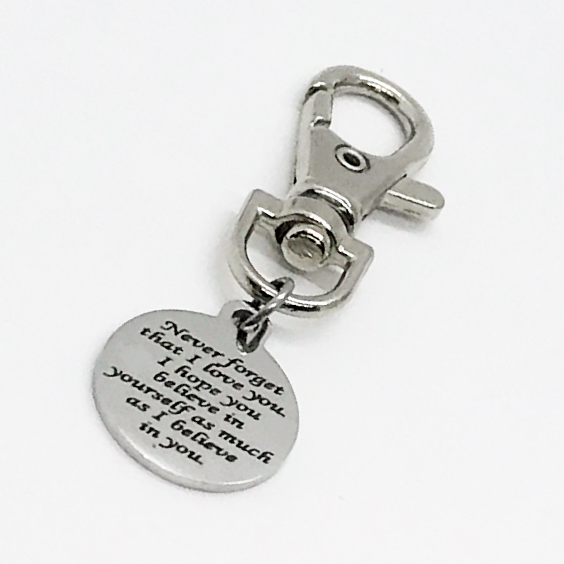 This is a great zipper pull or bag charm clip gift that would be a perfect gift someone you love. It would be a great charm to clip onto a tote, purse, sports bag, book bag or keychain. It has a stainless steel laser engraved charm with “Never forget that I love you. I hope you believe in yourself as much as I believe in you.” on it. The charm measures approx. 3/4 inch across.
