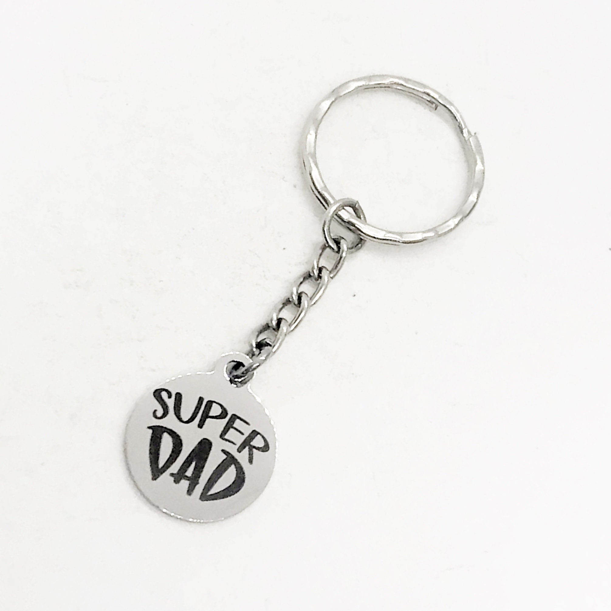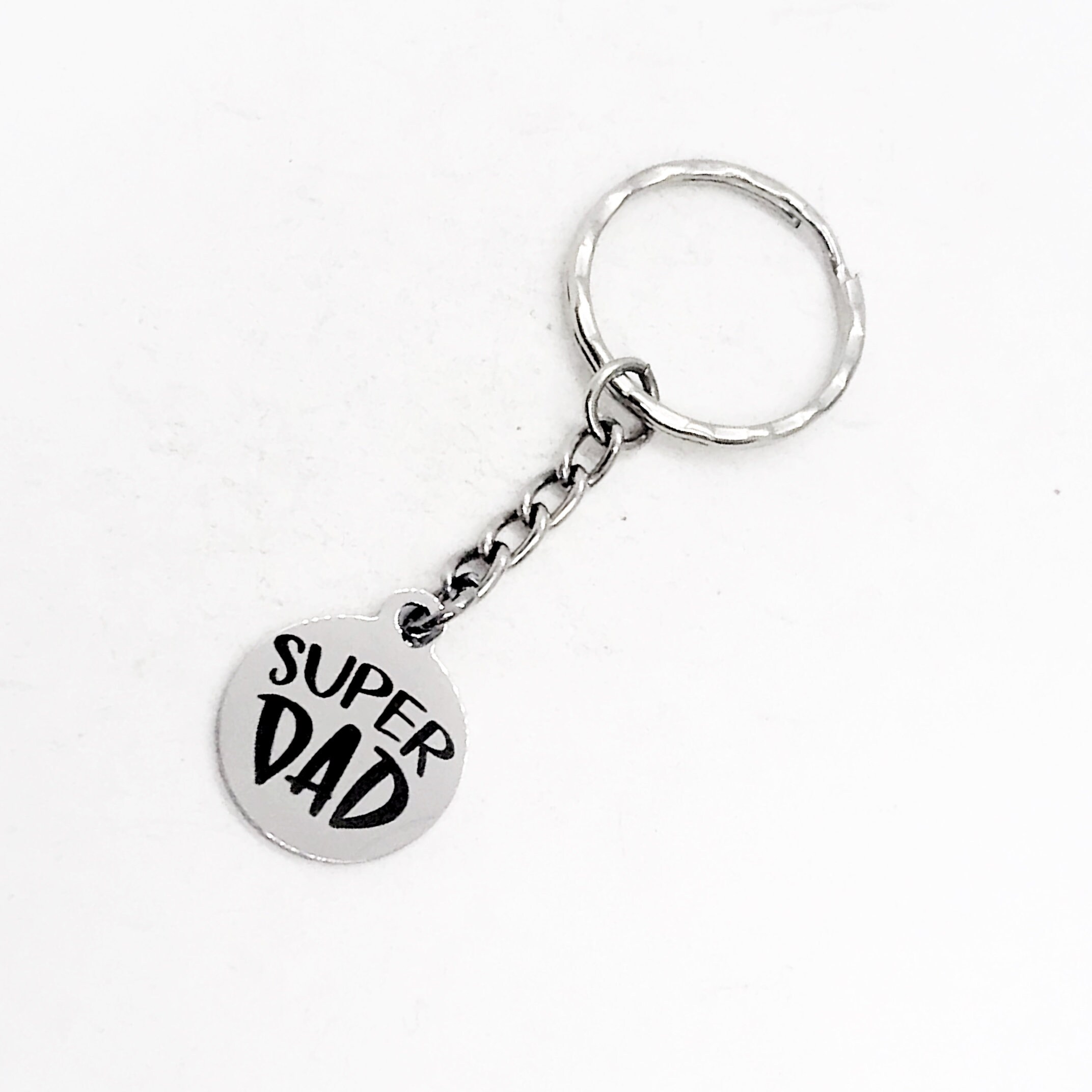 This is a great gift for Dad! It has a stainless steel laser engraved charm with “Super Dad" on it. The charm measures approx. 3/4 inch.