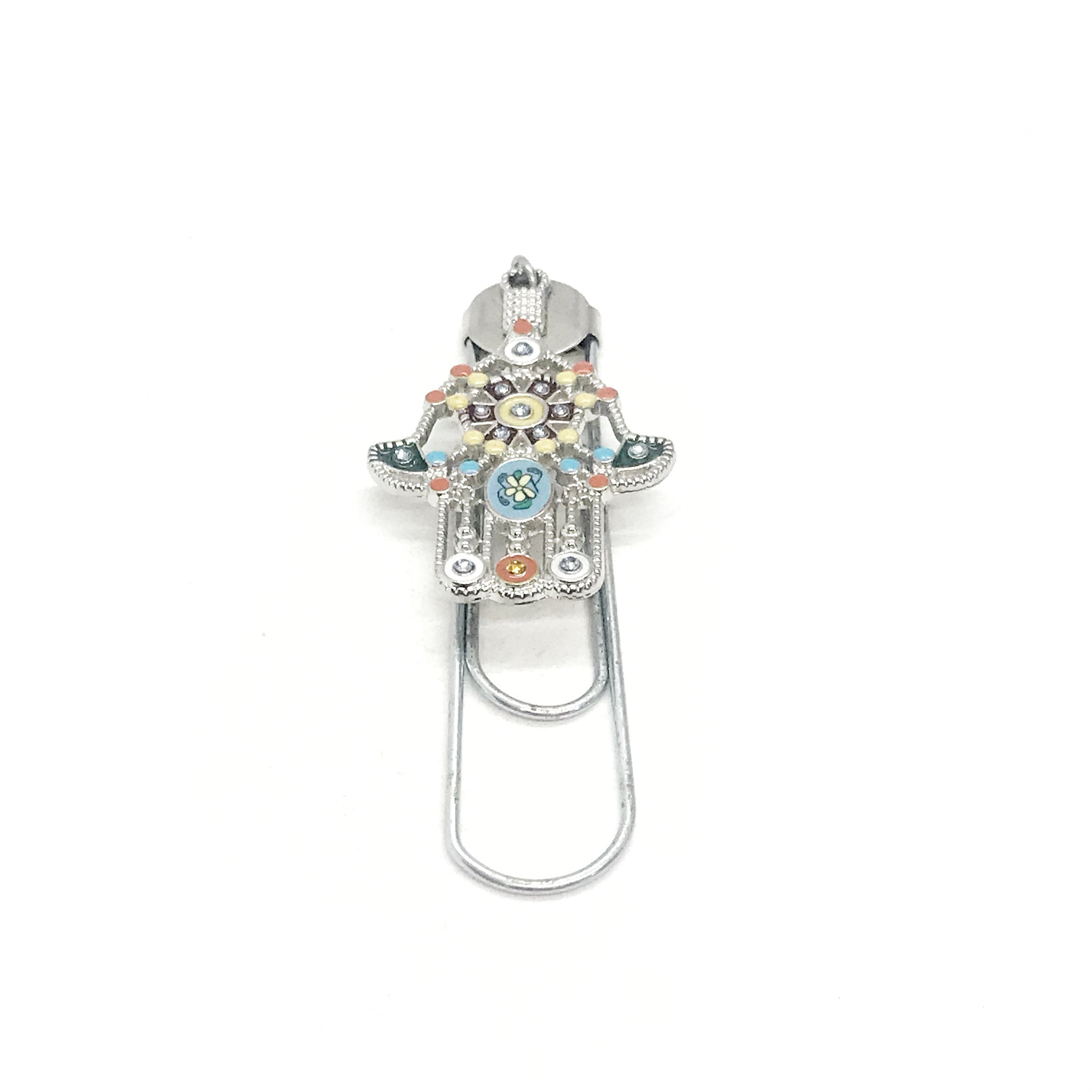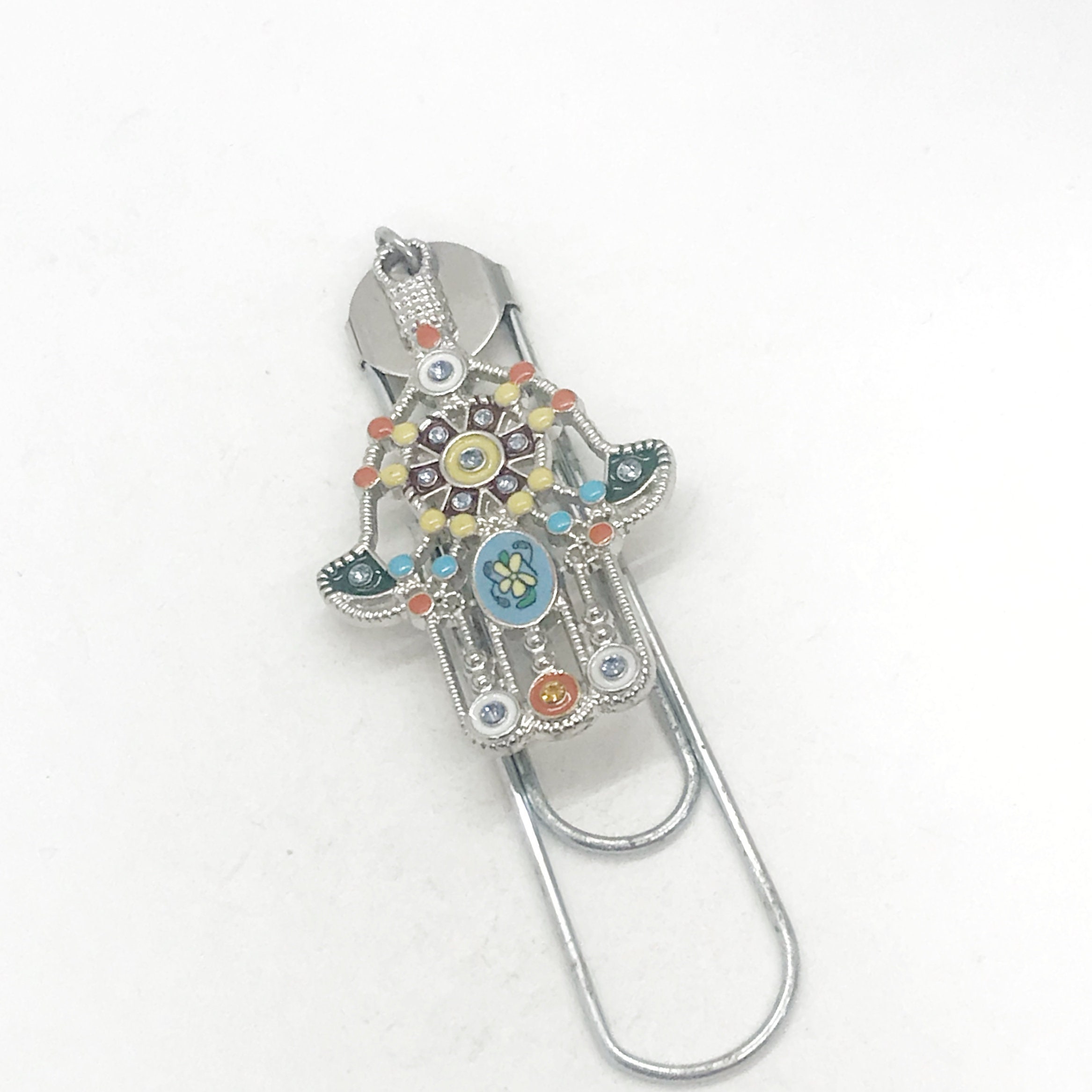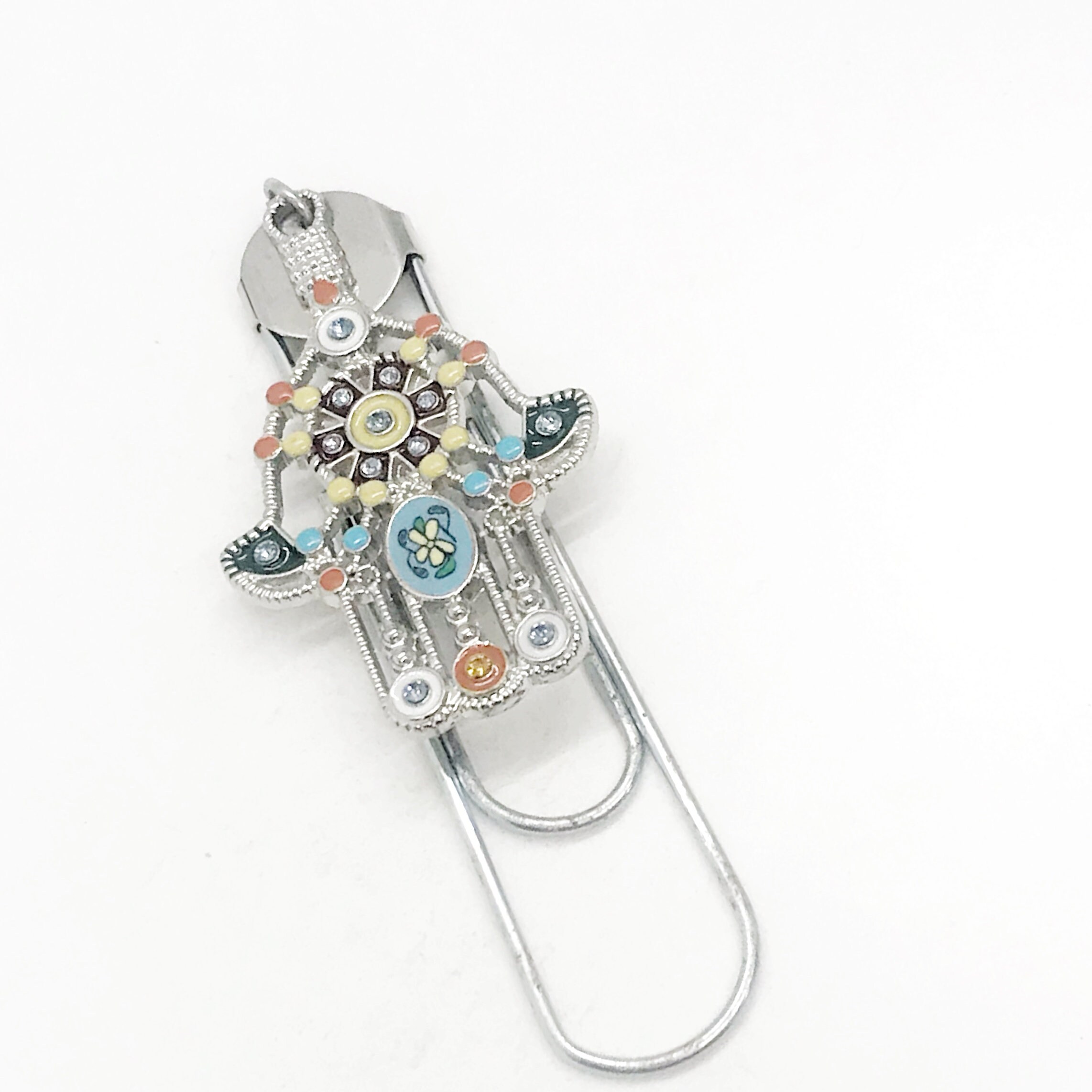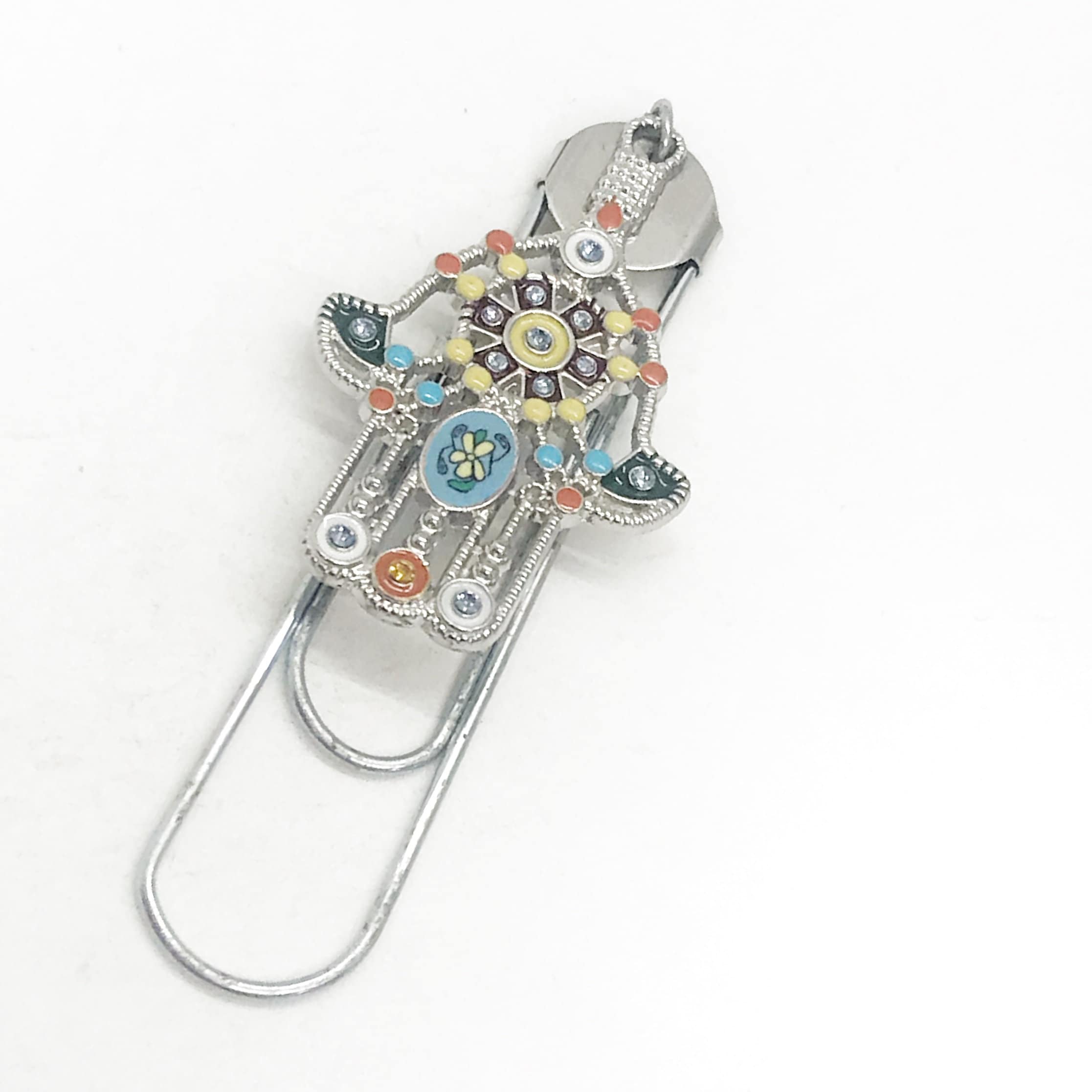 This is a beautiful Hamsa charm bookmark. The hamsa or hand of Fatima is a protective symbol that is worn to bring protection or good luck to the owner. This one has beautiful colors on it. The Hamsa measures approx. 2.25 Inches long by approx. 1.5 Inches across (58mm x 37mm).