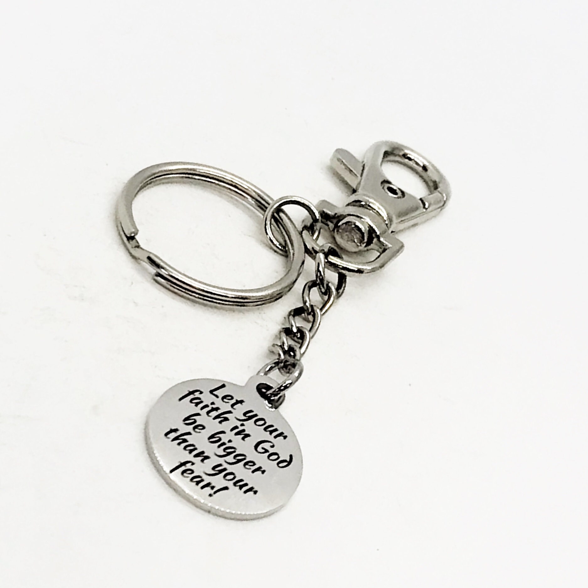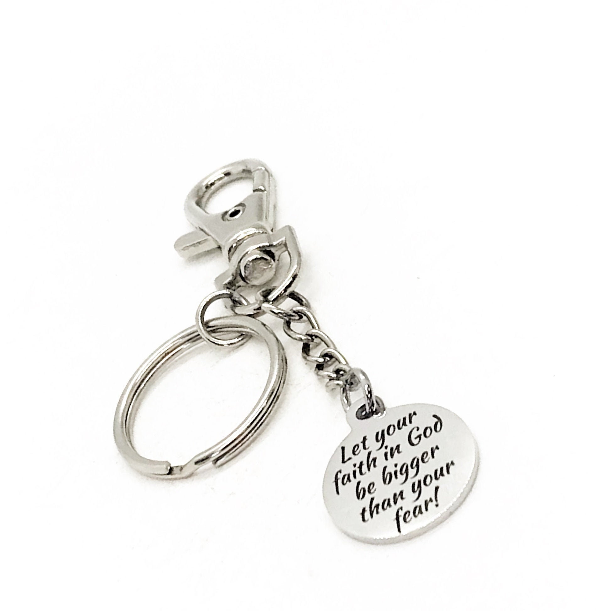 This is a great keychain gift of faith. It has a stainless steel laser engraved charm that has “Let your faith in God be bigger than your fear” on it. The charm measures approx. 3/4 inch across.