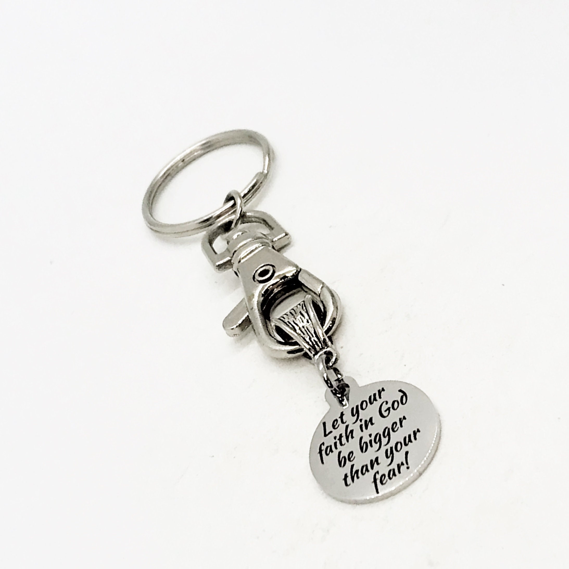 This keychain gift has a stainless steel laser engraved charm with “Let your faith in God be bigger than your fear” on it. The charm measures approx. 3/4 inch across.