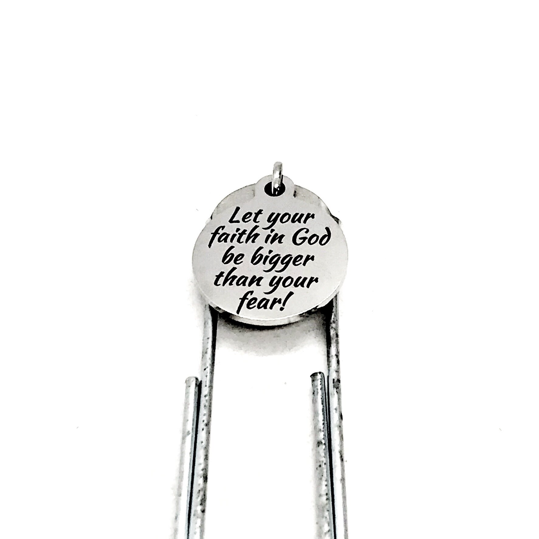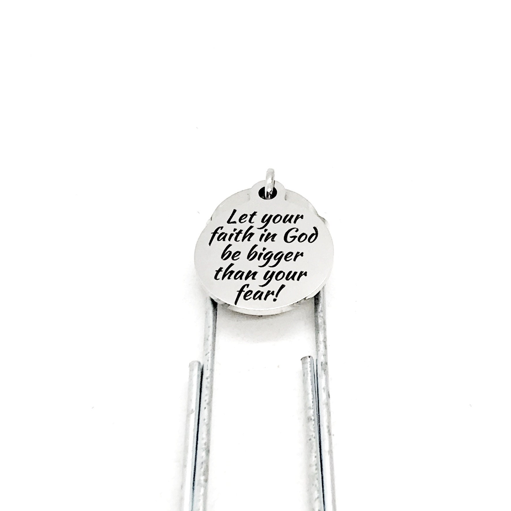 This bookmark has stainless steel laser engraved charm that says, “Let your faith in God be bigger than your fear” on it. This charm measures approx. 3/4 inch across.