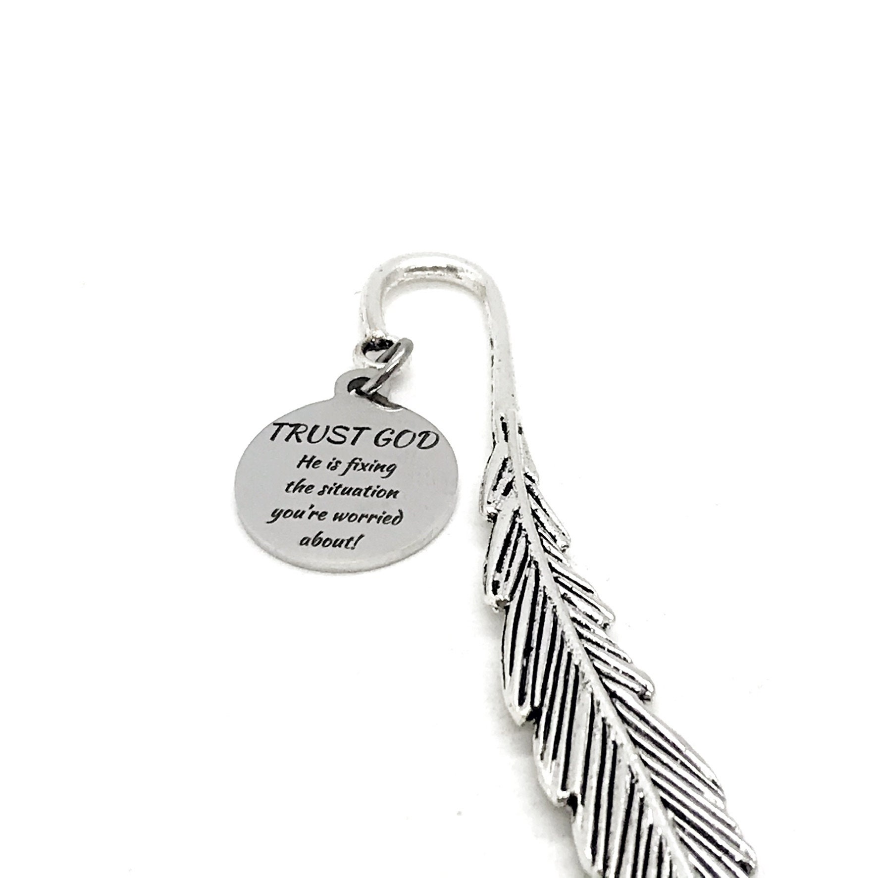 This bookmark would be a great encouraging Christian planner gift bookmark or reader gift. It has a stainless steel engraved charm with “Trust God - He is fixing the situation you’re worried about!” on it. This charm measures approx. 3/4 inch across. Please note that due to the amount of text on this charm, the font is small. It is intended to be a reminder to the user.